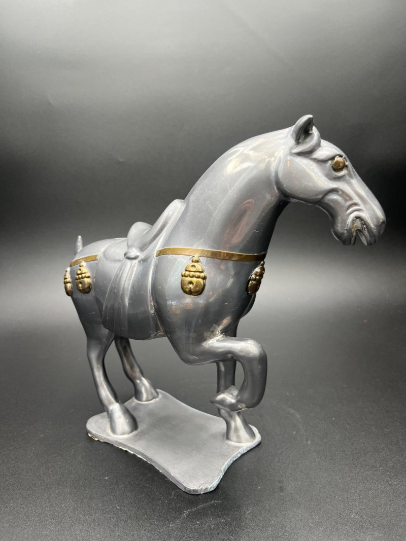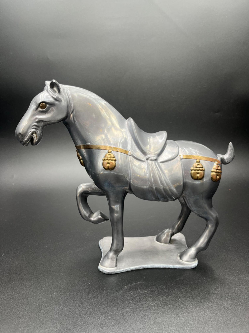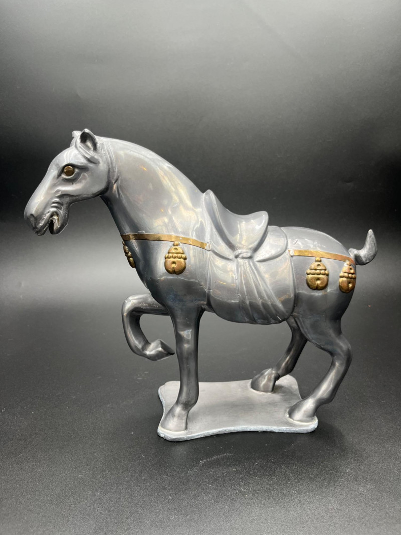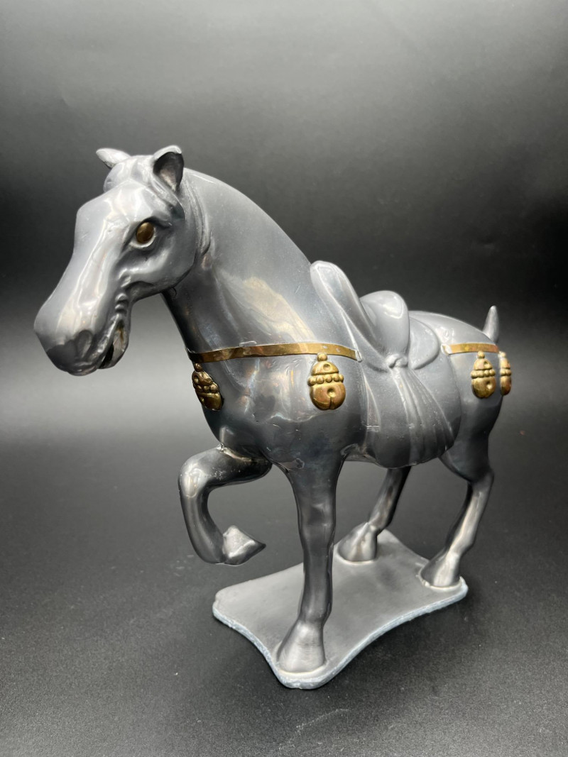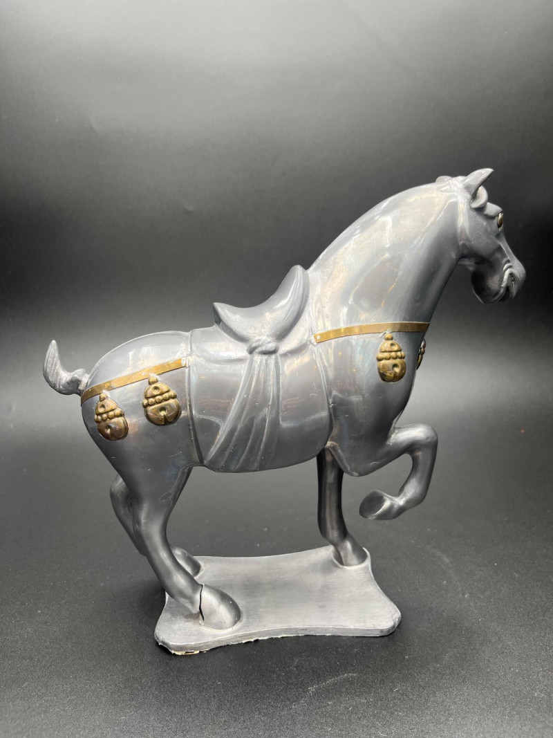 Vintage Tang Style Decorative Horse Sculpture with Brass Accents A vintage sculpted horse figure in the style of Chinese Tang dynasty representations, shown with one raised leg and detailed tack. The form includes applied brass elements and a metallic finish. The underside is felt-lined and retains original retail and catalog stickers with item code and description. Dimensions: 10"H x 11"W