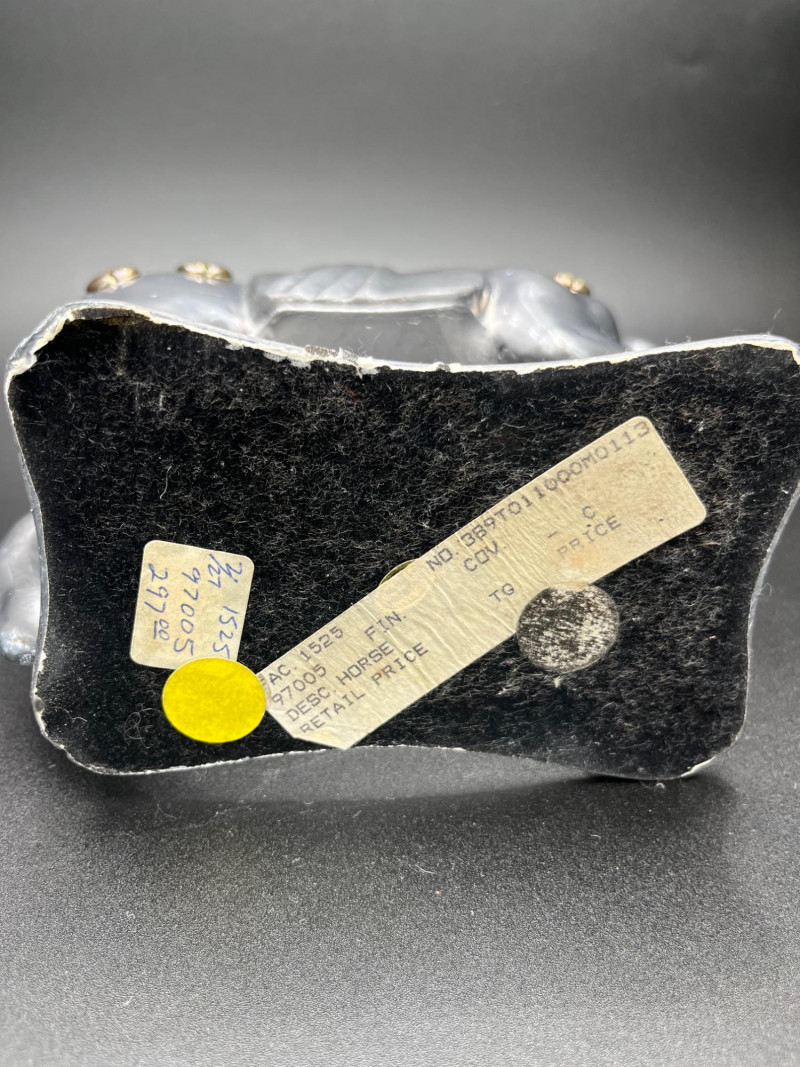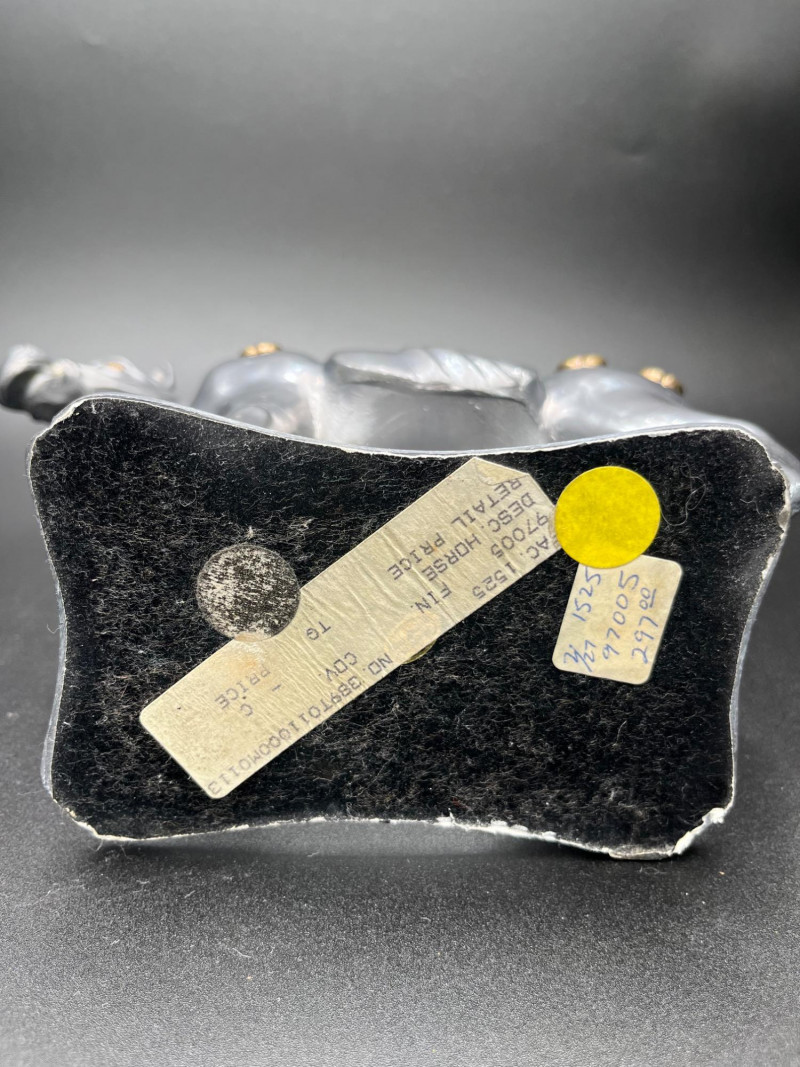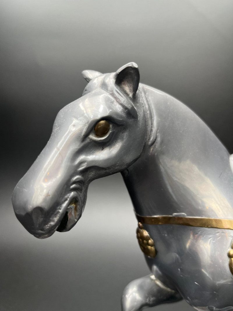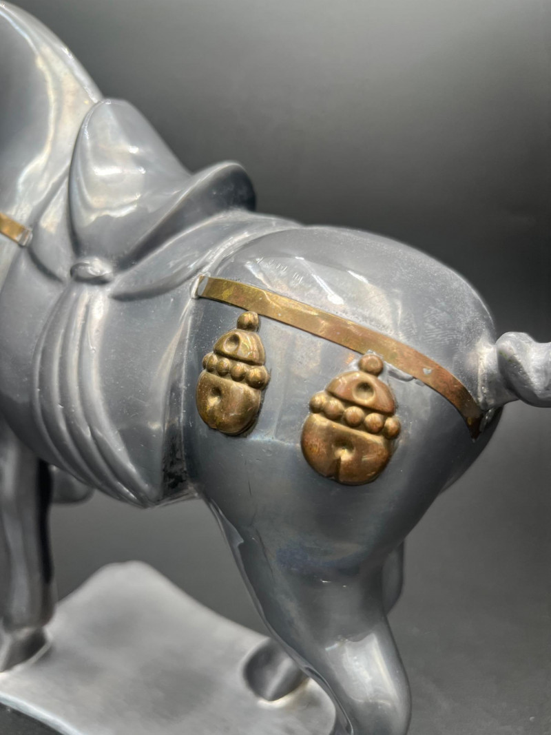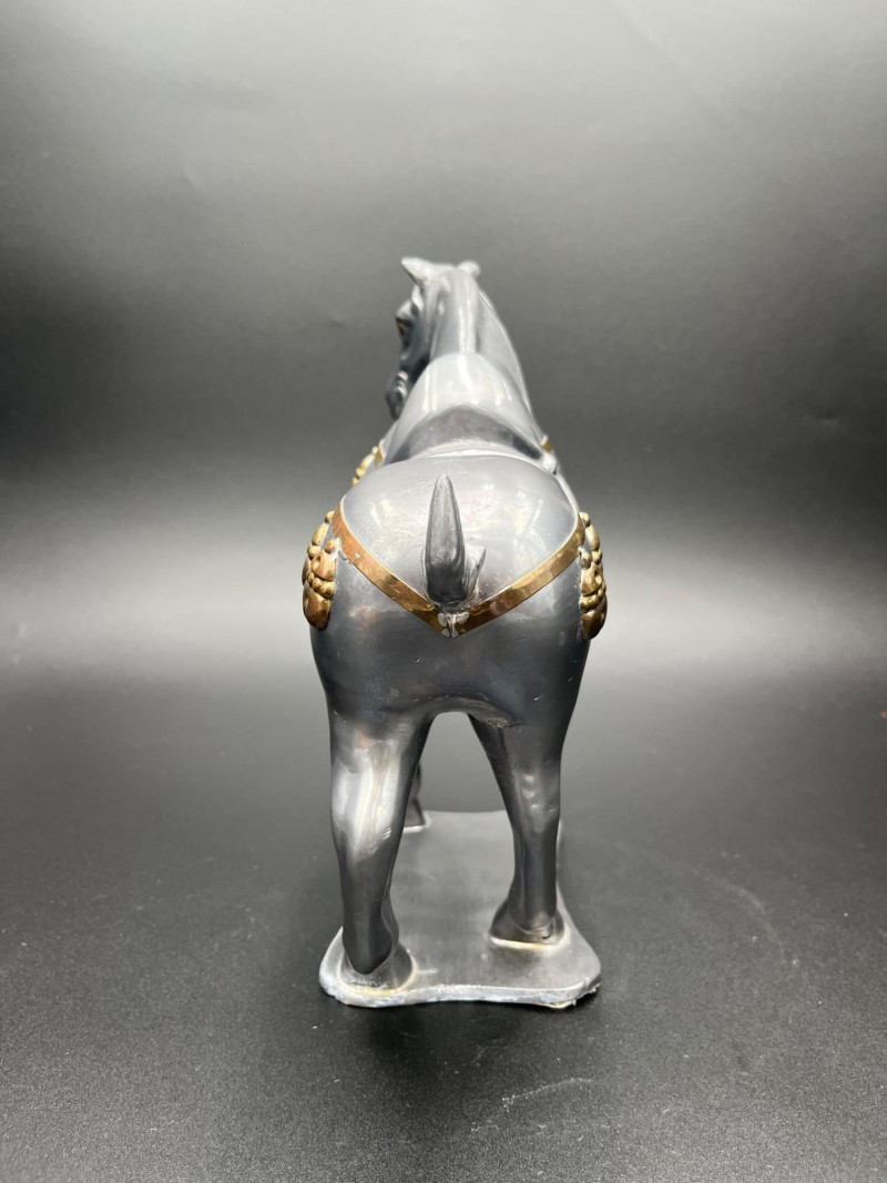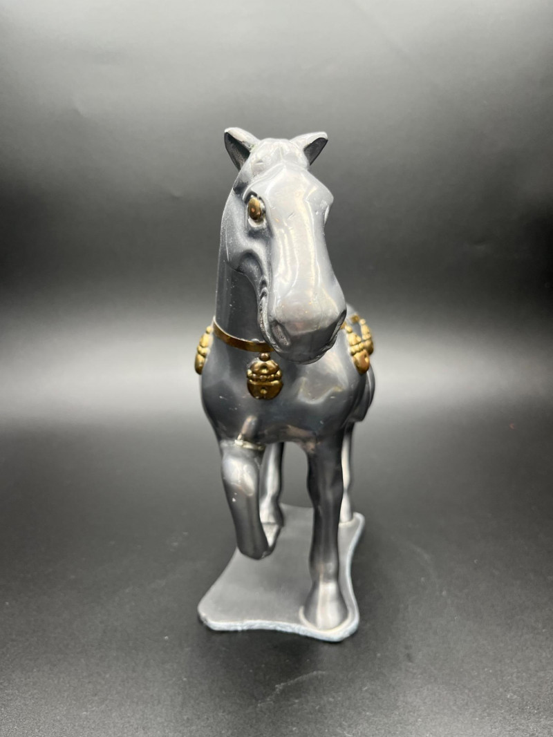 Vintage Tang Style Decorative Horse Sculpture with Brass Accents A vintage sculpted horse figure in the style of Chinese Tang dynasty representations, shown with one raised leg and detailed tack. The form includes applied brass elements and a metallic finish. The underside is felt-lined and retains original retail and catalog stickers with item code and description. Dimensions: 10"H x 11"W