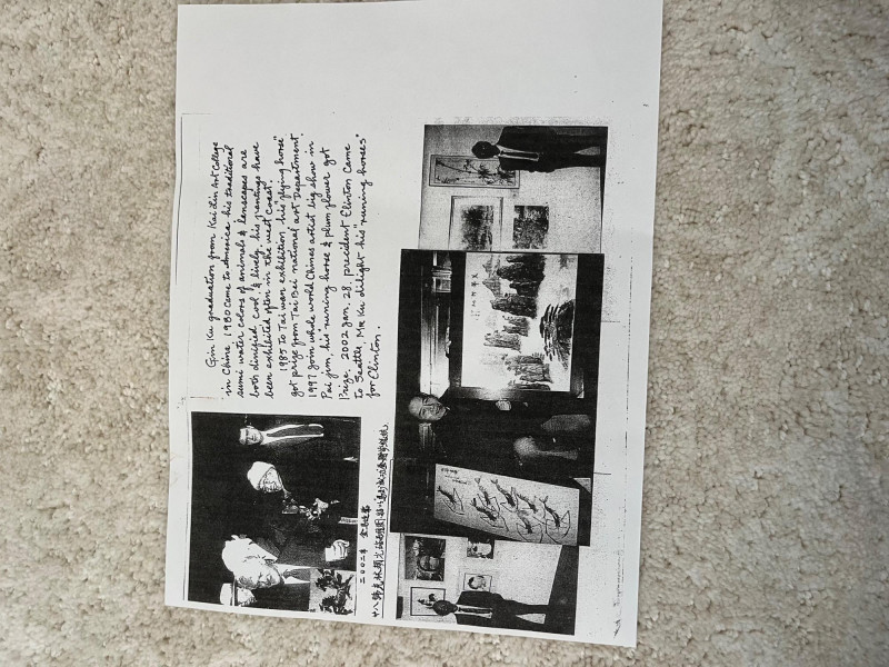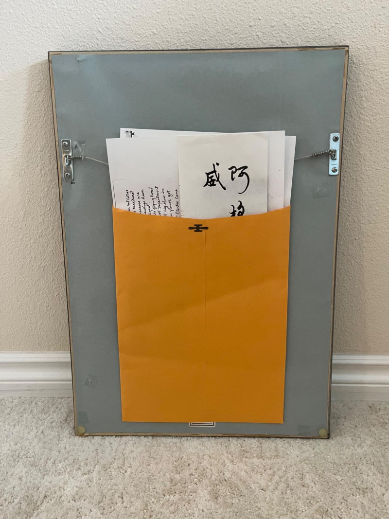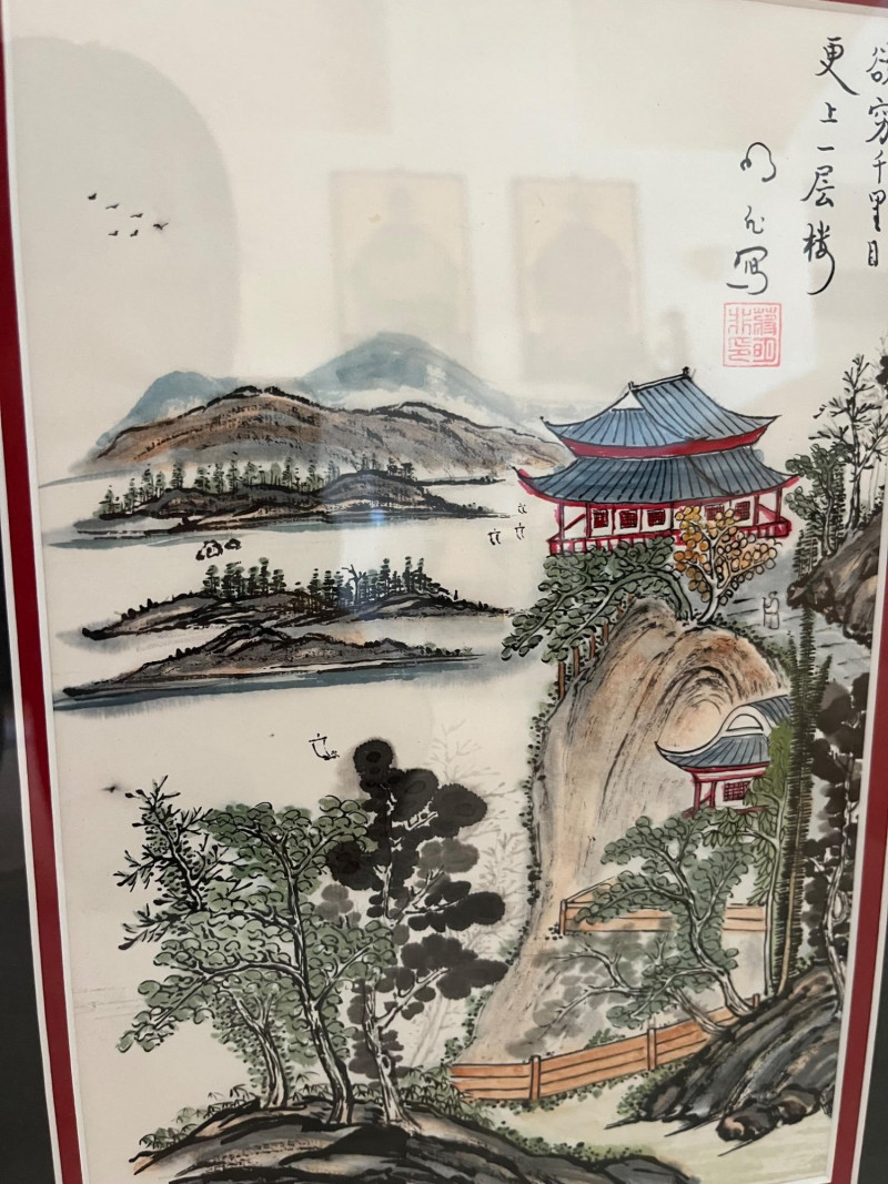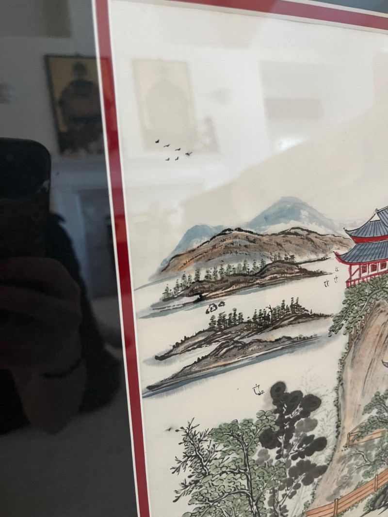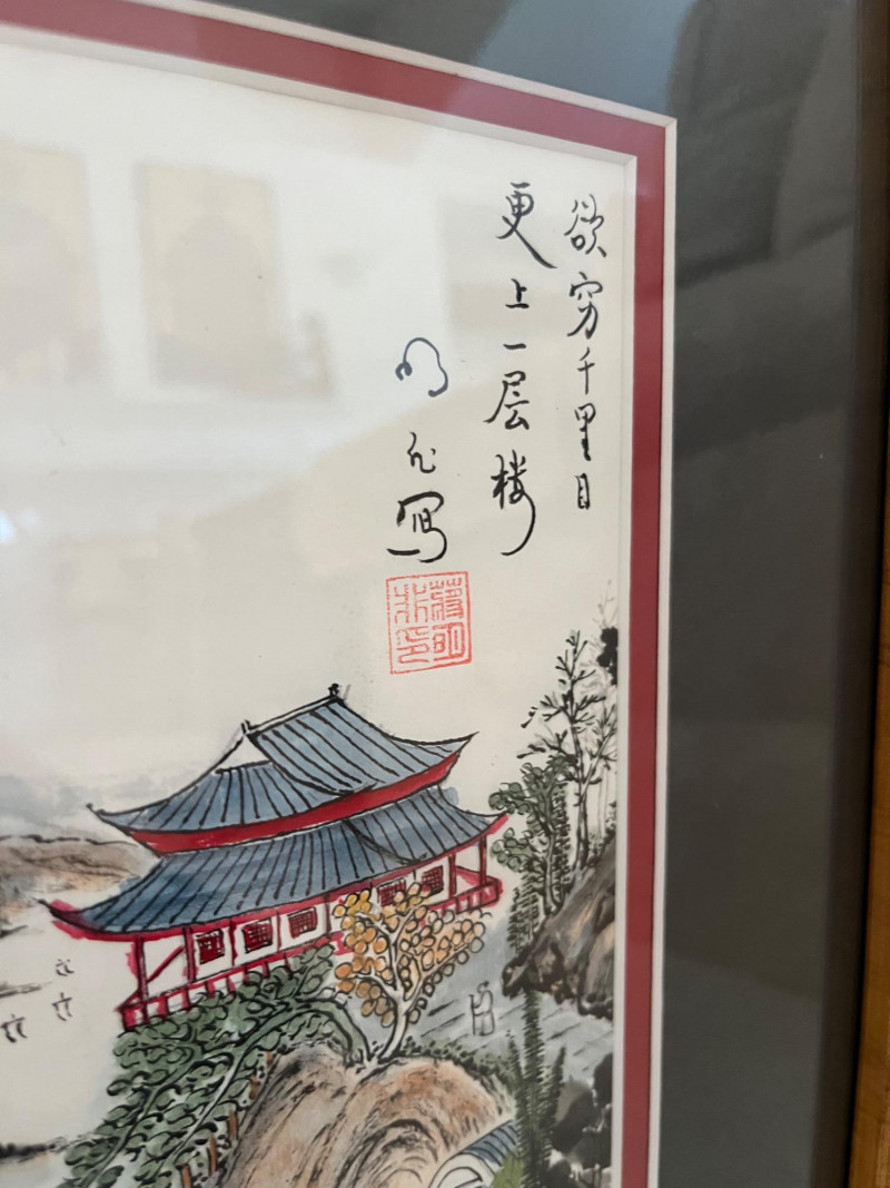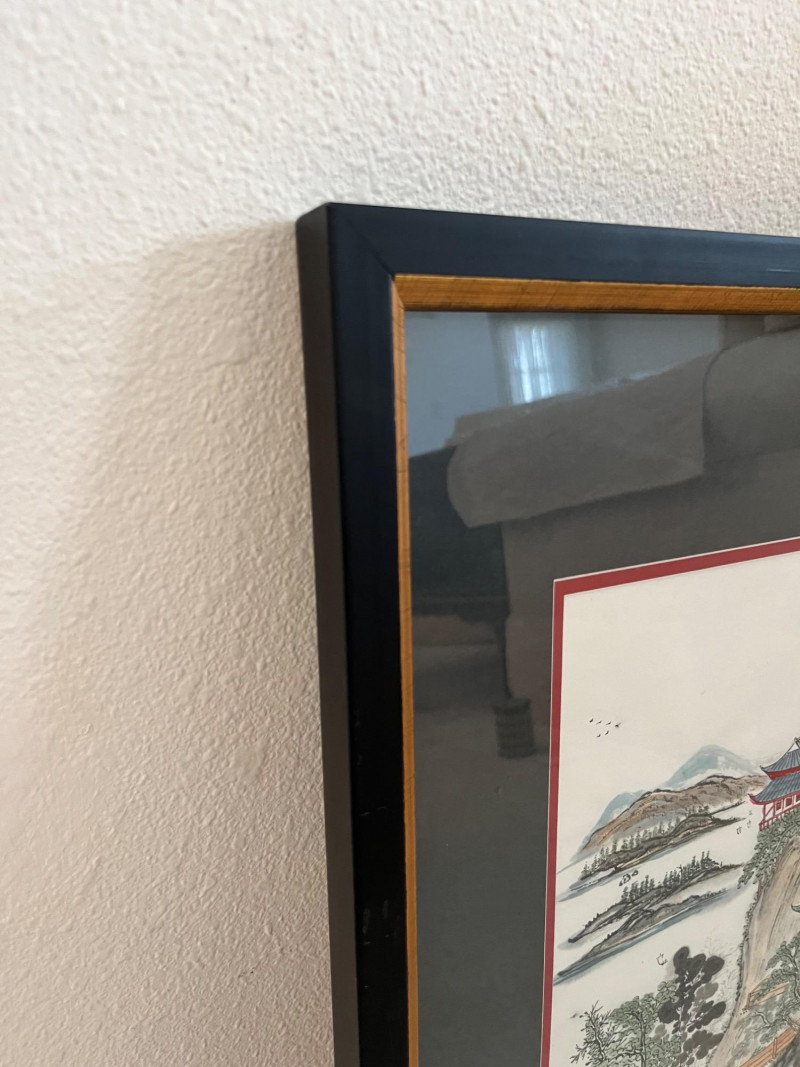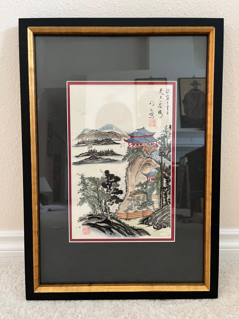 Framed Chinese Landscape Painting by Gin Ku – 20.5" H A framed ink and color painting on paper depicting a riverside scene with a traditional structure set among mountains and trees. A curved rock formation rises near the center, with small bridges and architectural details integrated into the landscape. Calligraphy and artist seals are present at the upper right and lower left. An envelope is affixed to the back of the frame, containing printed information and handwritten materials referencing the artist “Gin Ku,” who was born in China and trained at Kai Lin Art College. Additional prints and calligraphic works are included in the envelope. The piece is professionally framed and finished by Michaels. Dimensions: 20.5" H x 14.5" W (frame)