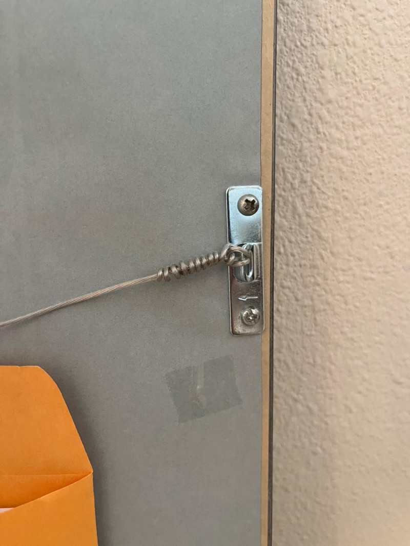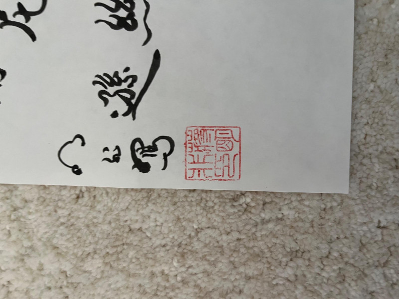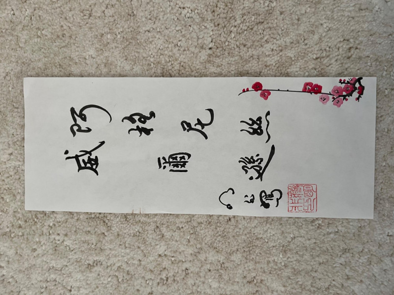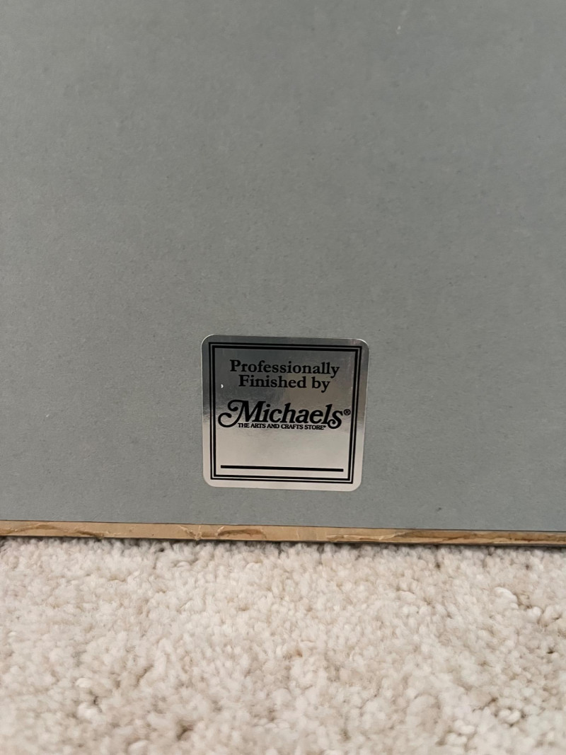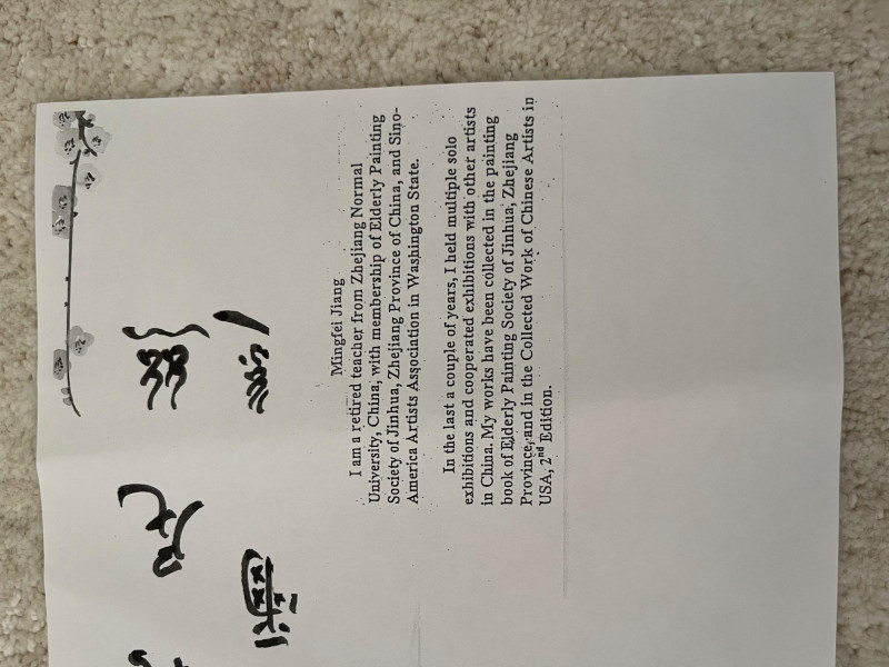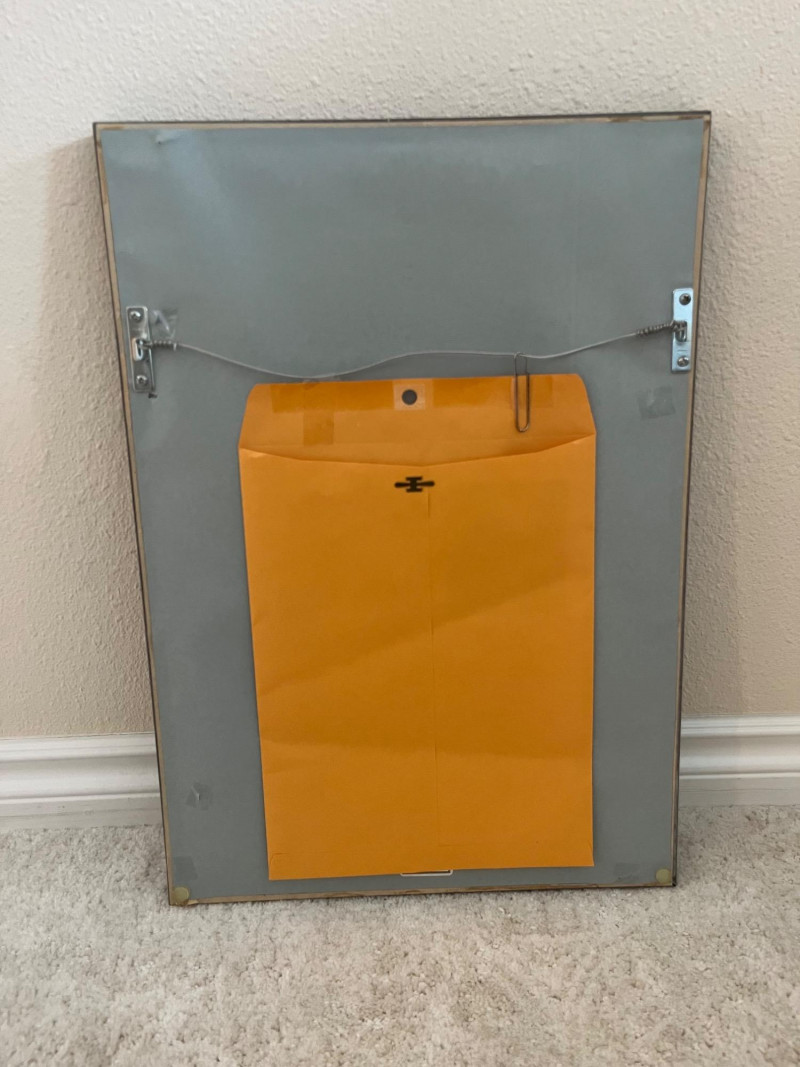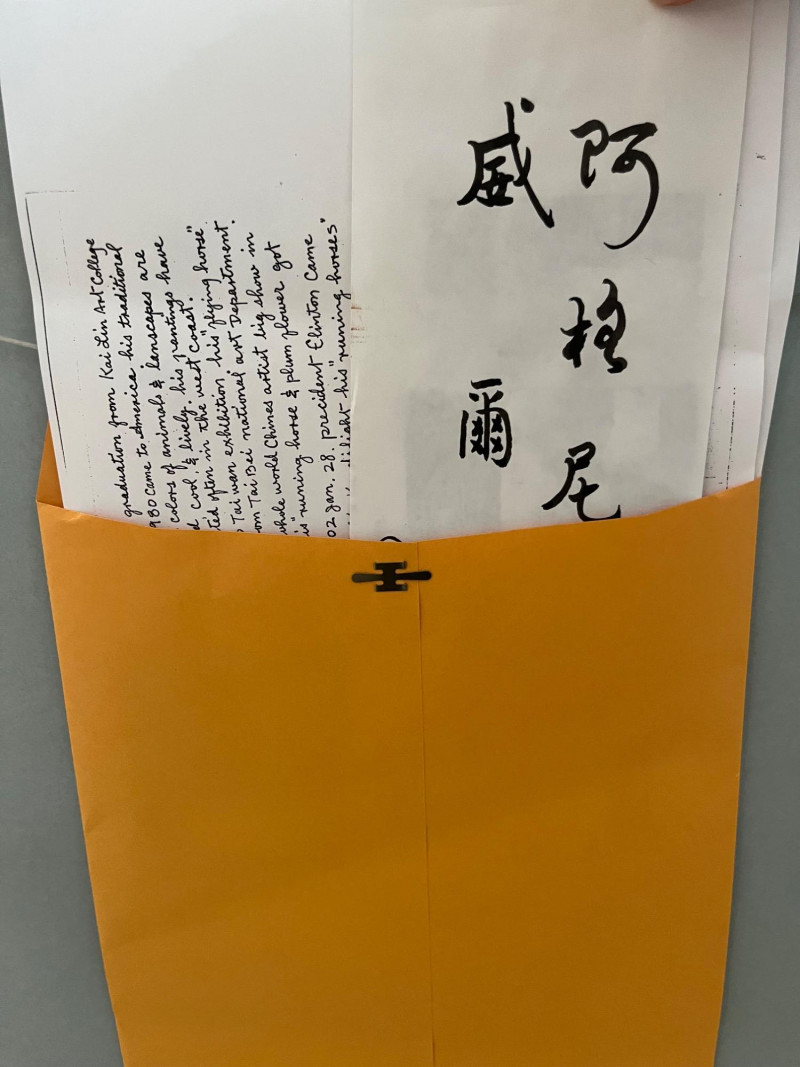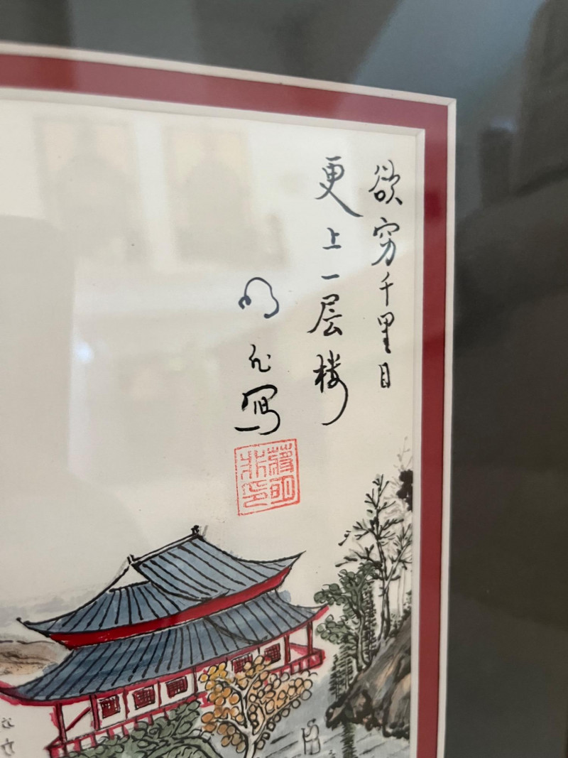 Framed Chinese Landscape Painting by Gin Ku – 20.5" H A framed ink and color painting on paper depicting a riverside scene with a traditional structure set among mountains and trees. A curved rock formation rises near the center, with small bridges and architectural details integrated into the landscape. Calligraphy and artist seals are present at the upper right and lower left. An envelope is affixed to the back of the frame, containing printed information and handwritten materials referencing the artist “Gin Ku,” who was born in China and trained at Kai Lin Art College. Additional prints and calligraphic works are included in the envelope. The piece is professionally framed and finished by Michaels. Dimensions: 20.5" H x 14.5" W (frame)