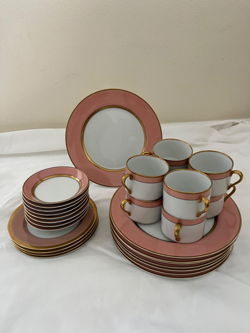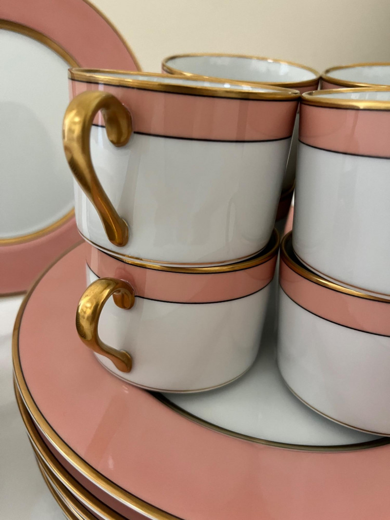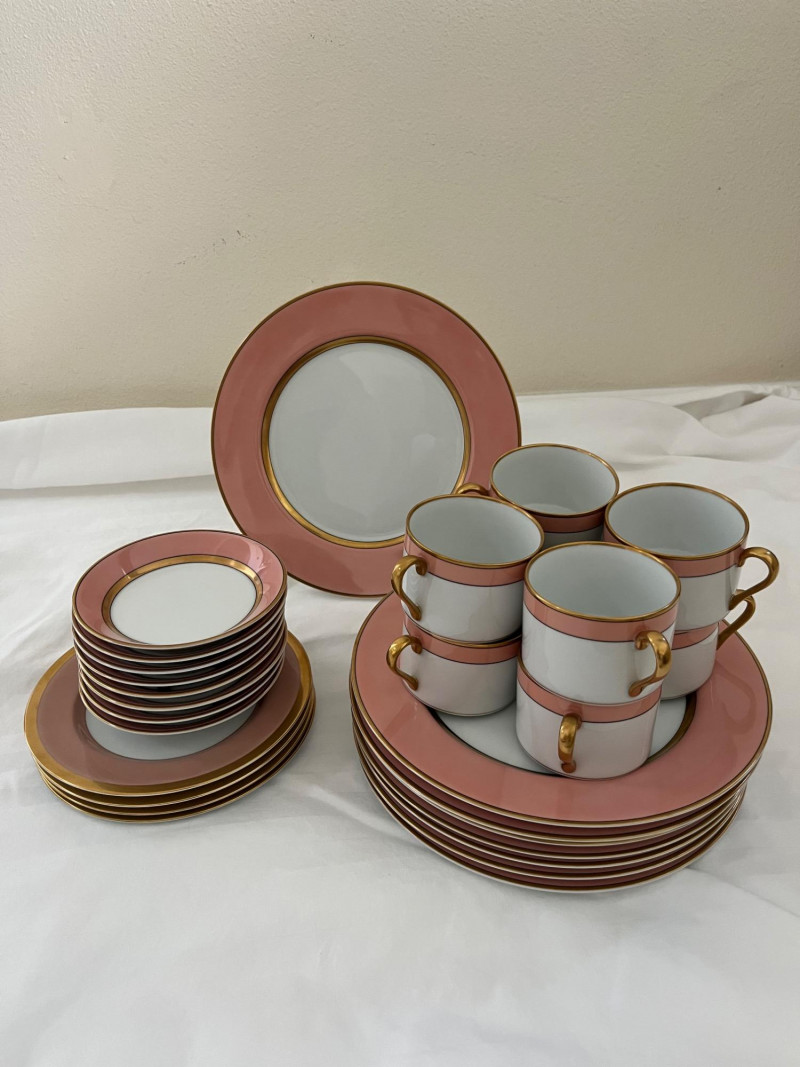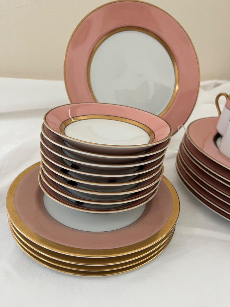 Fitz & Floyd Peach Renaissance Porcelain Dinnerware Set Porcelain dinnerware set in the Fitz & Floyd Peach/Pink Renaissance pattern. The set features a white ground with wide rose-pink bands and gold trim. Each cup includes a gold handle, and the rims of all pieces are accented in gold. Set includes: 8 large plates (10.25" diameter) 4 small plates (7.5" diameter) 8 side plates (5.5" diameter) 8 cups (3" diameter)