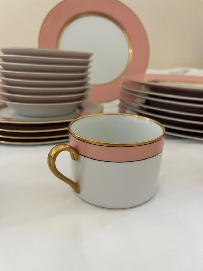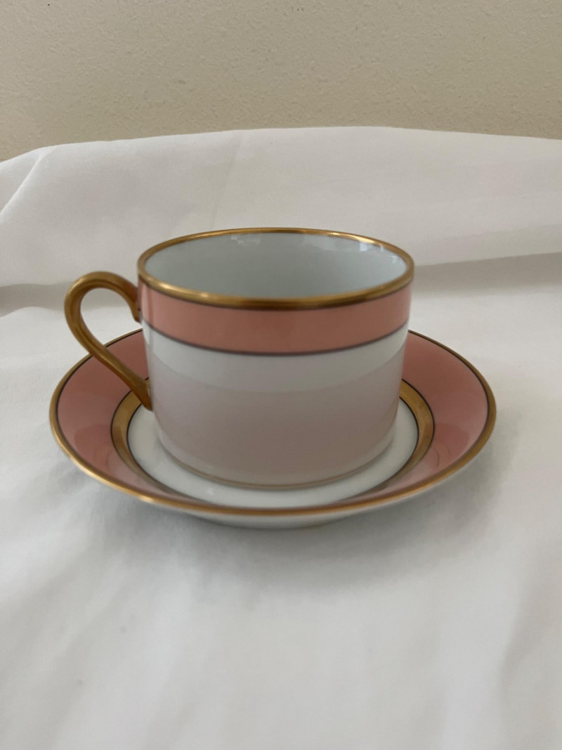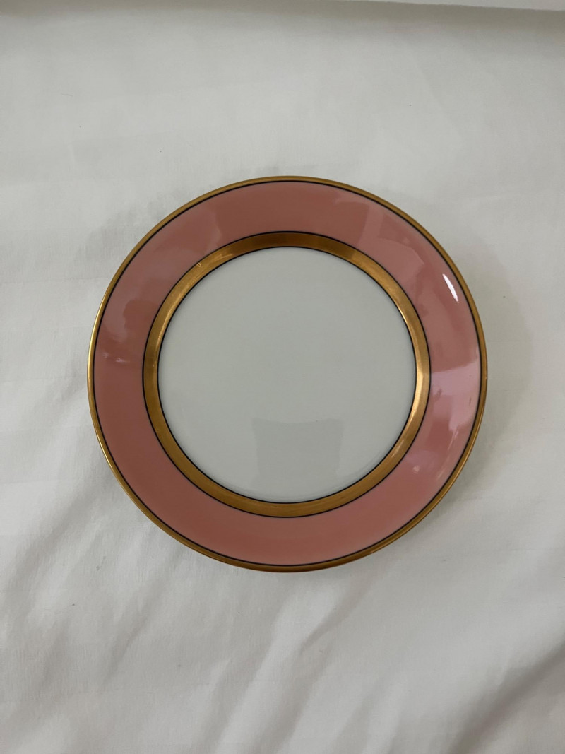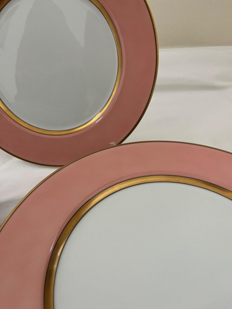 Fitz & Floyd Peach Renaissance Porcelain Dinnerware Set Porcelain dinnerware set in the Fitz & Floyd Peach/Pink Renaissance pattern. The set features a white ground with wide rose-pink bands and gold trim. Each cup includes a gold handle, and the rims of all pieces are accented in gold. Set includes: 8 large plates (10.25" diameter) 4 small plates (7.5" diameter) 8 side plates (5.5" diameter) 8 cups (3" diameter)
