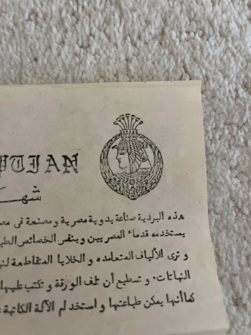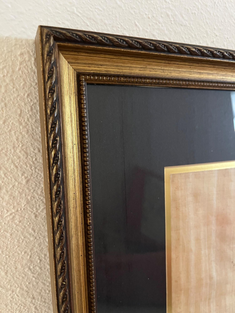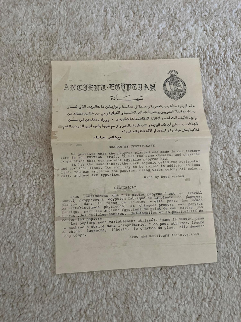 Egyptian Papyrus Painting – Framed Art of Pharaoh A painted profile of an Egyptian pharaoh on handmade papyrus, mounted under glass with a double mat and gold-edged border. A certificate on the reverse confirms the papyrus was produced in Egypt using traditional materials and methods, with properties consistent with ancient papyrus. Dimensions: 22" H x 17.75" W (frame)