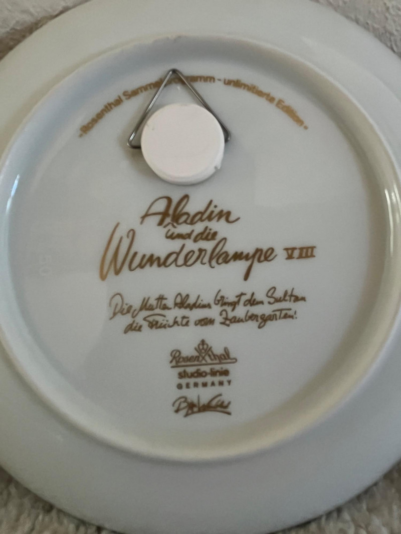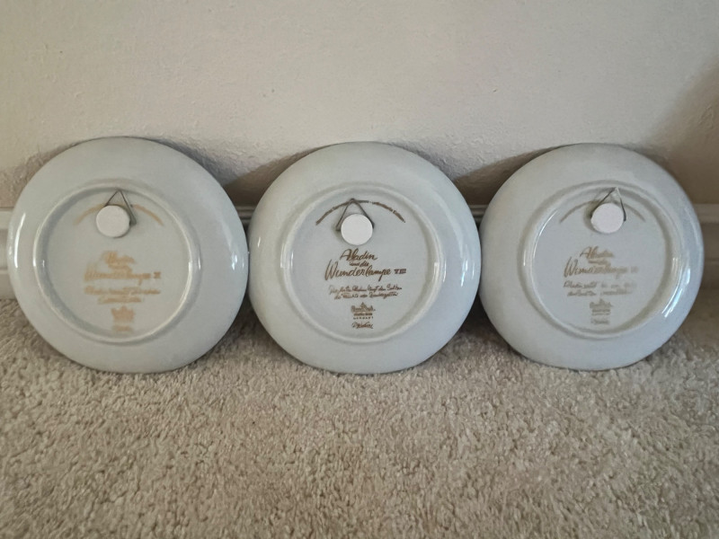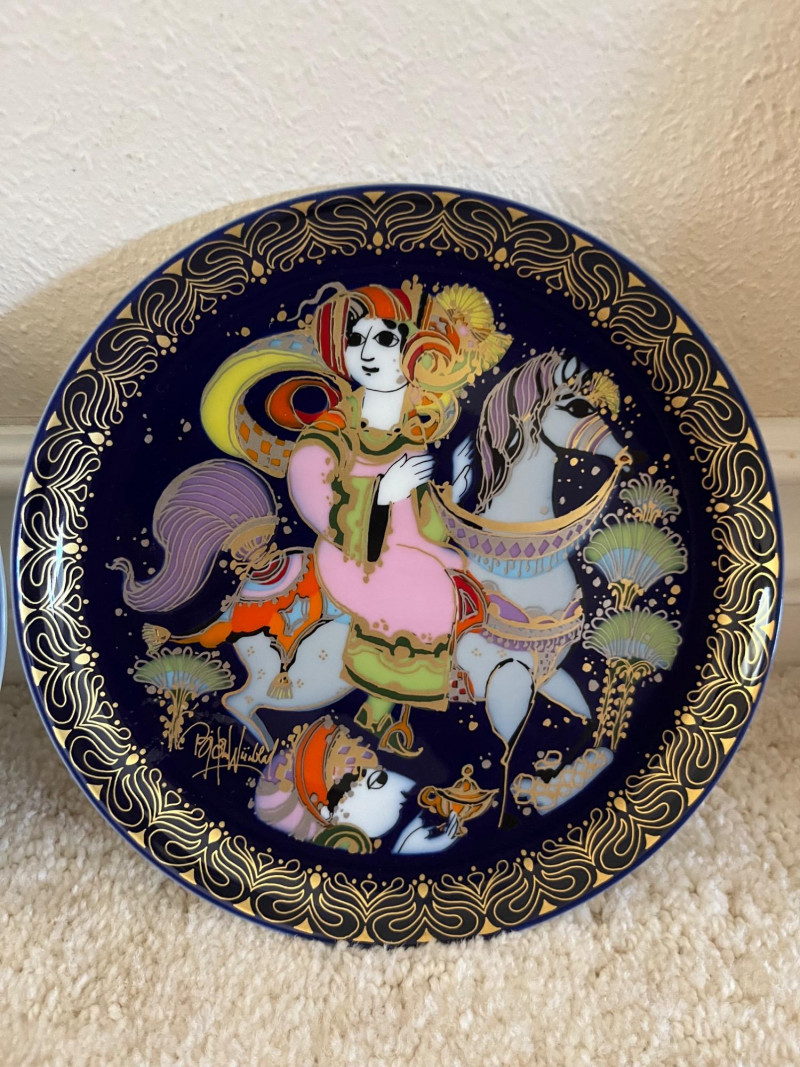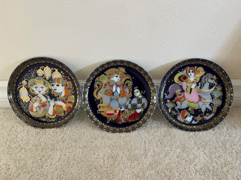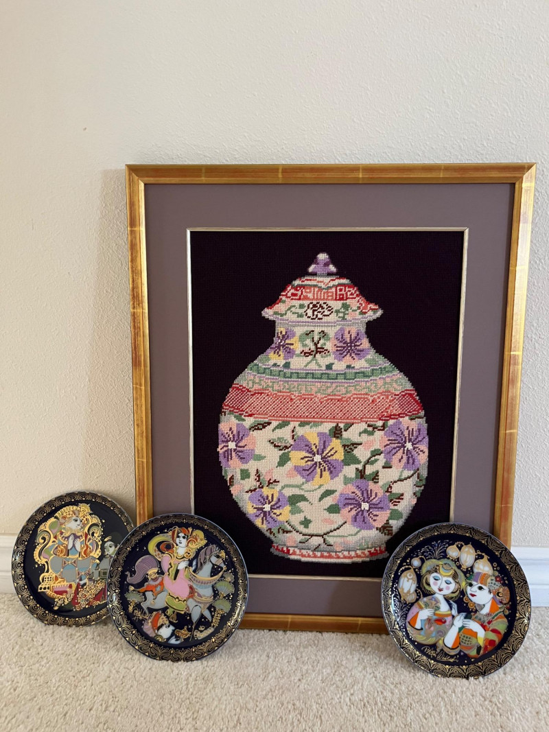 Bjorn Wiinblad Rosenthal Plates Framed with Ginger Jar Cross-Stitch A group featuring three vintage Rosenthal studio-line porcelain plates designed by Bjorn Wiinblad from the “Aladin und die Wunderlampe” series. Each plate presents a narrative scene in Wiinblad’s signature illustrative style, marked on the reverse with series titles and Rosenthal hallmarks. Accompanying the plates is a framed cross-stitch textile depicting a lidded ginger jar. The jar is formed from floral and geometric bands in varied colors, stitched on dark ground and presented in a double mat with gilt wood frame. Custom framed by The Mitre Box, Baltimore. Framed Textile Dimensions: 21.5" H x 17.25" W