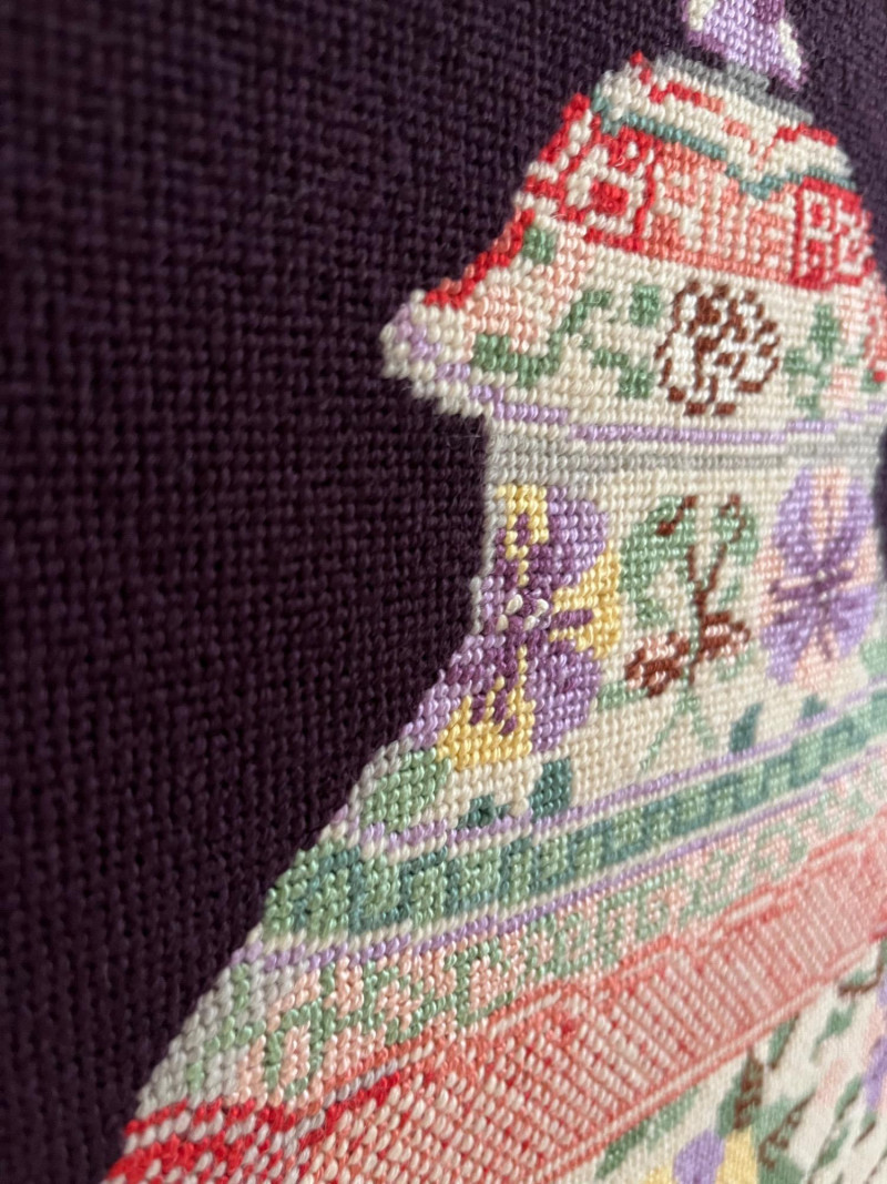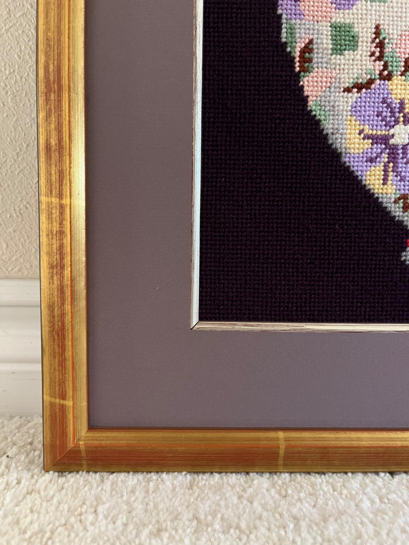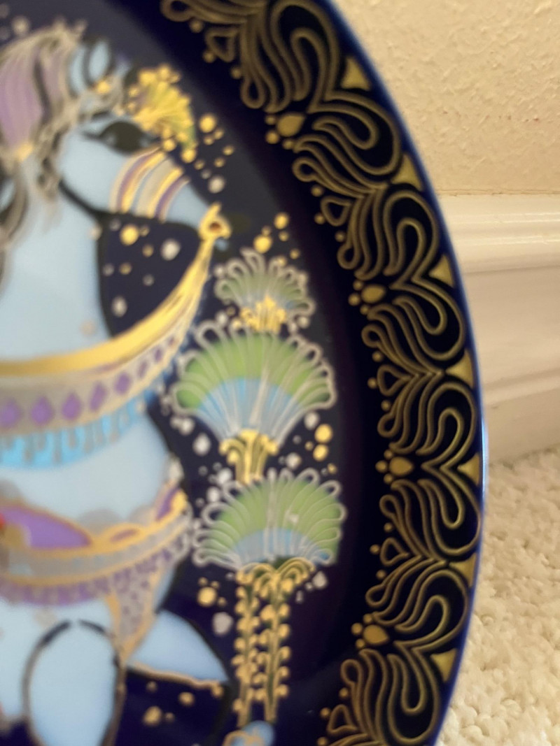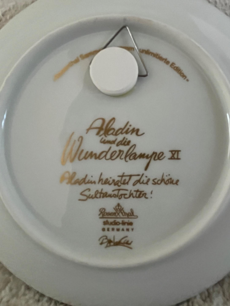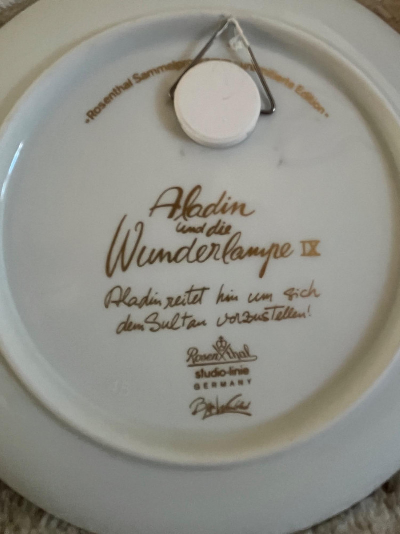 Bjorn Wiinblad Rosenthal Plates Framed with Ginger Jar Cross-Stitch A group featuring three vintage Rosenthal studio-line porcelain plates designed by Bjorn Wiinblad from the “Aladin und die Wunderlampe” series. Each plate presents a narrative scene in Wiinblad’s signature illustrative style, marked on the reverse with series titles and Rosenthal hallmarks. Accompanying the plates is a framed cross-stitch textile depicting a lidded ginger jar. The jar is formed from floral and geometric bands in varied colors, stitched on dark ground and presented in a double mat with gilt wood frame. Custom framed by The Mitre Box, Baltimore. Framed Textile Dimensions: 21.5" H x 17.25" W
