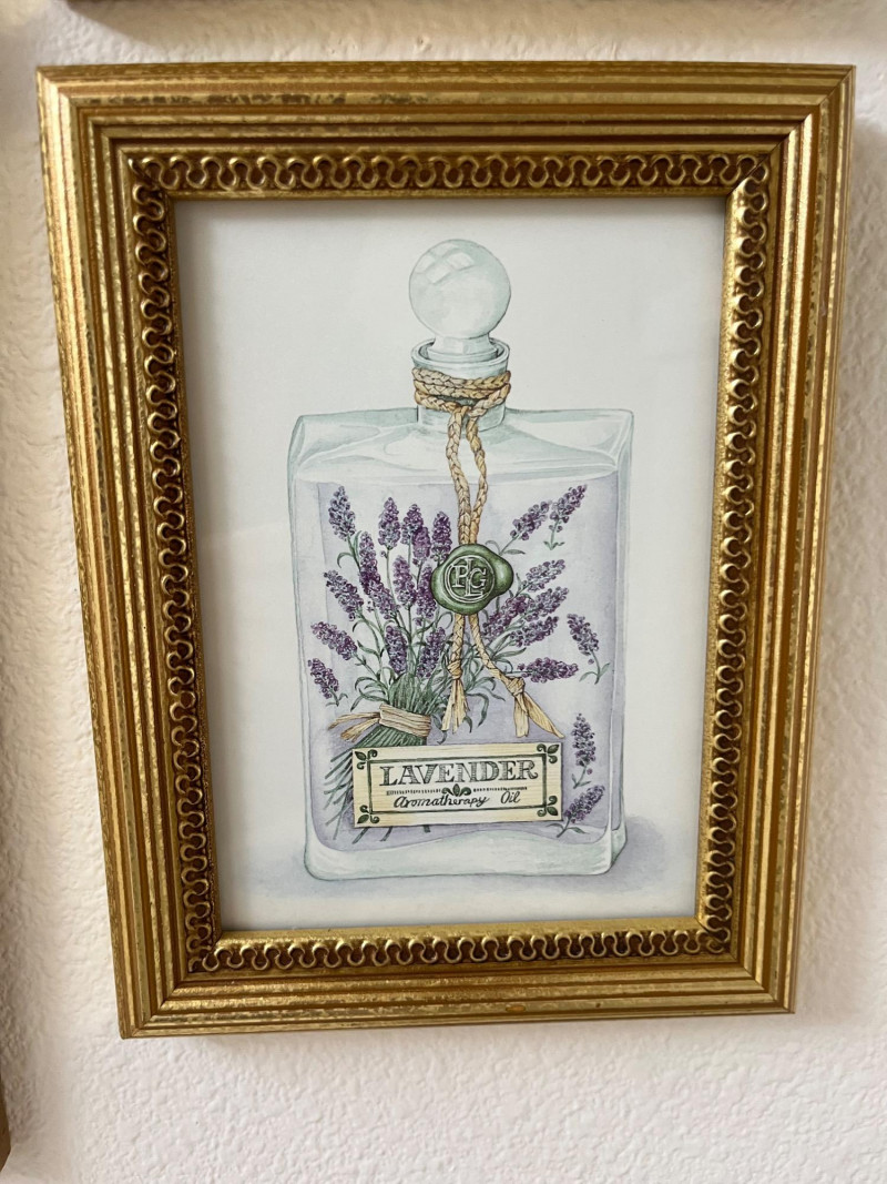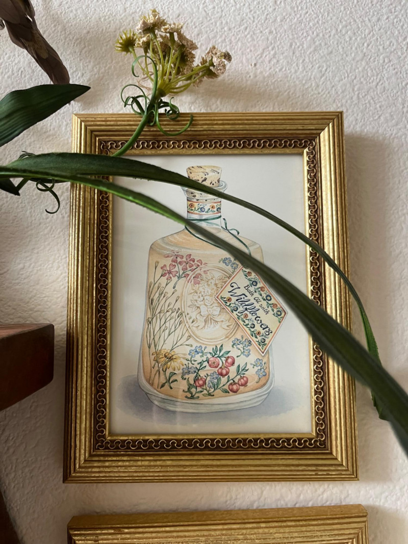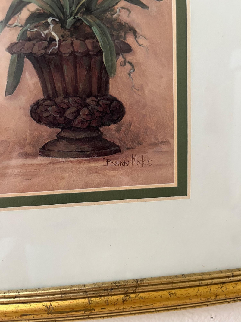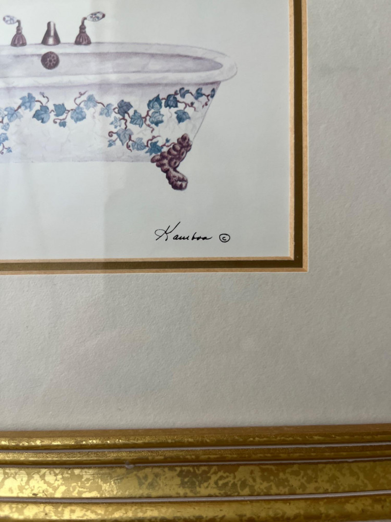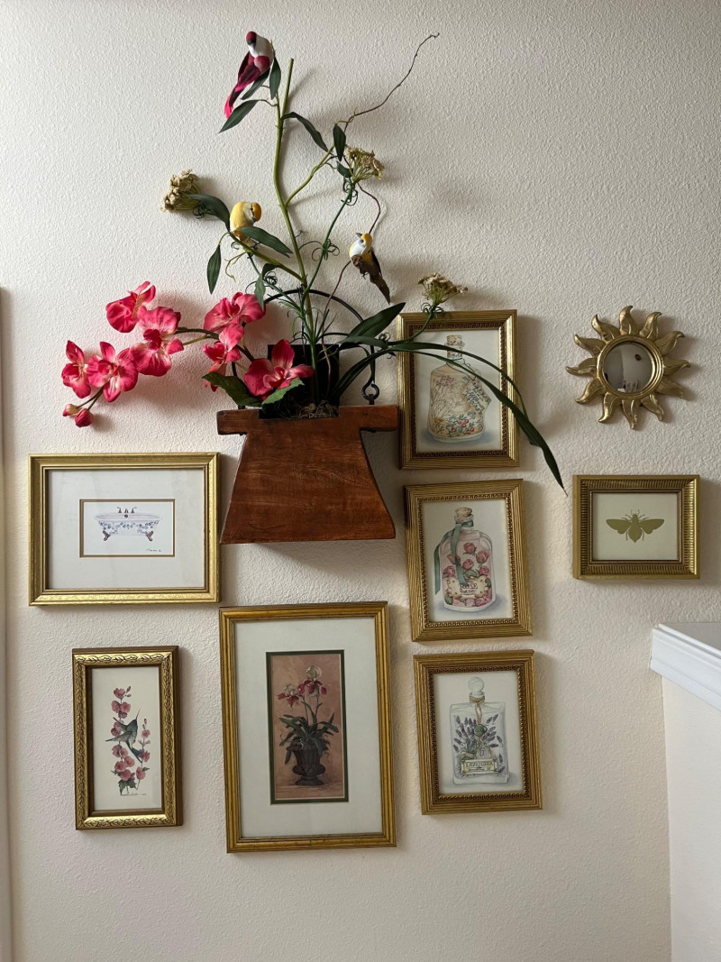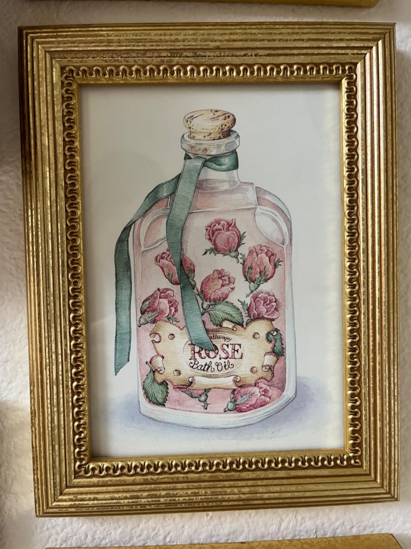 Framed Wall Art and Décor Collection A coordinated set of framed prints and decorative accents featuring themes of florals, perfume bottles, bathing scenes, birds, and botanical elements. The artworks include labeled illustrations such as “Rose Bath Oil,” orchid arrangements, and antique-style bathtubs. The collection includes works signed by Carolyn Shores Wright (dated 1995), Consuelo Gamboa, and Barbara Mock—artists known for decorative prints inspired by nature and domestic subjects. One round mirror with a sunburst frame is also included. The frames are gold-toned with varied profiles including ribbed, beaded, and carved leaf patterns. Comparable listings confirm the stylistic alignment of this group with other vintage decorative pieces. Total: 7 framed artworks, 1 mirror, 1 wall-mounted floral and bird arrangement. Dimensions: