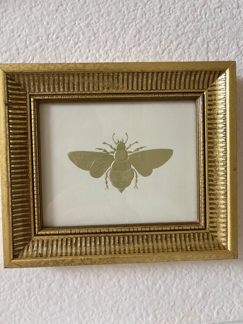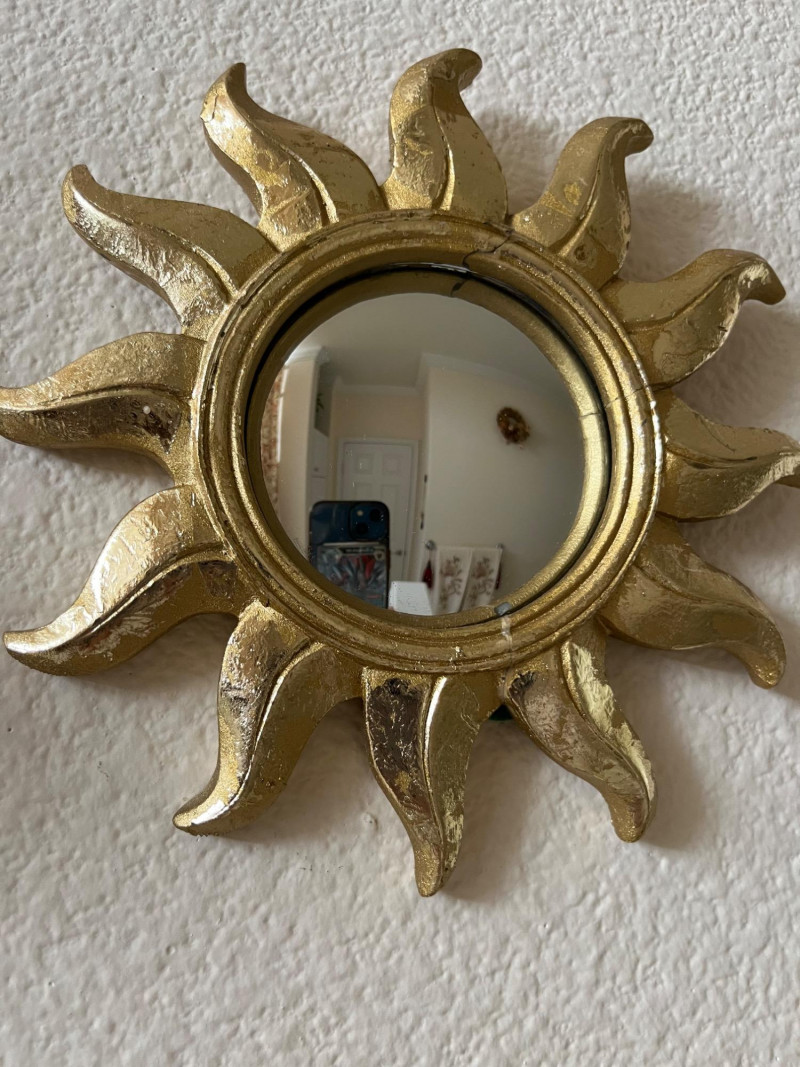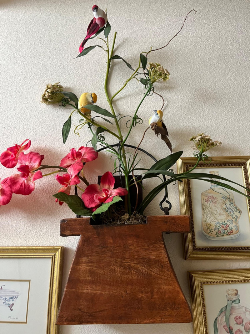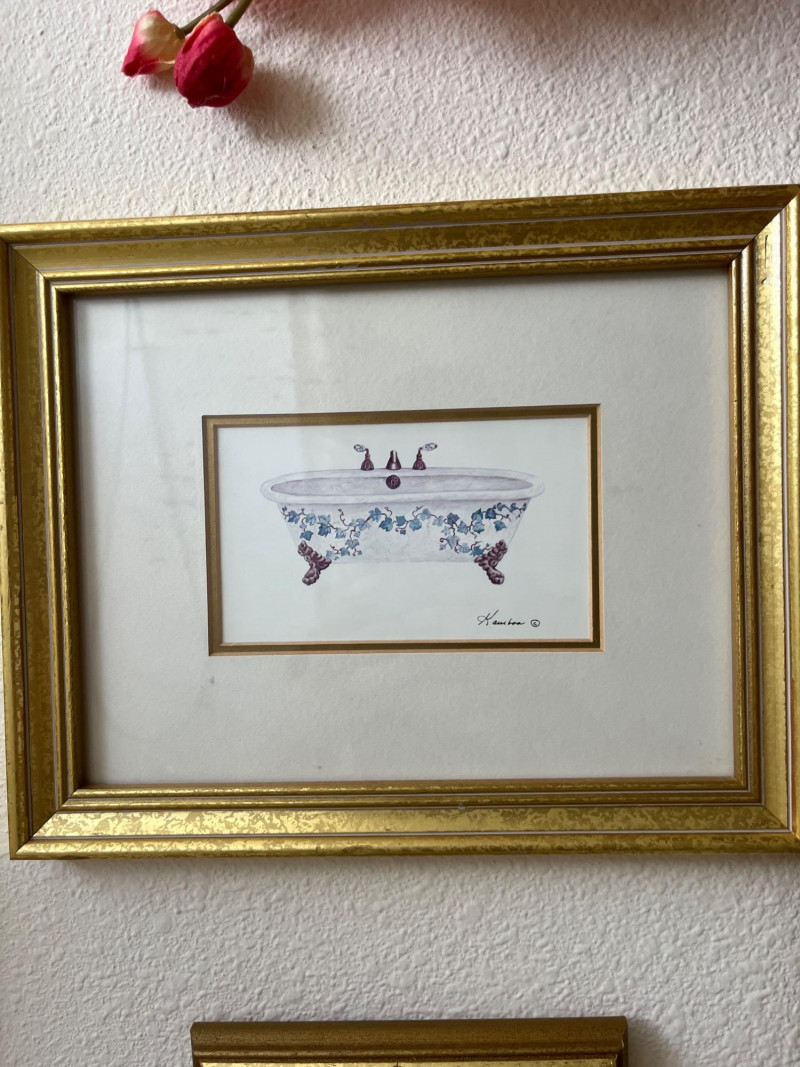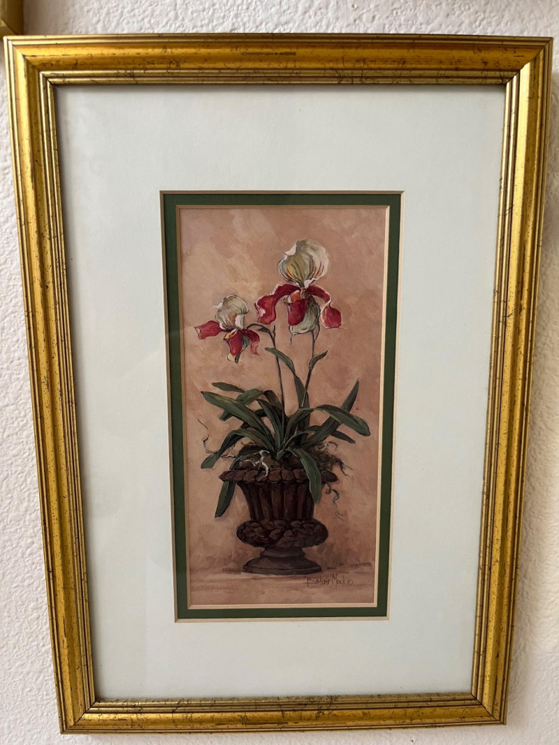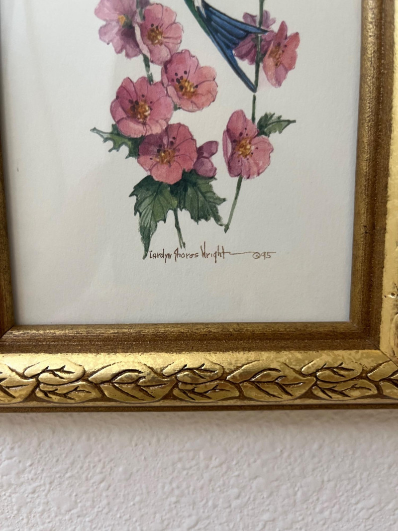 Framed Wall Art and Décor Collection A coordinated set of framed prints and decorative accents featuring themes of florals, perfume bottles, bathing scenes, birds, and botanical elements. The artworks include labeled illustrations such as “Rose Bath Oil,” orchid arrangements, and antique-style bathtubs. The collection includes works signed by Carolyn Shores Wright (dated 1995), Consuelo Gamboa, and Barbara Mock—artists known for decorative prints inspired by nature and domestic subjects. One round mirror with a sunburst frame is also included. The frames are gold-toned with varied profiles including ribbed, beaded, and carved leaf patterns. Comparable listings confirm the stylistic alignment of this group with other vintage decorative pieces. Total: 7 framed artworks, 1 mirror, 1 wall-mounted floral and bird arrangement. Dimensions:
