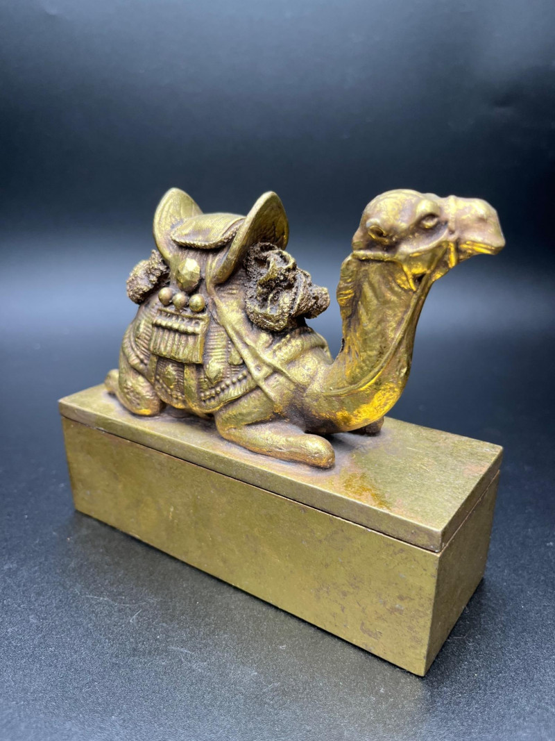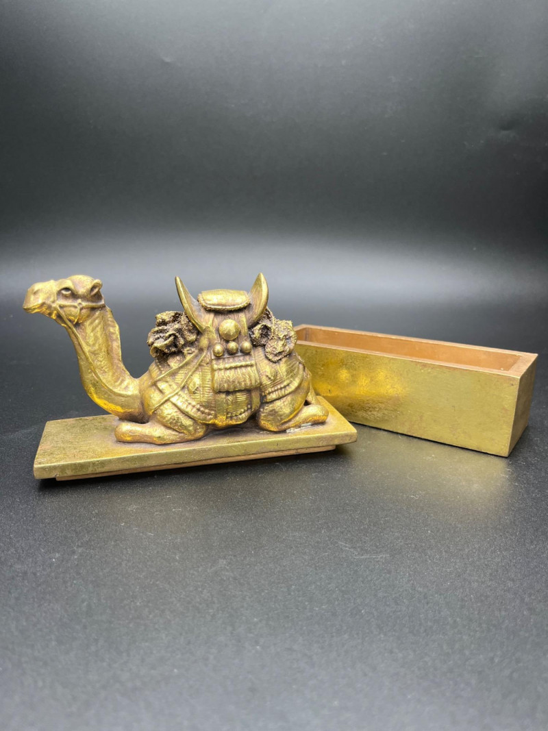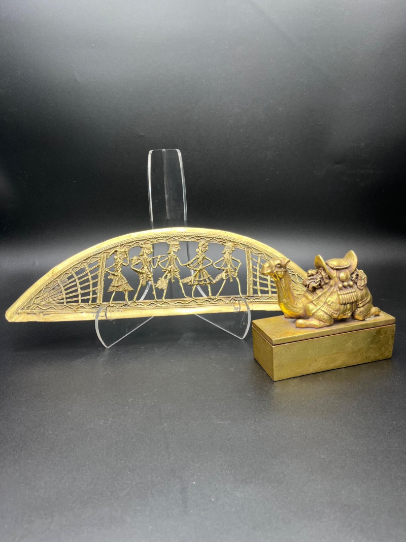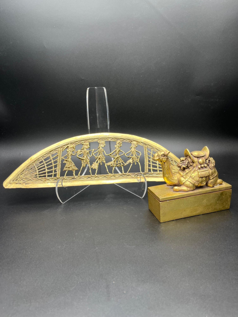 Brass Camel Box and Dokra-Style Tribal Wall Plaque A brass container formed as a seated camel carrying bundled cargo and decorative harnesses, with a rectangular base that lifts to reveal an inner compartment. Paired with a pierced brass wall plaque in the Dokra metalwork tradition, showing four stylized human figures in procession within an arched frame. Dimensions: