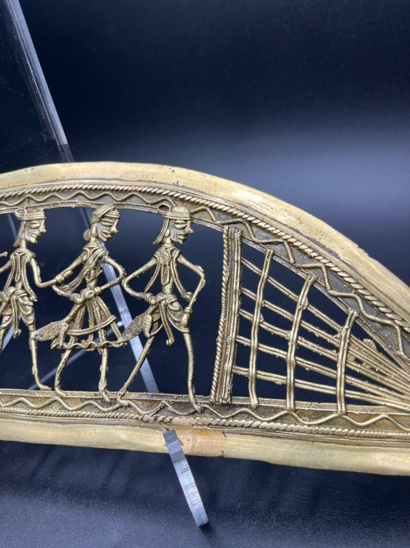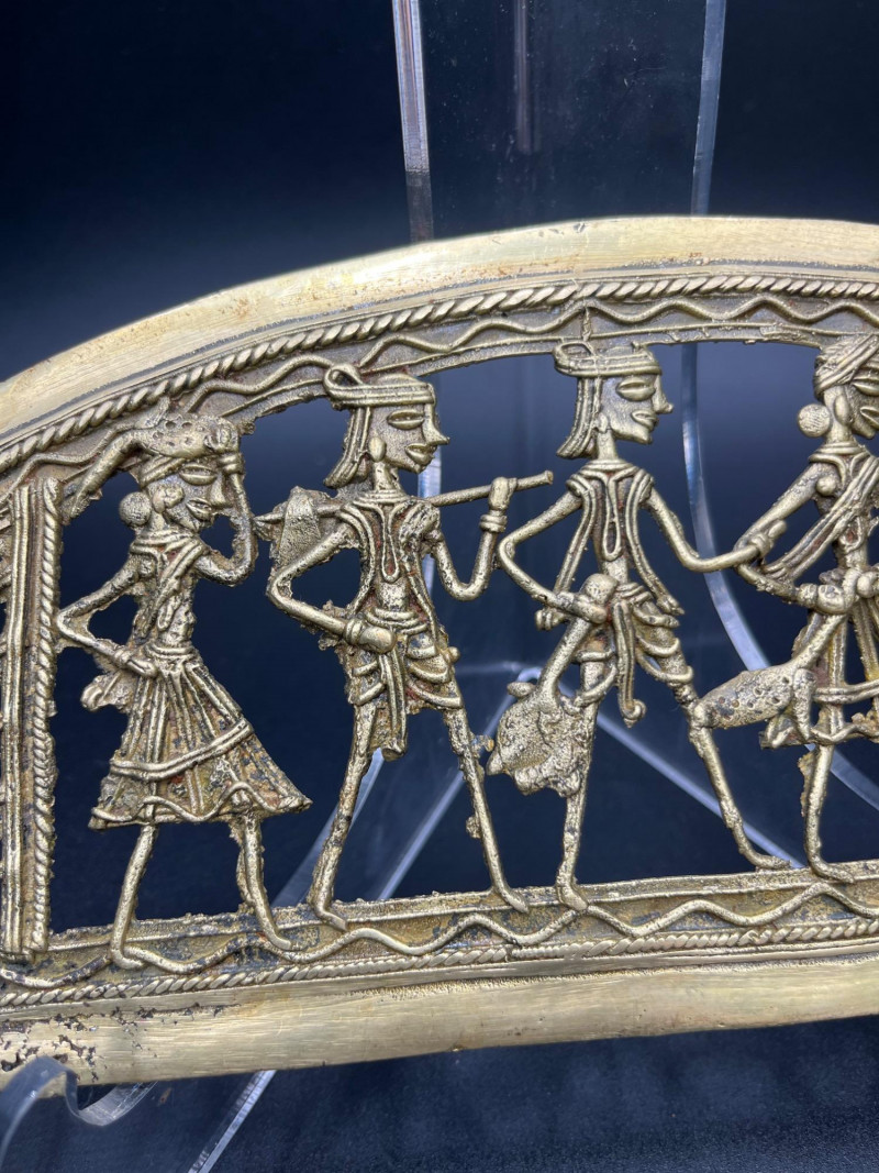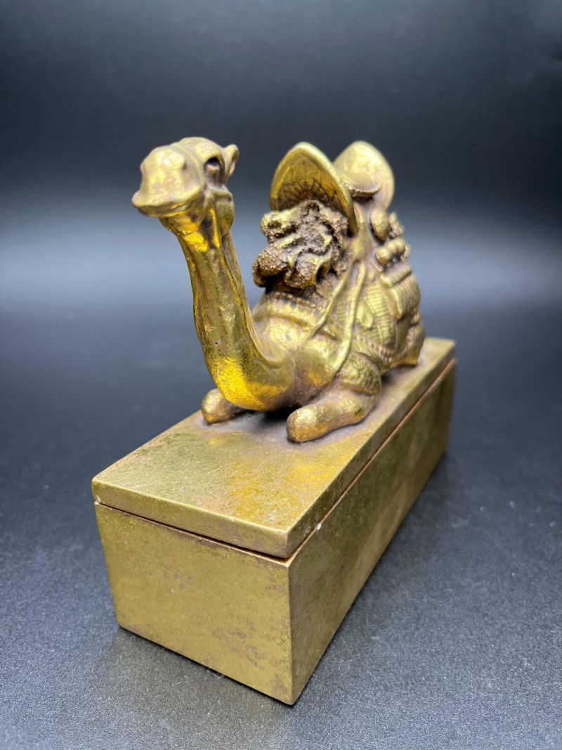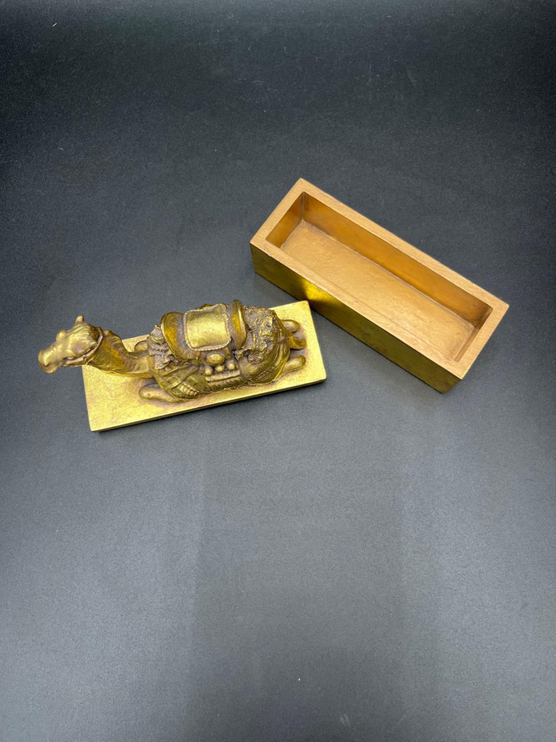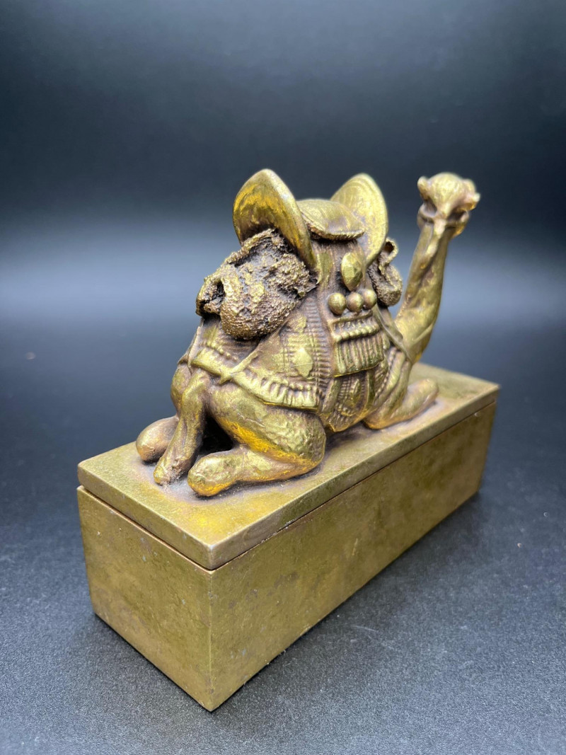 Brass Camel Box and Dokra-Style Tribal Wall Plaque A brass container formed as a seated camel carrying bundled cargo and decorative harnesses, with a rectangular base that lifts to reveal an inner compartment. Paired with a pierced brass wall plaque in the Dokra metalwork tradition, showing four stylized human figures in procession within an arched frame. Dimensions: