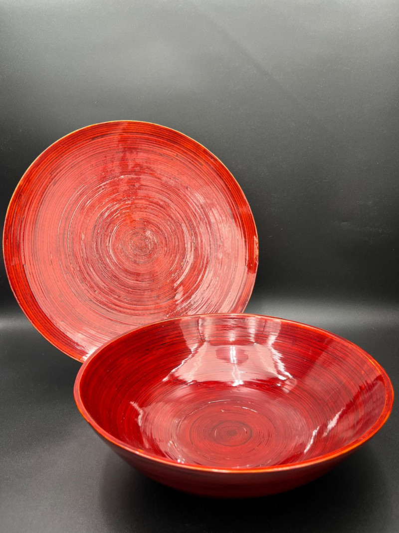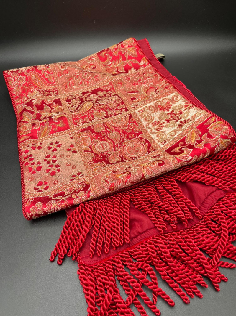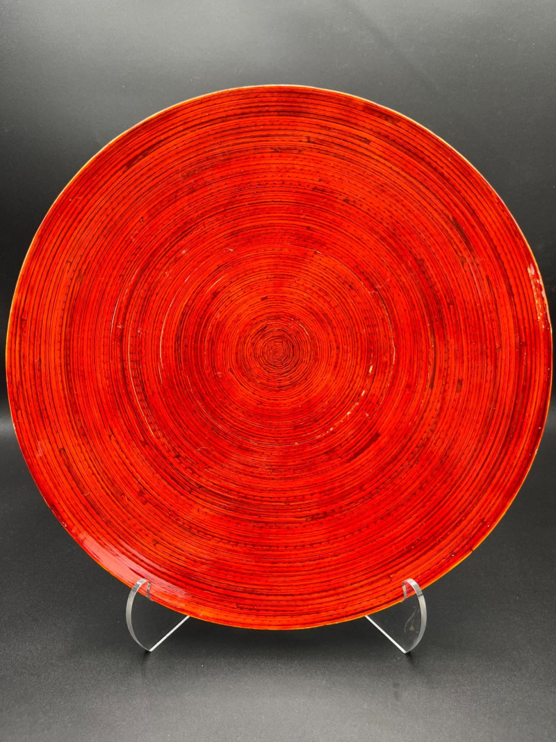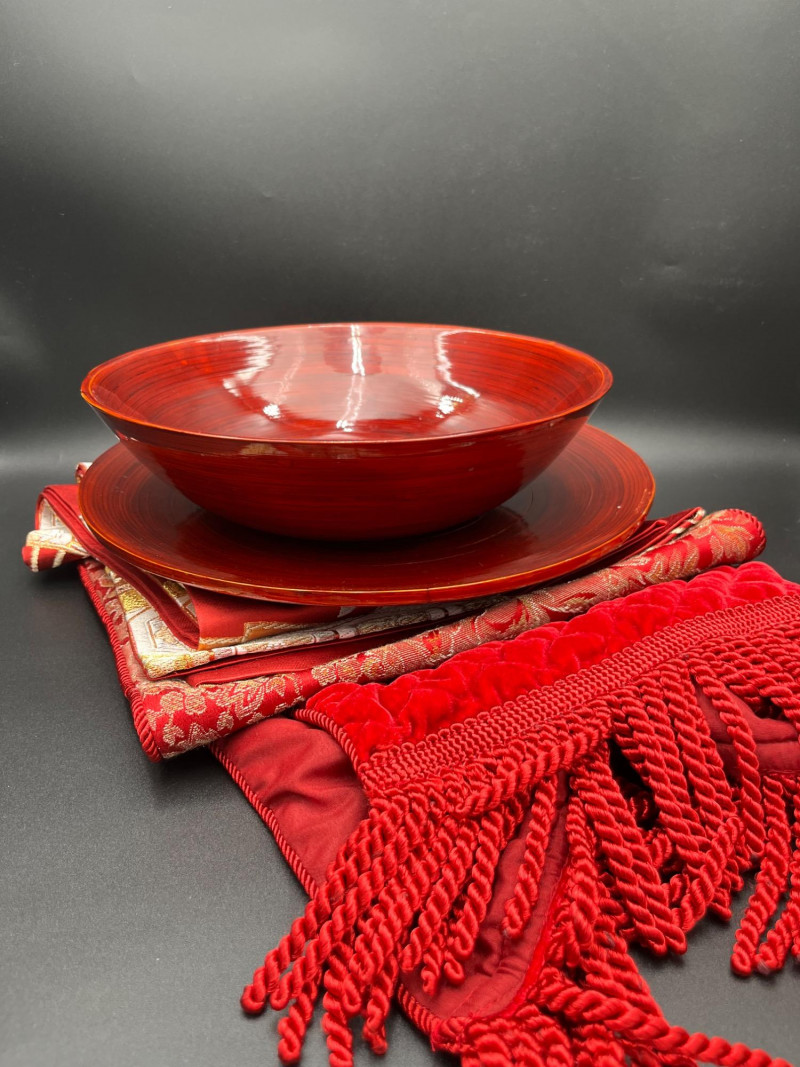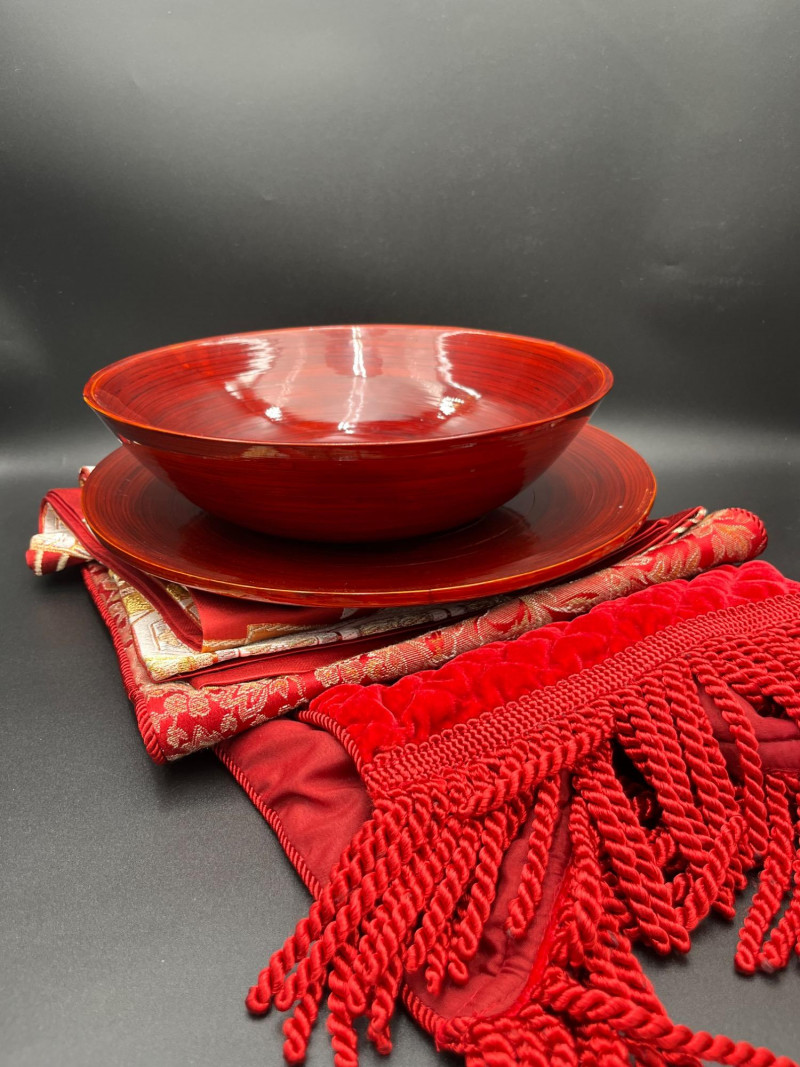 Red Spiral Plate and Table Runners A round plate with concentric linework in red, bearing a label marked “Crafted in Vietnam.” Included are two table runners: one featuring multicolored embroidery with leaf and geometric patterns, the other composed of red-toned patchwork with twisted fringe trim. Measurements: