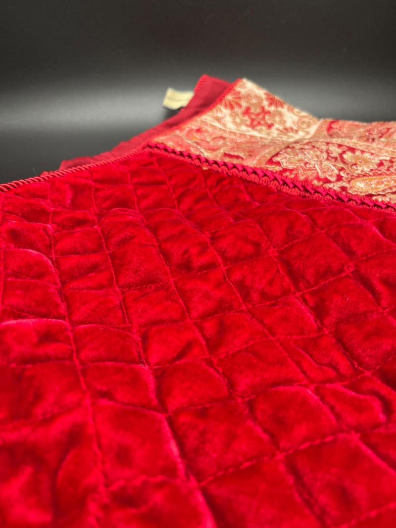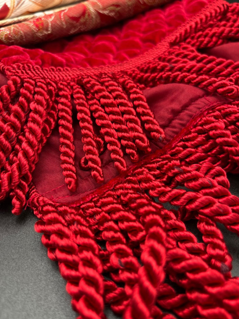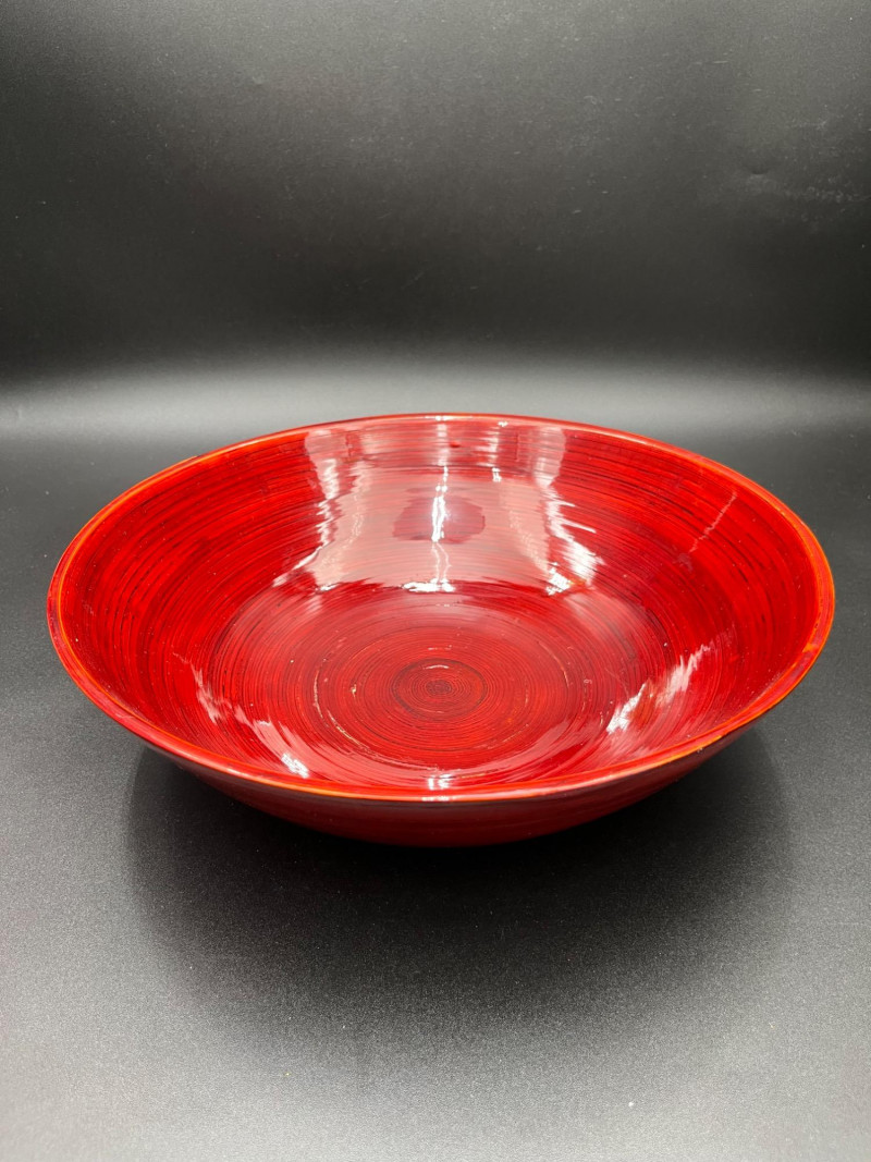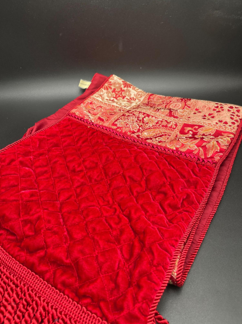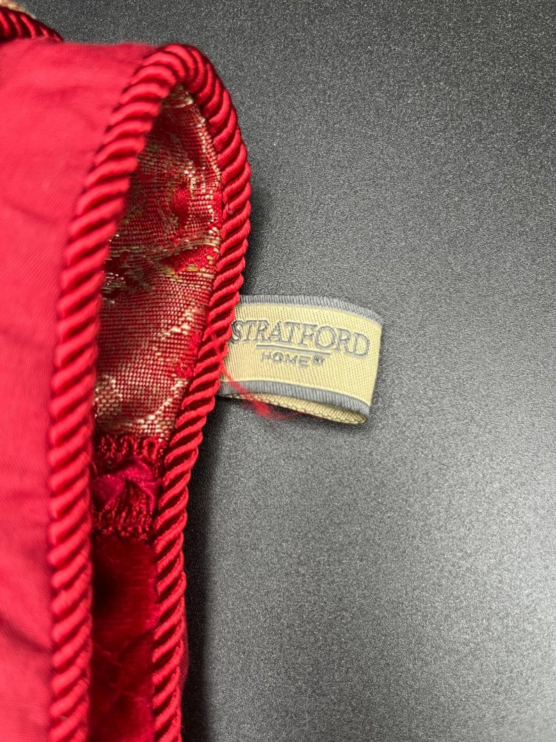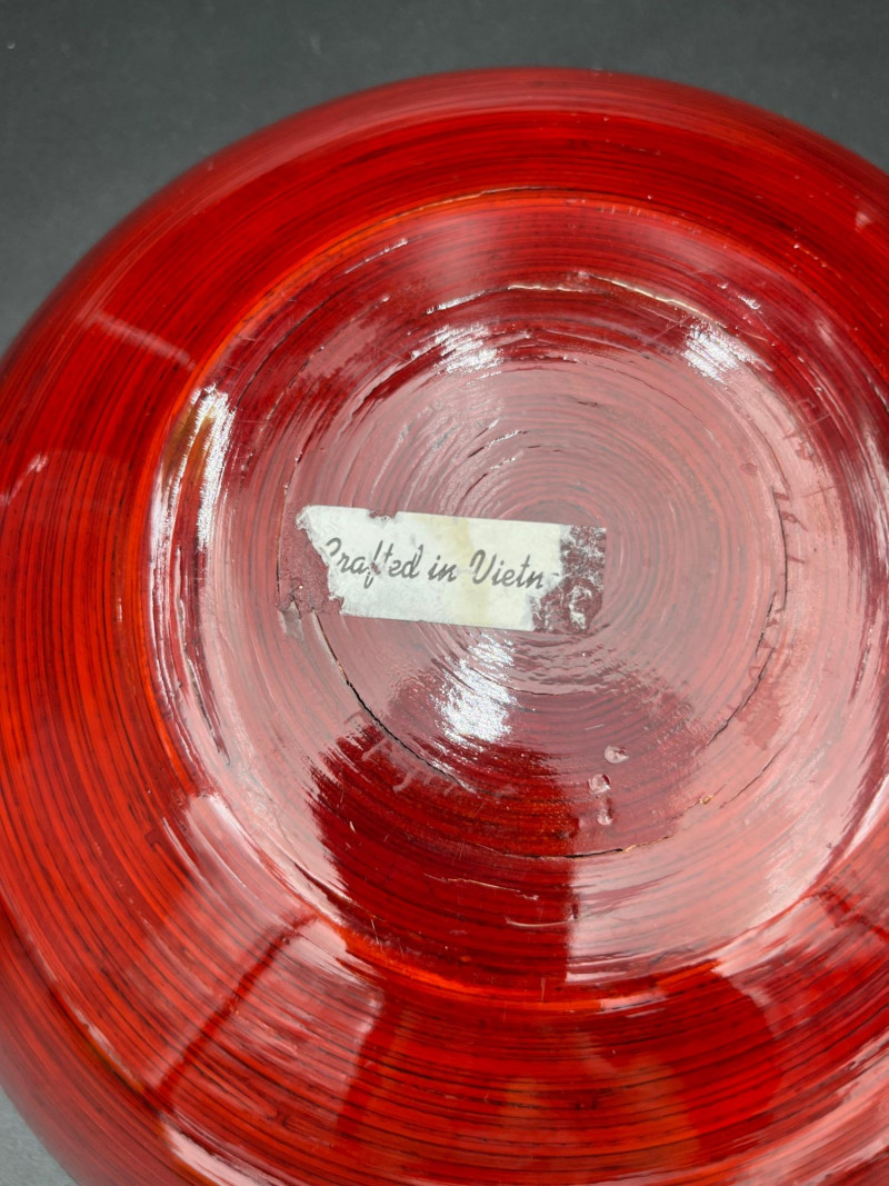 Red Spiral Plate and Table Runners A round plate with concentric linework in red, bearing a label marked “Crafted in Vietnam.” Included are two table runners: one featuring multicolored embroidery with leaf and geometric patterns, the other composed of red-toned patchwork with twisted fringe trim. Measurements: