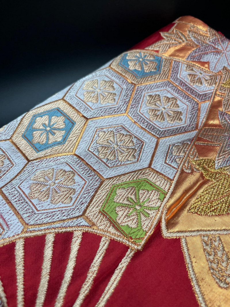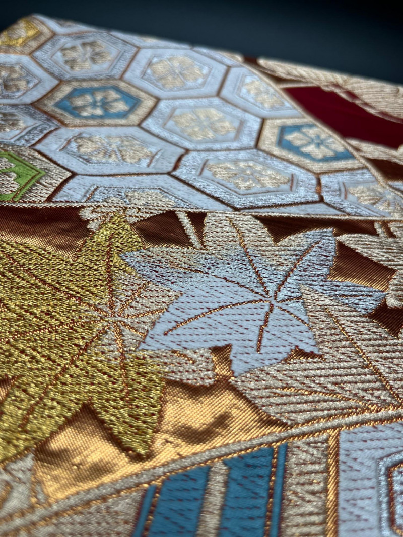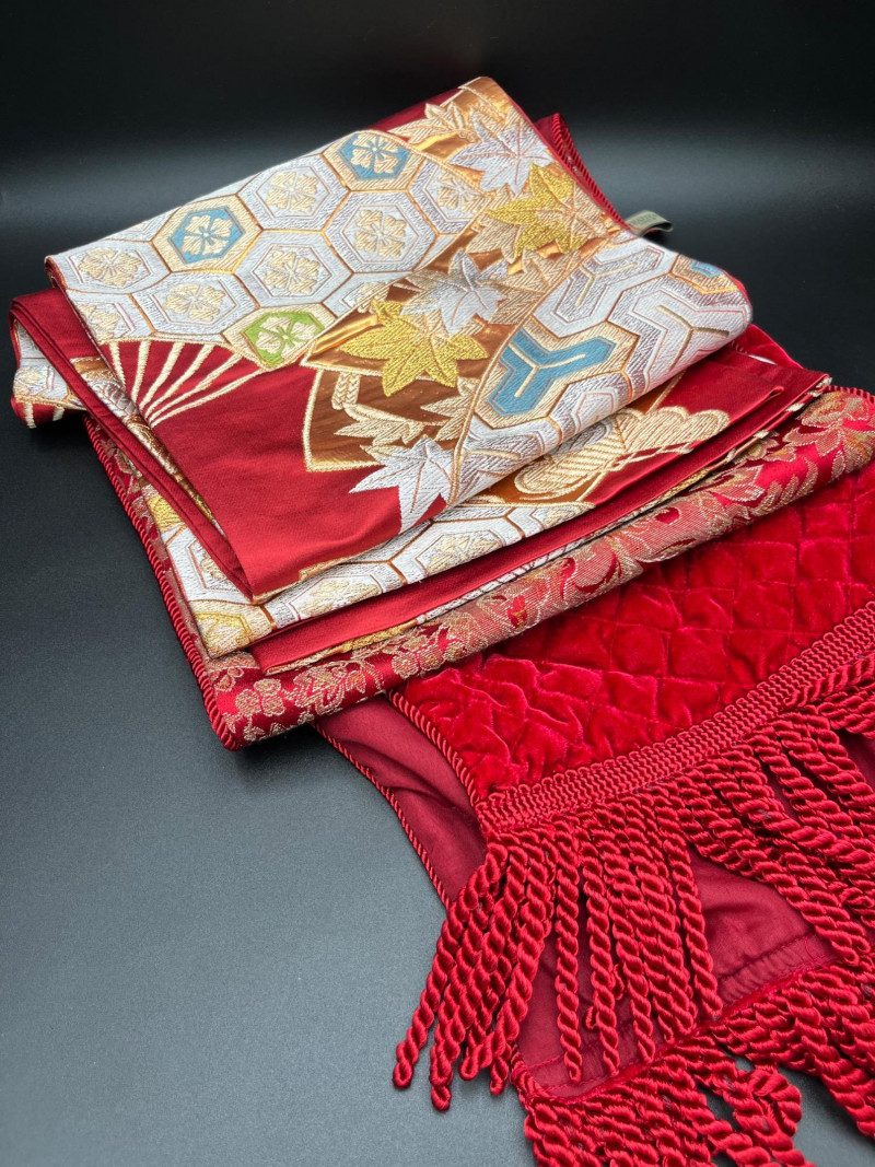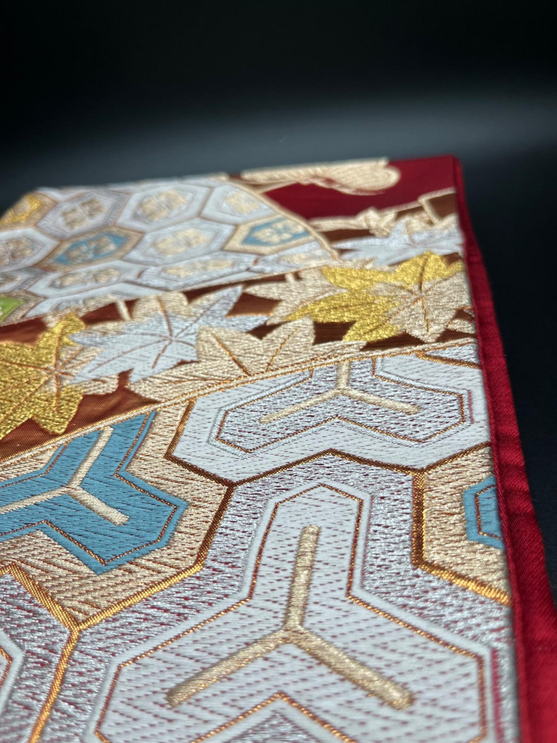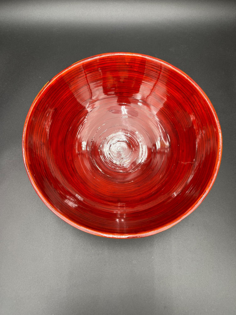 Red Spiral Plate and Table Runners A round plate with concentric linework in red, bearing a label marked “Crafted in Vietnam.” Included are two table runners: one featuring multicolored embroidery with leaf and geometric patterns, the other composed of red-toned patchwork with twisted fringe trim. Measurements: