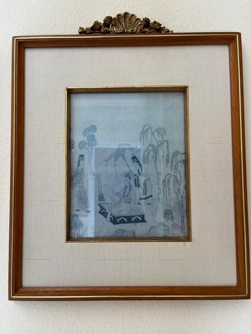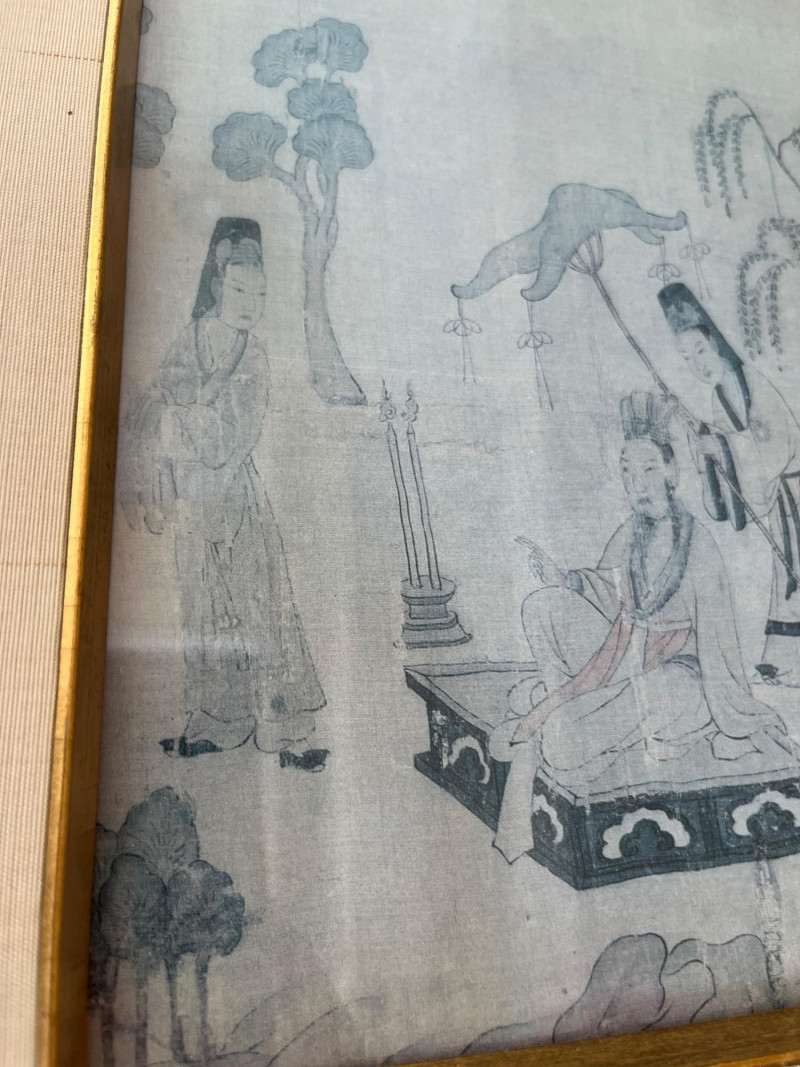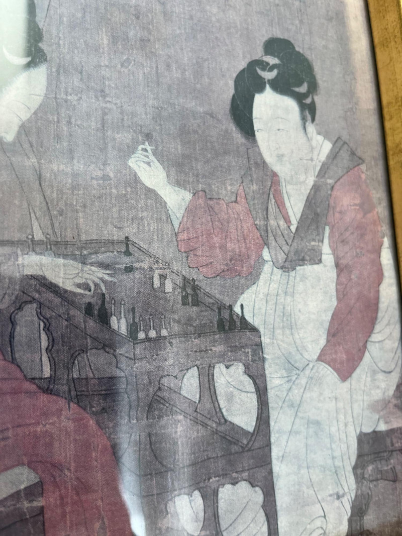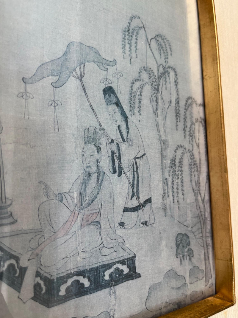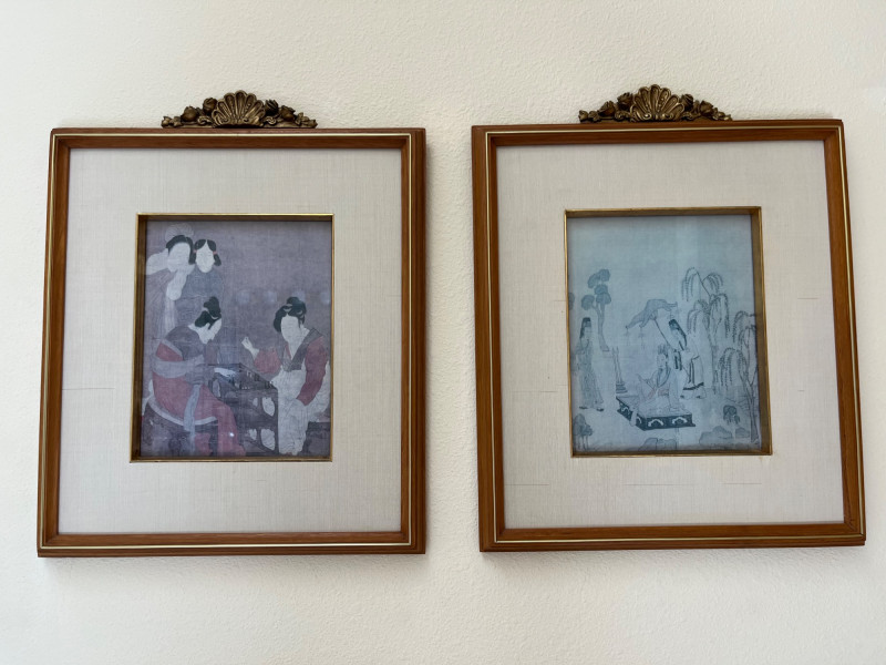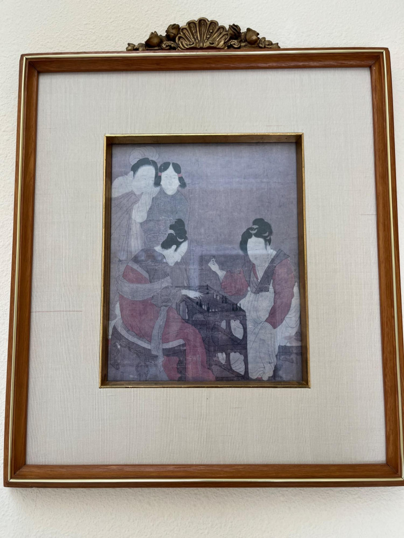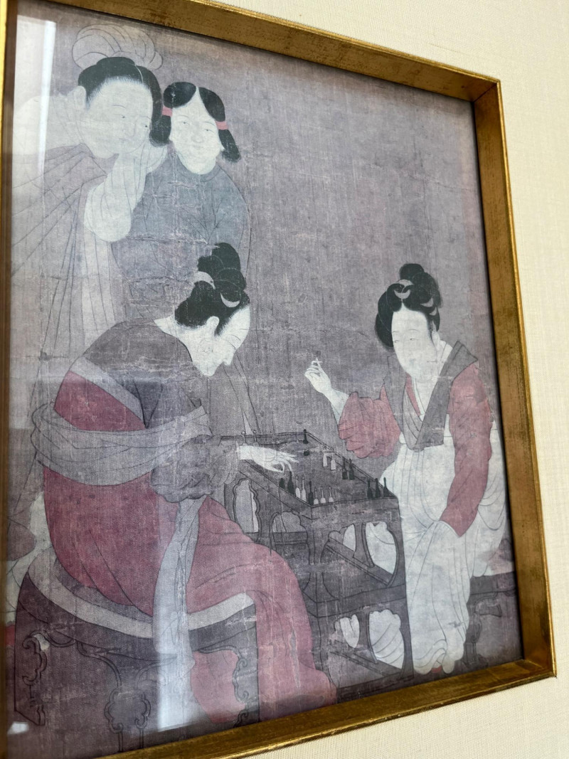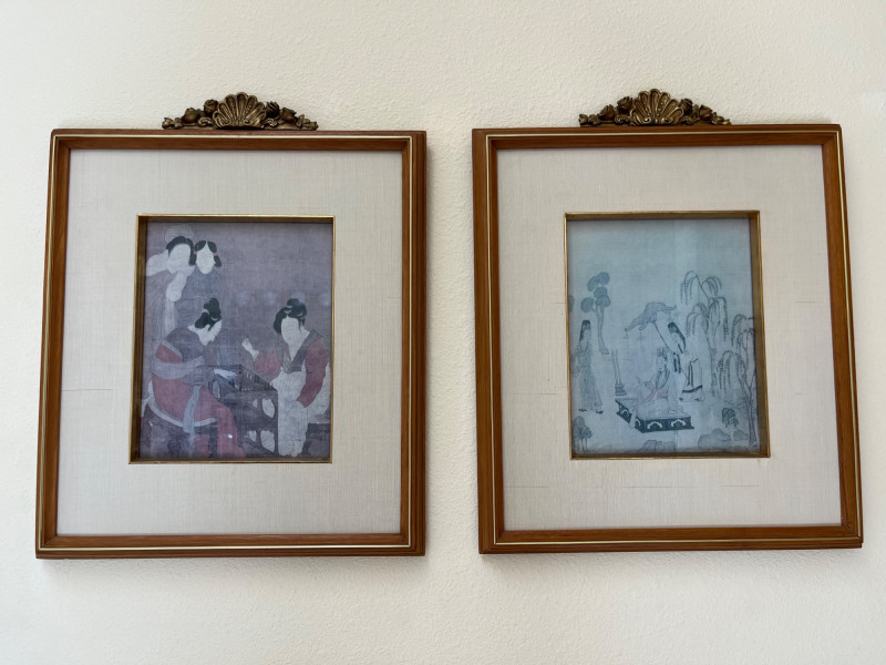 Pair of Framed Asian Prints A pair of prints presented in wood frames with brass mounts. One print, after Ladies Playing Sixes attributed to Chou Fang, shows a group of women seated around a table. The other depicts figures in a garden setting with trees, rocks, and birds. Dimensions: