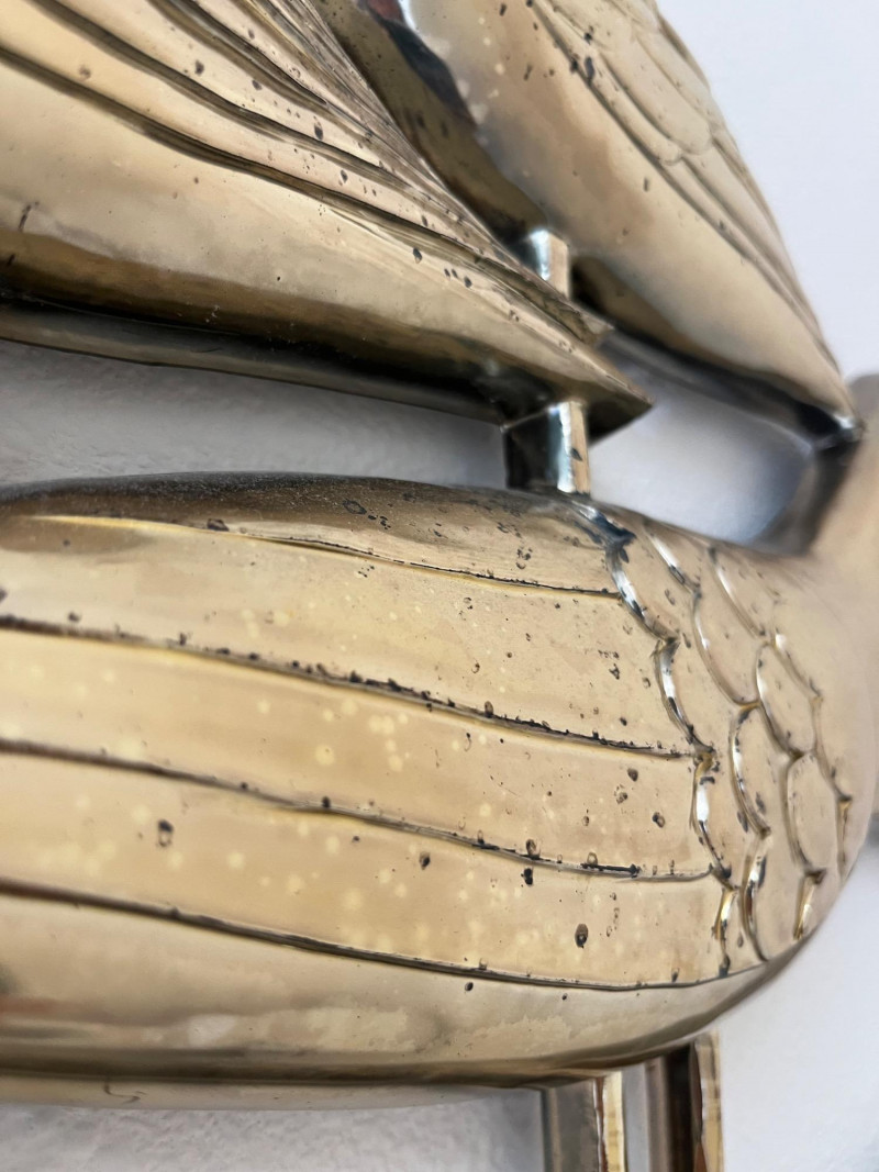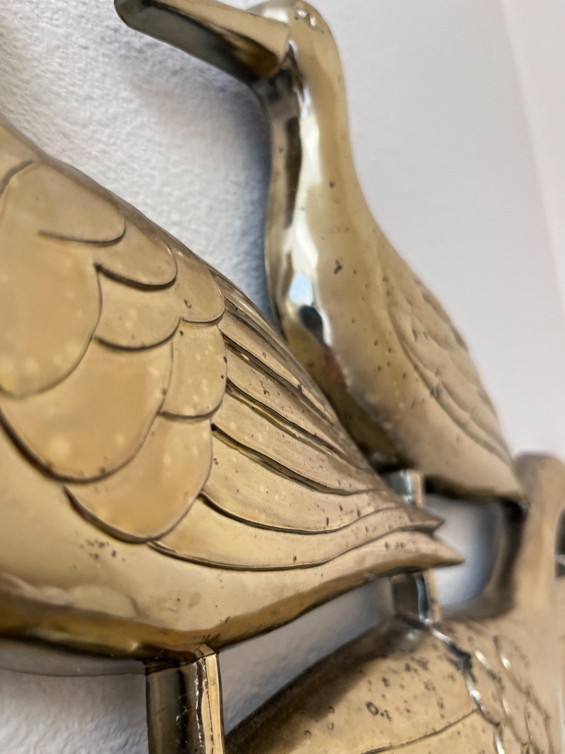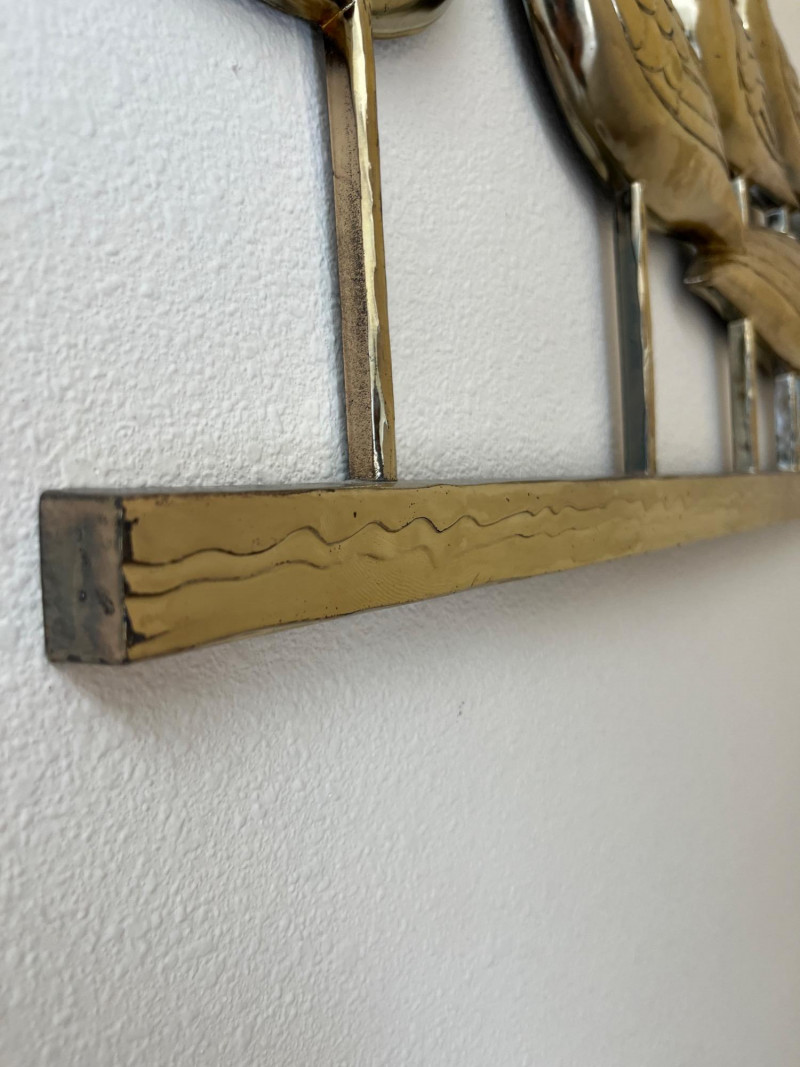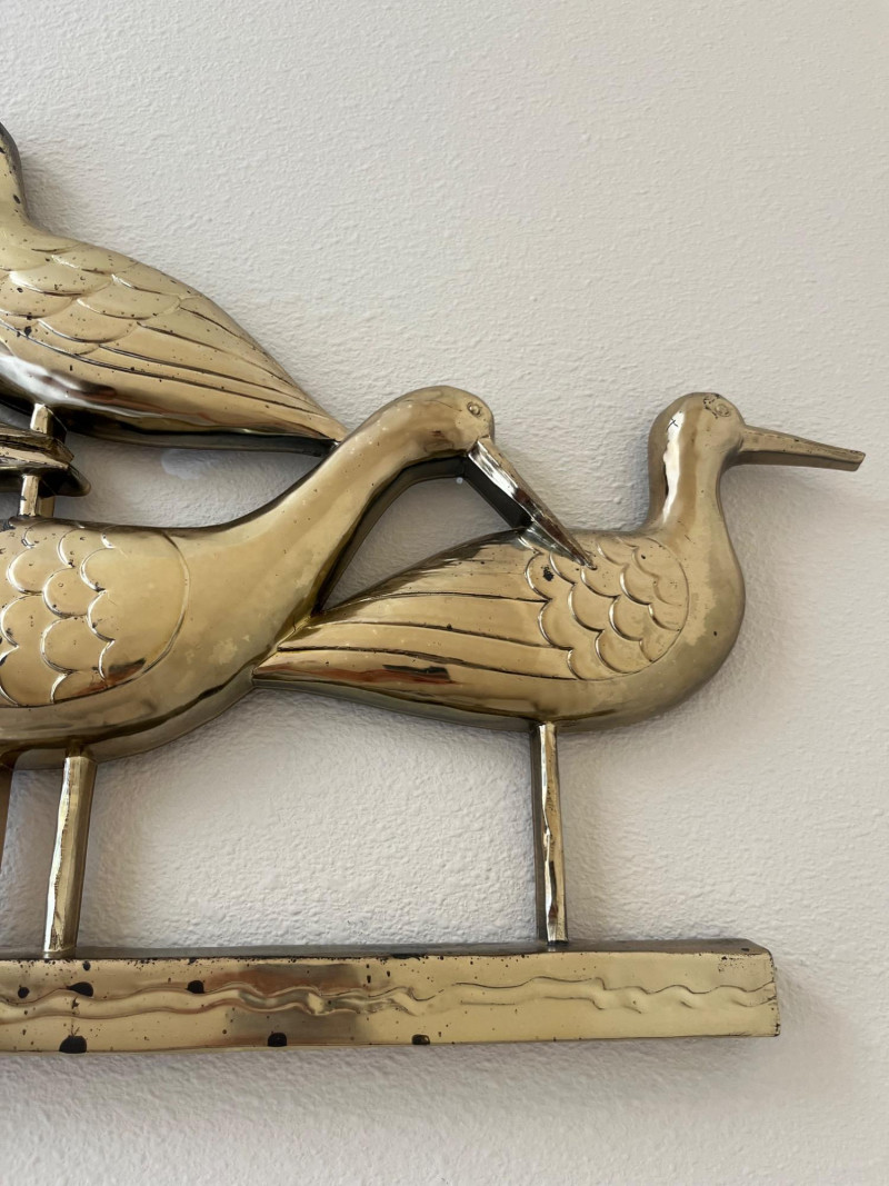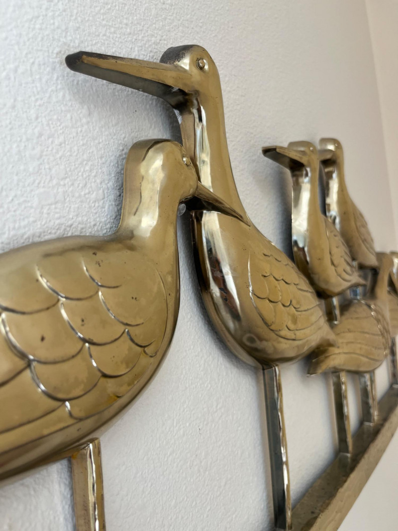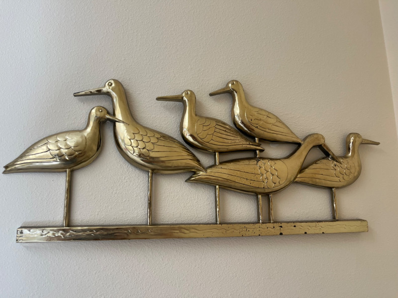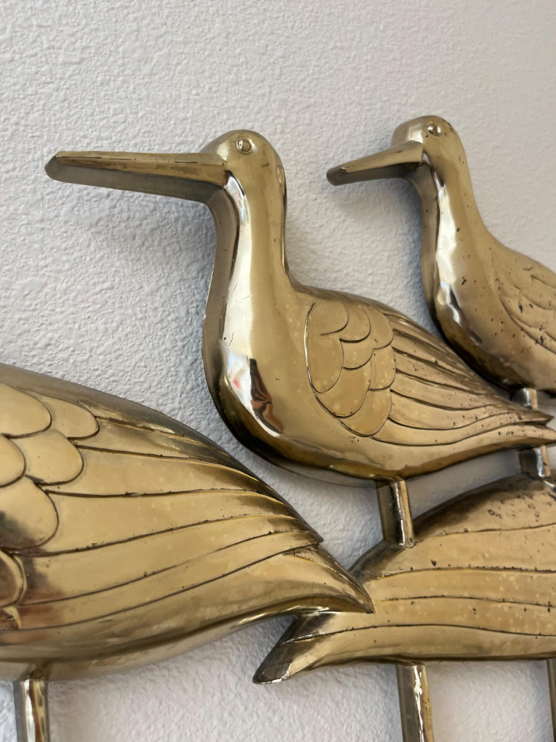 Brass Shorebird Wall Art A brass wall sculpture depicting six shorebirds in profile, aligned in a horizontal arrangement. Each bird features engraved feather and wing detailing, with variations in posture and beak direction. The birds are mounted on a shared base bar, with overlapping forms that create depth across the composition. Dimensions: 36" W x 14.75" H
