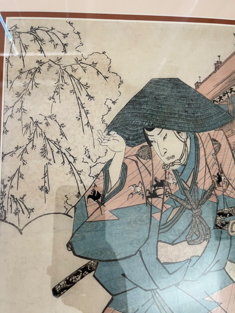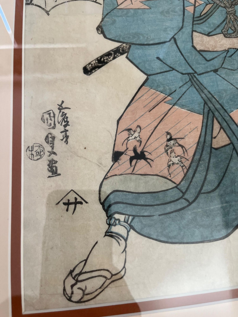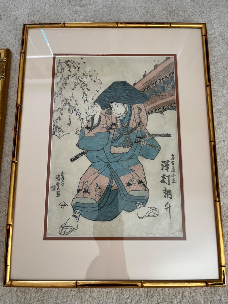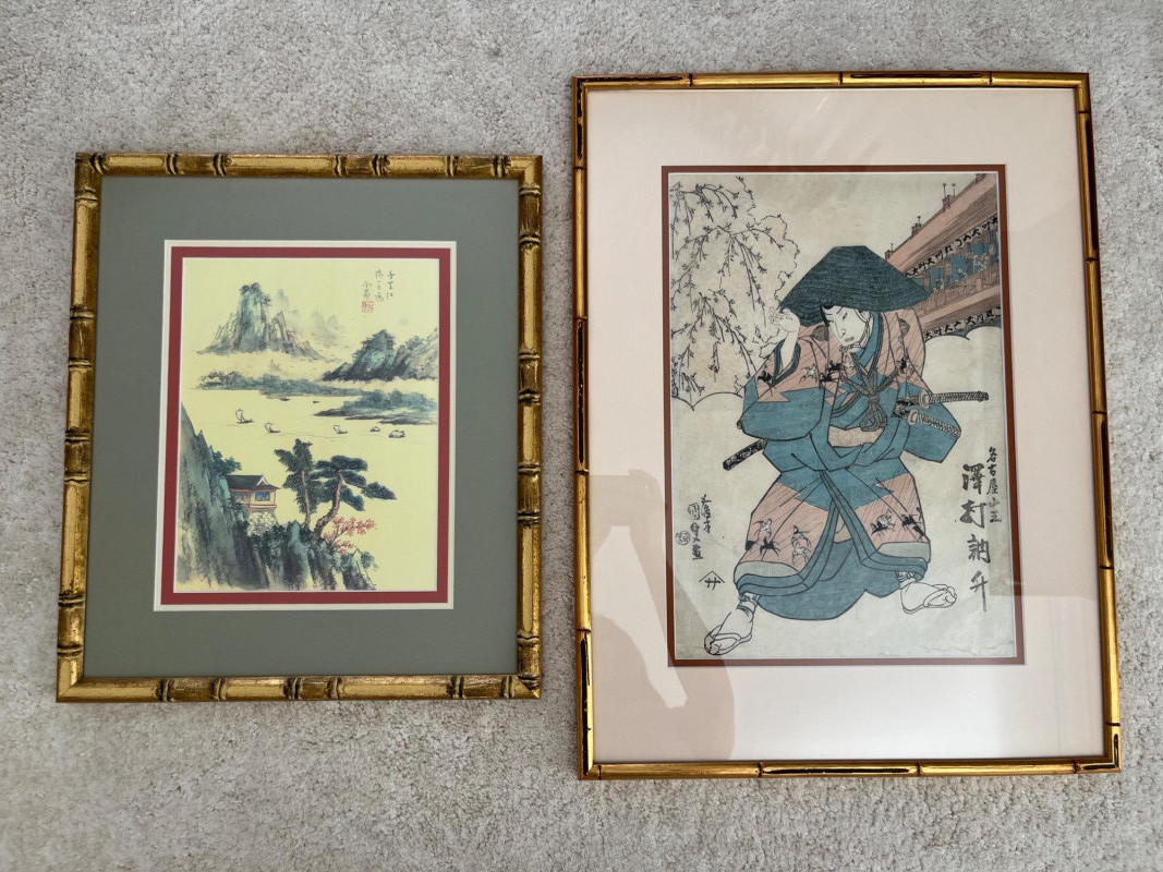 Framed Prints in the Style of Chinese and Japanese Masters A pair of framed prints. The first, in the style of traditional Chinese shan shui painting, shows a riverside scene with a structure among trees, distant boats, and layered mountain ranges. Calligraphy and seals are inscribed at the upper right. The second print, in the style of Utagawa Kuniyoshi, portrays a kabuki actor or warrior figure with drawn swords, standing before a wooden structure and tree branches. Signature and publisher markings are included. Dimensions: Landscape: 16" H x 14" W Warrior: 21" H x 16" W