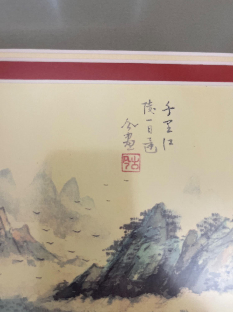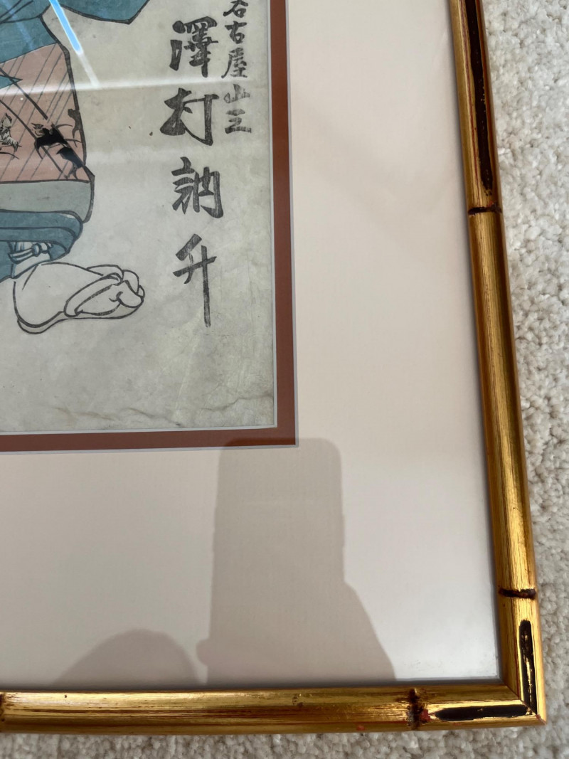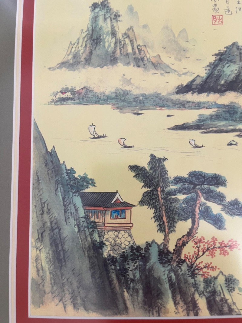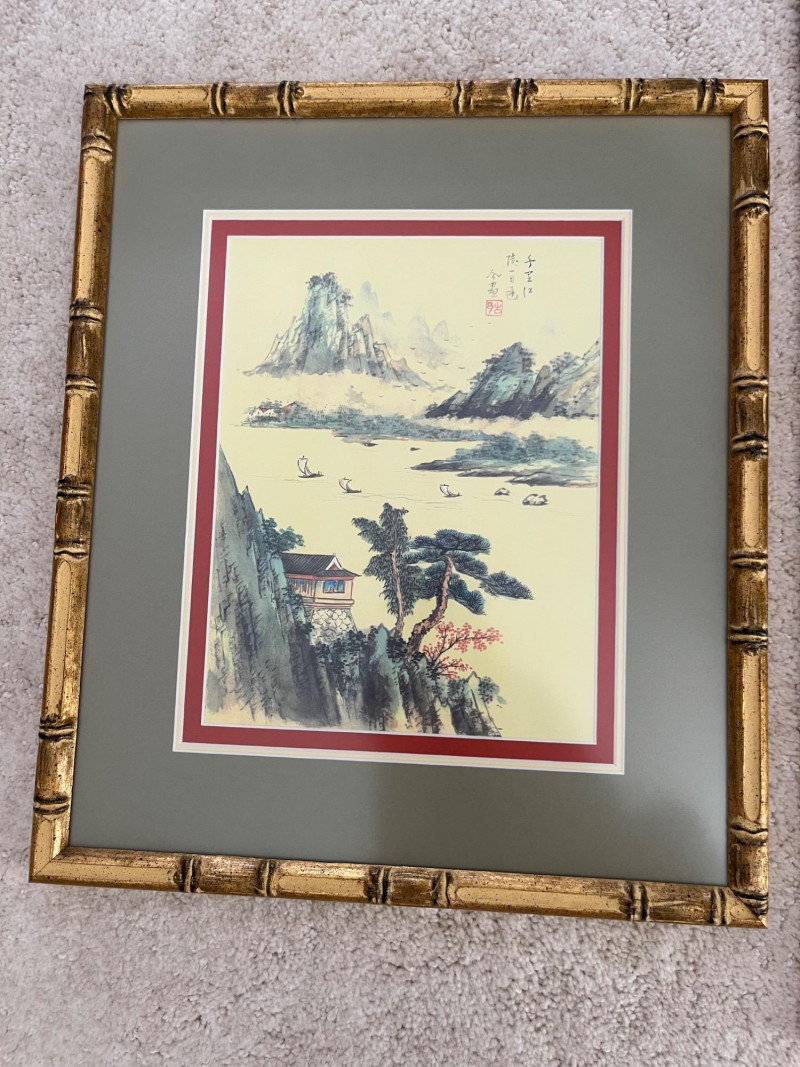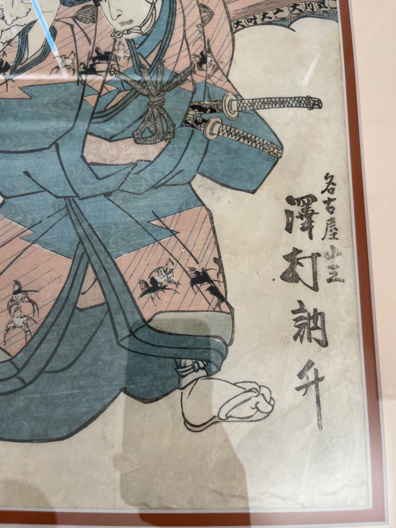 Framed Prints in the Style of Chinese and Japanese Masters A pair of framed prints. The first, in the style of traditional Chinese shan shui painting, shows a riverside scene with a structure among trees, distant boats, and layered mountain ranges. Calligraphy and seals are inscribed at the upper right. The second print, in the style of Utagawa Kuniyoshi, portrays a kabuki actor or warrior figure with drawn swords, standing before a wooden structure and tree branches. Signature and publisher markings are included. Dimensions: Landscape: 16" H x 14" W Warrior: 21" H x 16" W