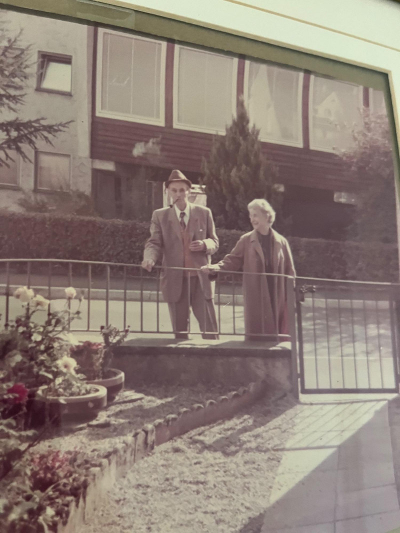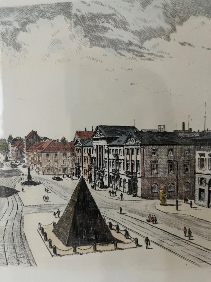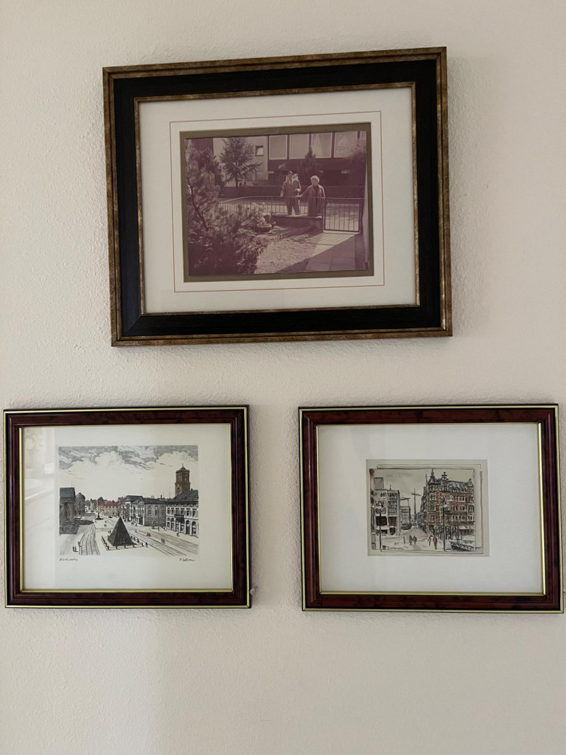 Framed Wall Artworks – Karlsruhe A grouping of three framed works displayed in a vertical and horizontal arrangement. The upper frame features a monochrome photograph showing three figures gathered near a raised planter in a paved courtyard, with trees and a building in the background. Below are two ink and watercolor cityscapes, both labeled Karlsruhe. The left image depicts a wide urban square with surrounding architecture and a central installation. The right image presents a street view with figures walking among buildings, marked with the city name and numbering at the bottom edge. Dimensions (with frames):
