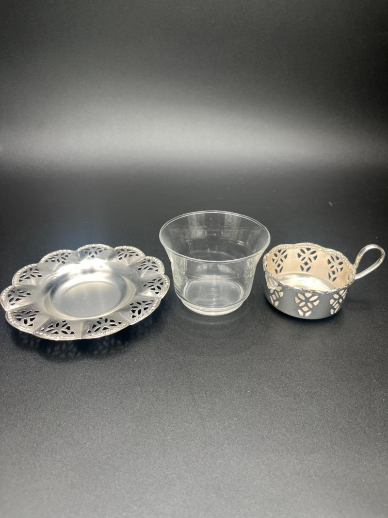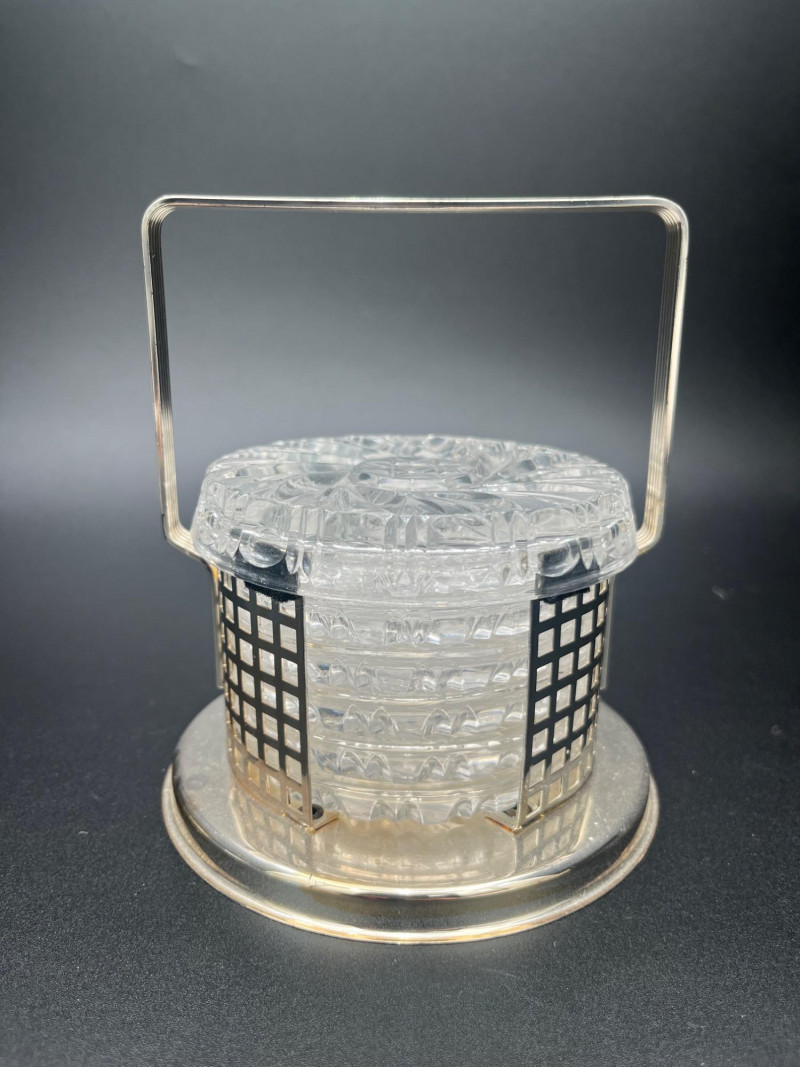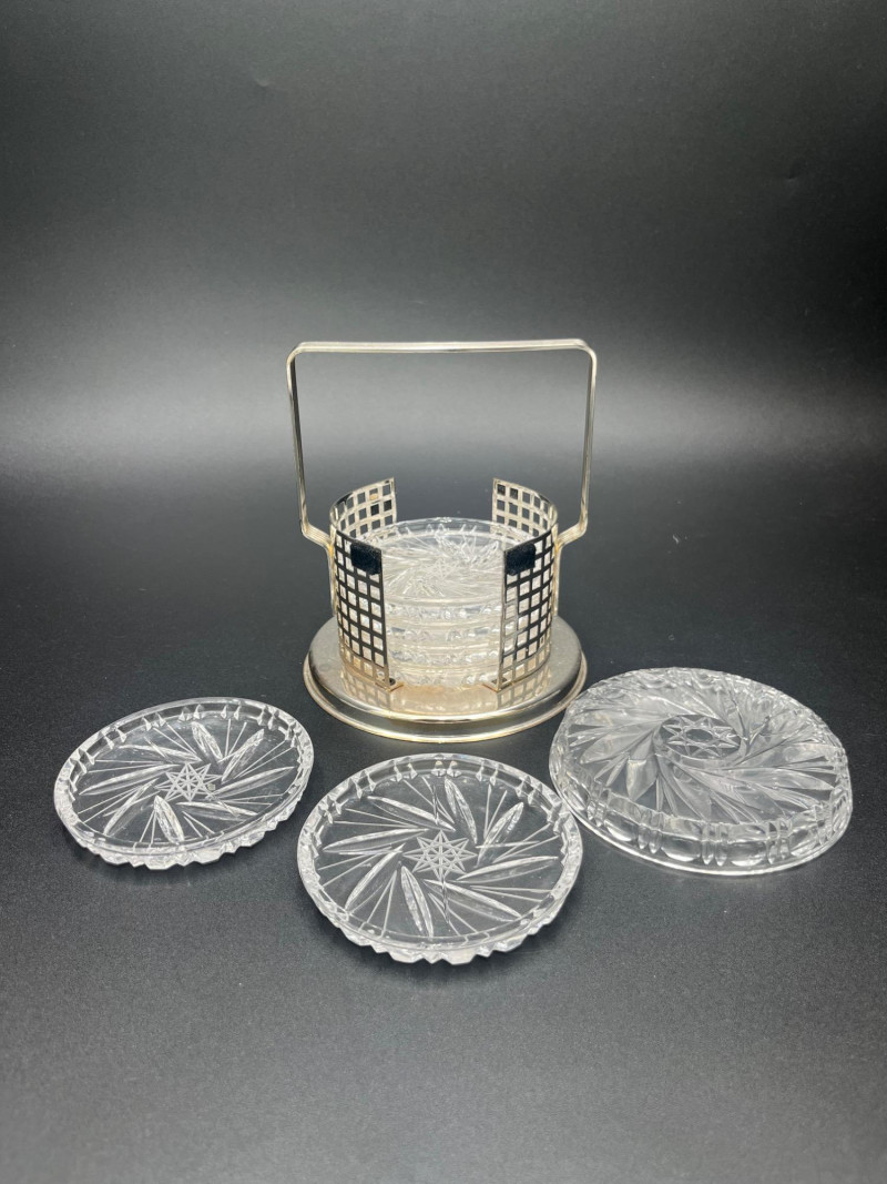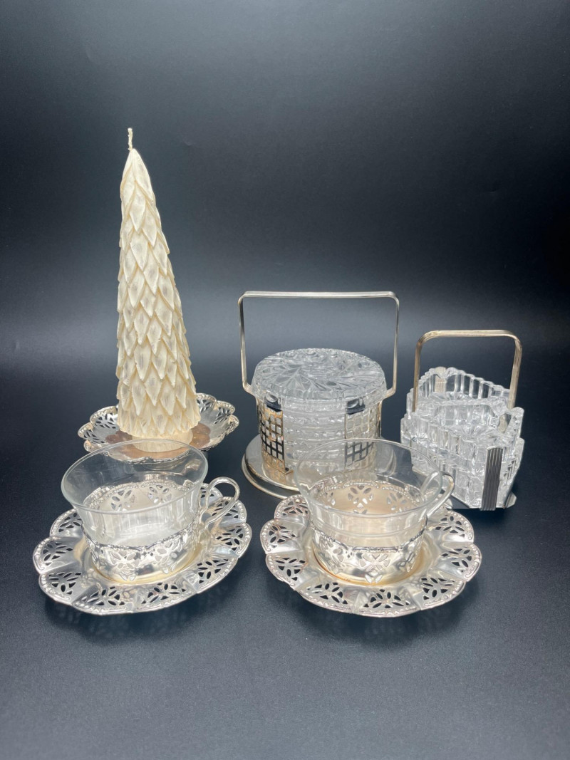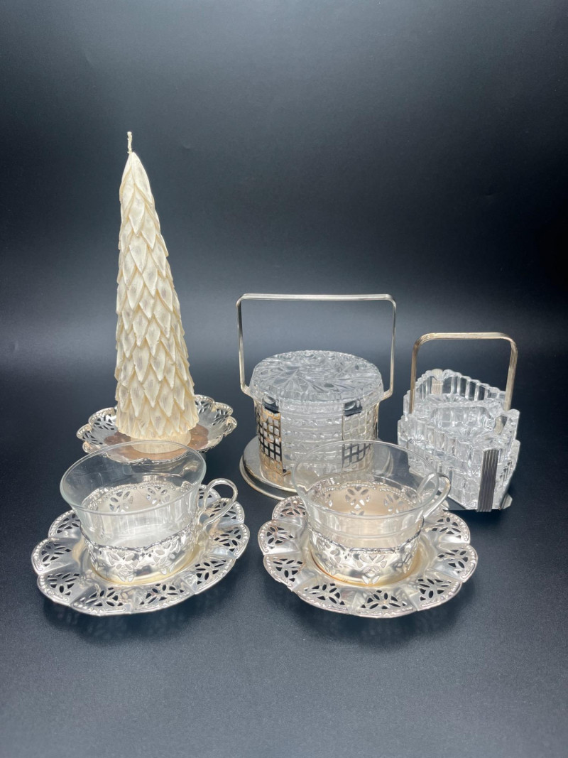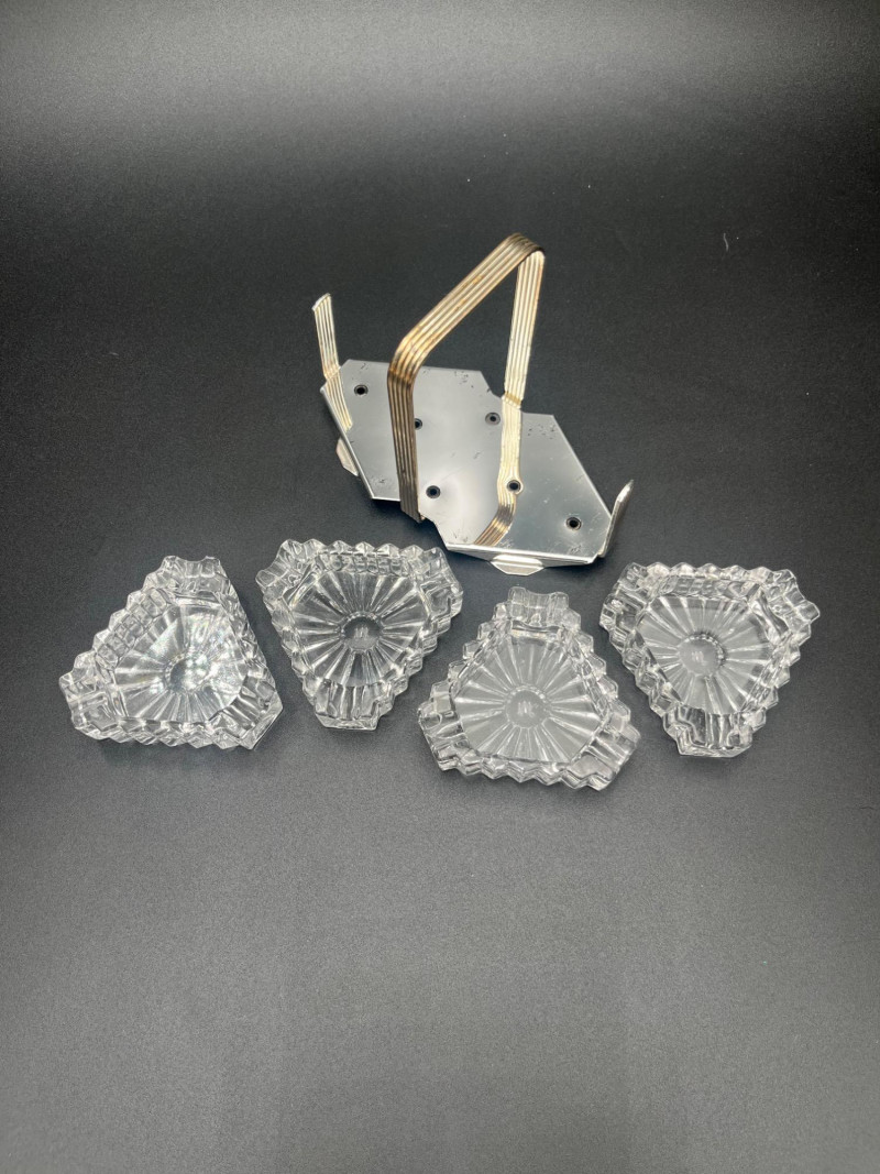 Art Deco Ashtray Set, Crystal Coasters & Taper Candle on Silver Base An assortment of pressed glass and silver-tone table accessories. Included is a set of three triangular pressed glass ashtrays with ribbed sunburst bases, housed in a stacking metal holder with upright handle. Also included are six round pressed glass coasters with radiating starburst patterns and notched edges, in the style of Bohemian or Brunswick crystal. A molded taper candle with layered surface detail is presented on a round silver-tone metal base with pierced floral edging. The group also includes two clear glass teacups with flared rims, each fitted in pierced metal holders with matching saucers, and three additional pressed glass containers—cylindrical, rectangular, and round—each set in a handled metal frame. Measurements (approx.): Candle: 10.5" H x 5" W Cups: 5.25" base diameter, 3" handle width, 3.5" top diameter, 2.5" H (glass) Round coasters: 5.5" diameter Triangular ashtrays: 4.5" H x 6" W