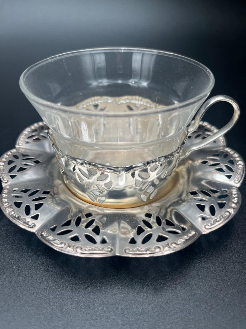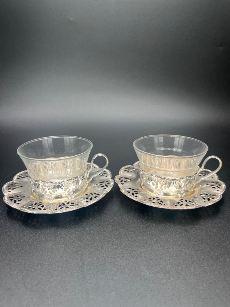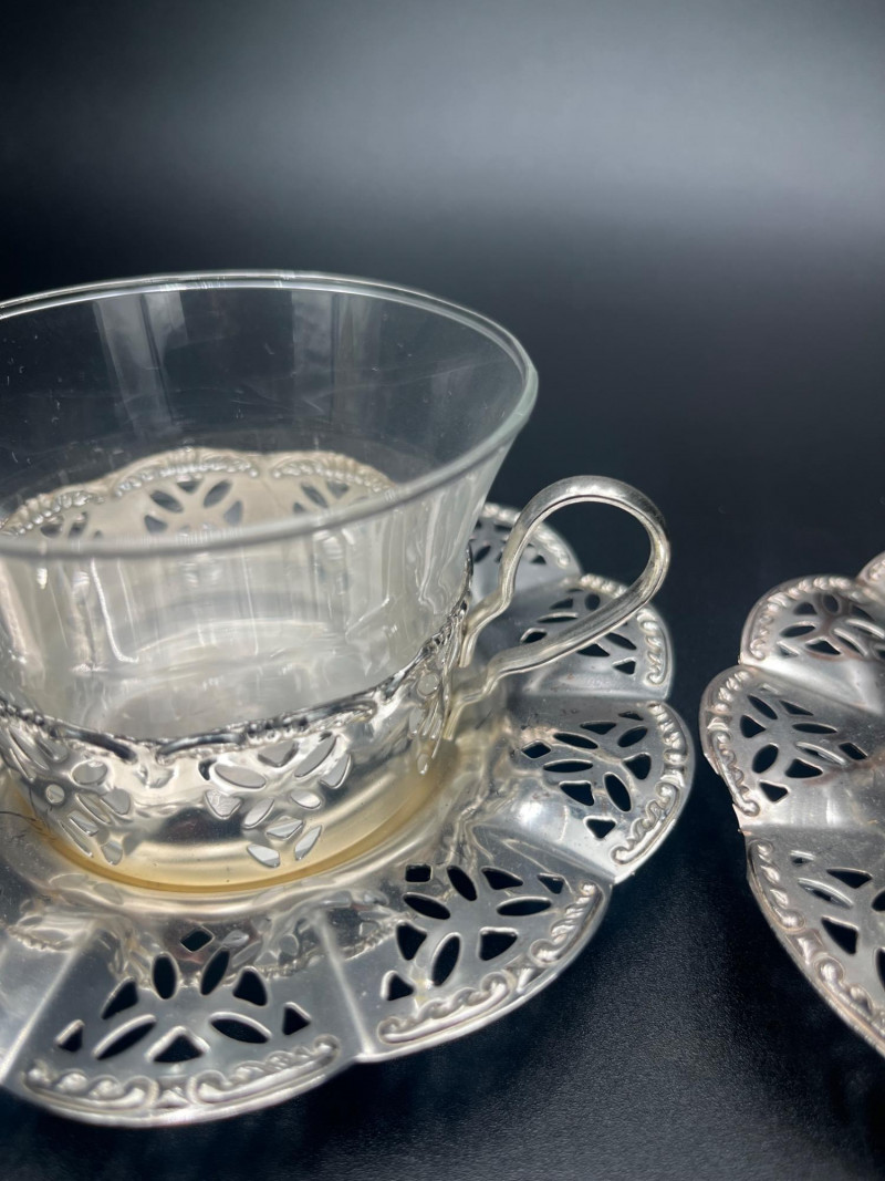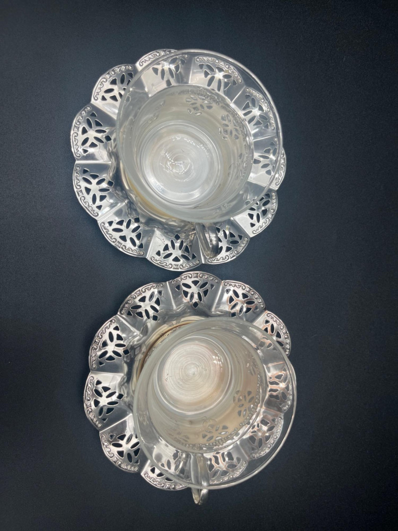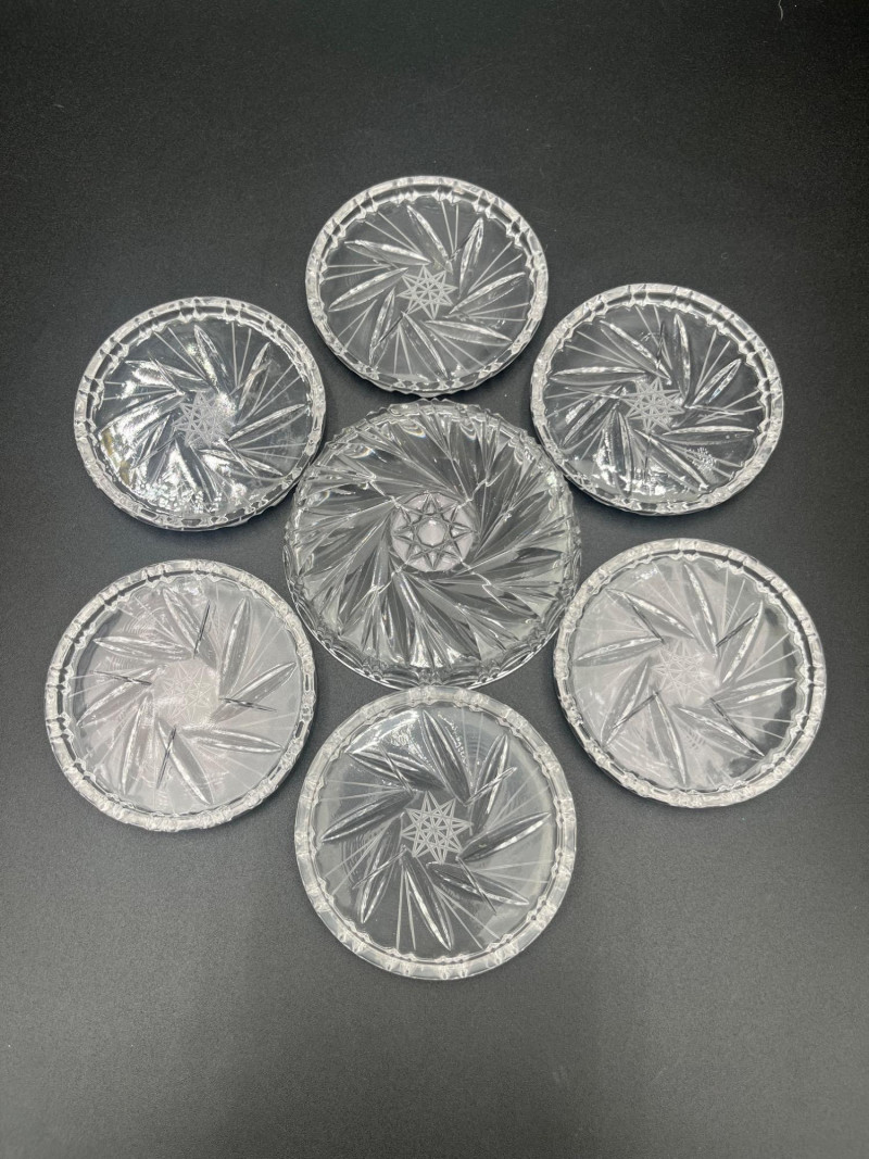 Art Deco Ashtray Set, Crystal Coasters & Taper Candle on Silver Base An assortment of pressed glass and silver-tone table accessories. Included is a set of three triangular pressed glass ashtrays with ribbed sunburst bases, housed in a stacking metal holder with upright handle. Also included are six round pressed glass coasters with radiating starburst patterns and notched edges, in the style of Bohemian or Brunswick crystal. A molded taper candle with layered surface detail is presented on a round silver-tone metal base with pierced floral edging. The group also includes two clear glass teacups with flared rims, each fitted in pierced metal holders with matching saucers, and three additional pressed glass containers—cylindrical, rectangular, and round—each set in a handled metal frame. Measurements (approx.): Candle: 10.5" H x 5" W Cups: 5.25" base diameter, 3" handle width, 3.5" top diameter, 2.5" H (glass) Round coasters: 5.5" diameter Triangular ashtrays: 4.5" H x 6" W