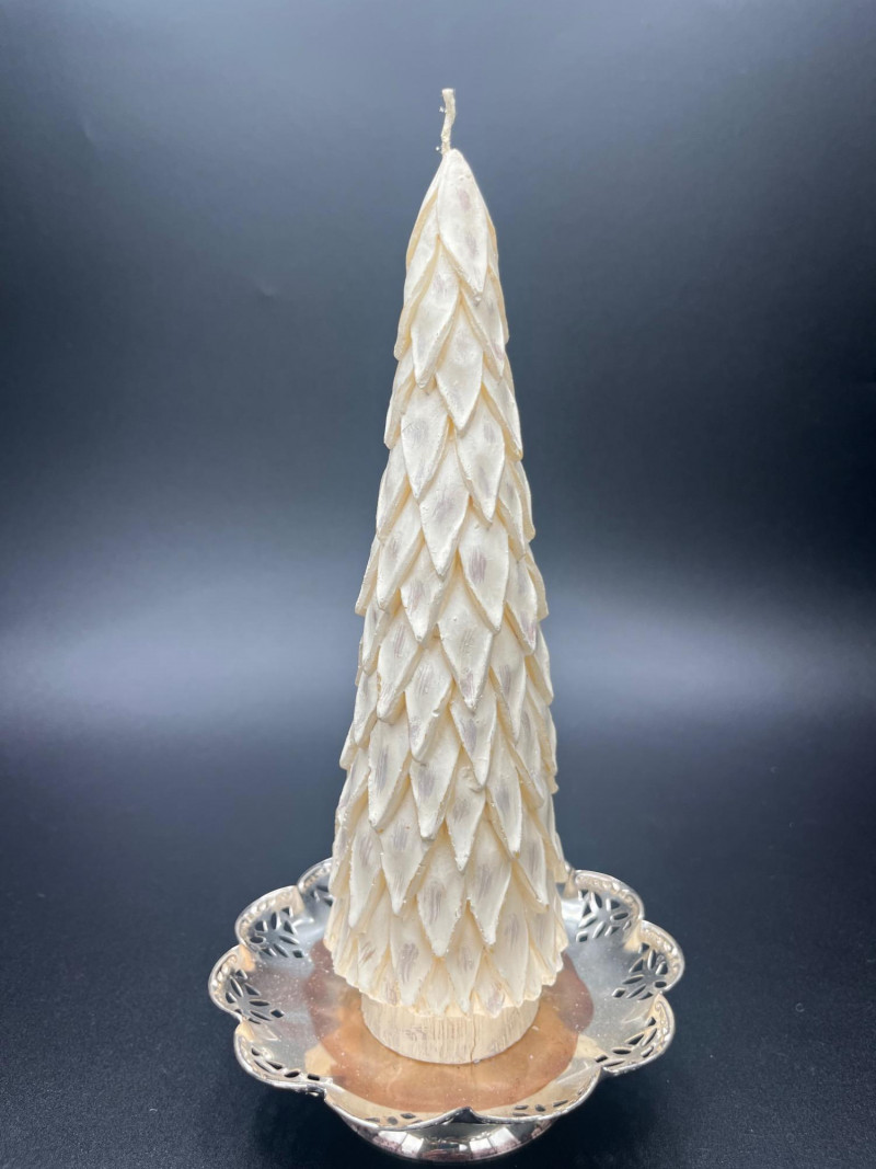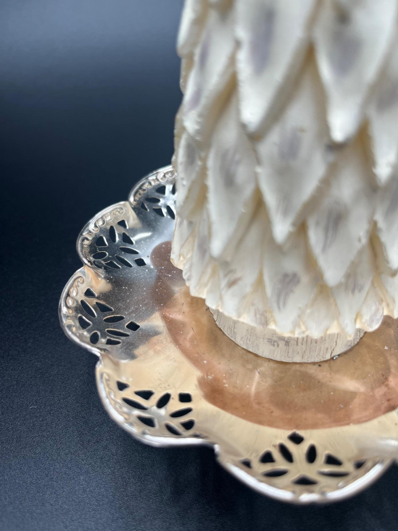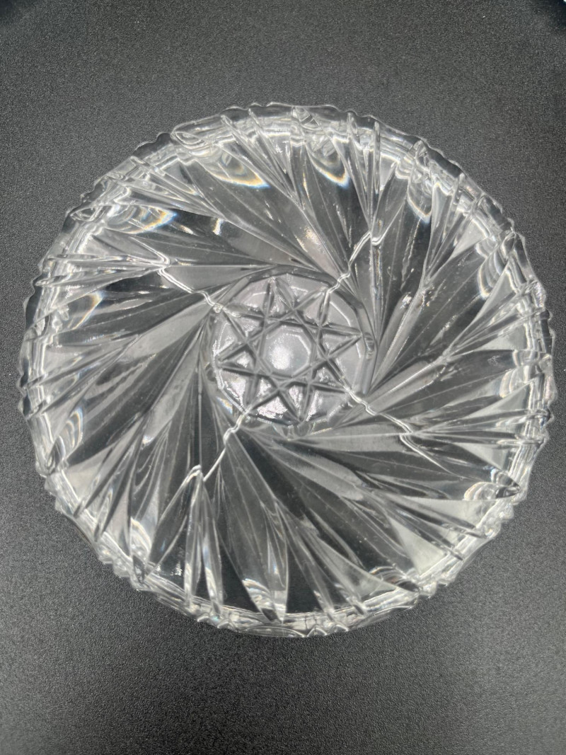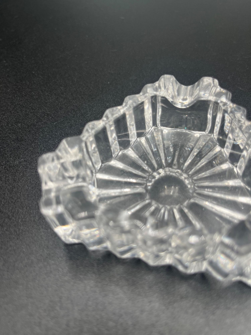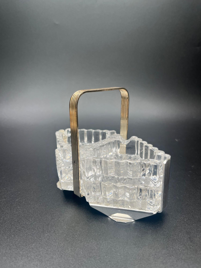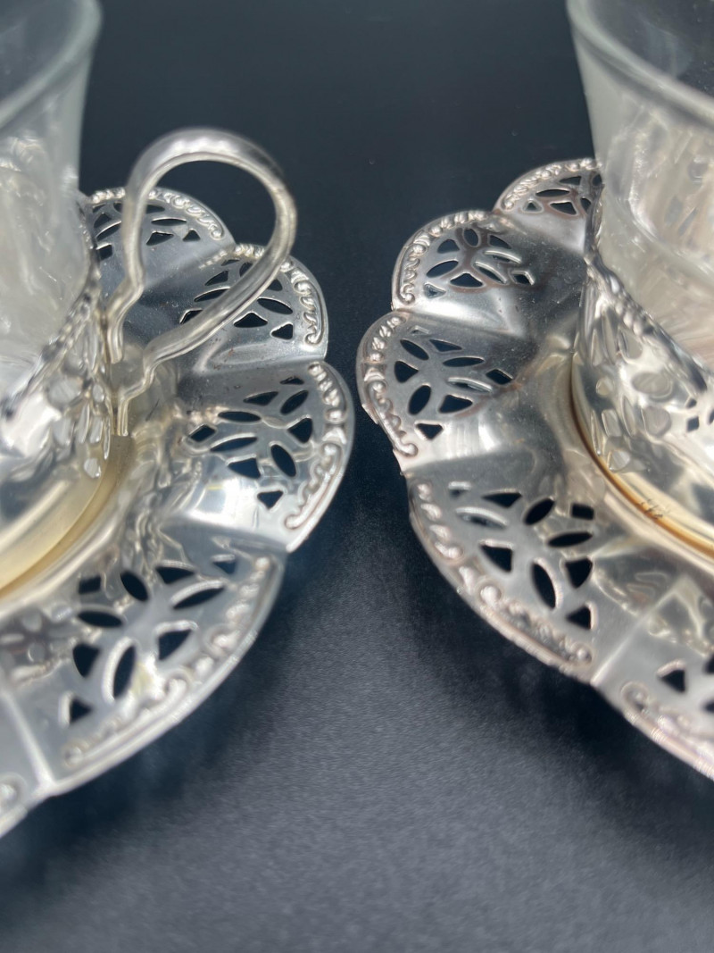 Art Deco Ashtray Set, Crystal Coasters & Taper Candle on Silver Base An assortment of pressed glass and silver-tone table accessories. Included is a set of three triangular pressed glass ashtrays with ribbed sunburst bases, housed in a stacking metal holder with upright handle. Also included are six round pressed glass coasters with radiating starburst patterns and notched edges, in the style of Bohemian or Brunswick crystal. A molded taper candle with layered surface detail is presented on a round silver-tone metal base with pierced floral edging. The group also includes two clear glass teacups with flared rims, each fitted in pierced metal holders with matching saucers, and three additional pressed glass containers—cylindrical, rectangular, and round—each set in a handled metal frame. Measurements (approx.): Candle: 10.5" H x 5" W Cups: 5.25" base diameter, 3" handle width, 3.5" top diameter, 2.5" H (glass) Round coasters: 5.5" diameter Triangular ashtrays: 4.5" H x 6" W