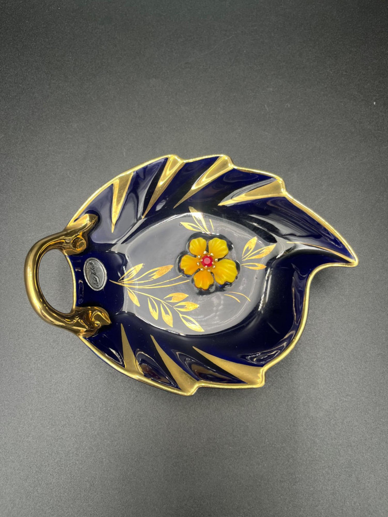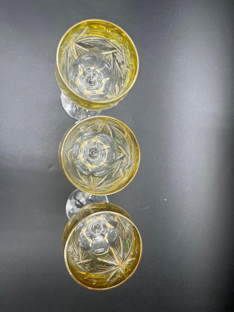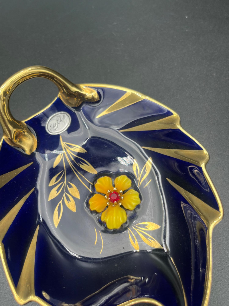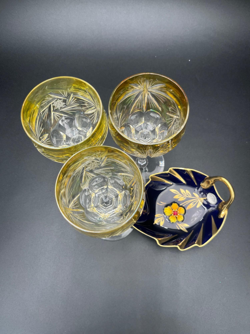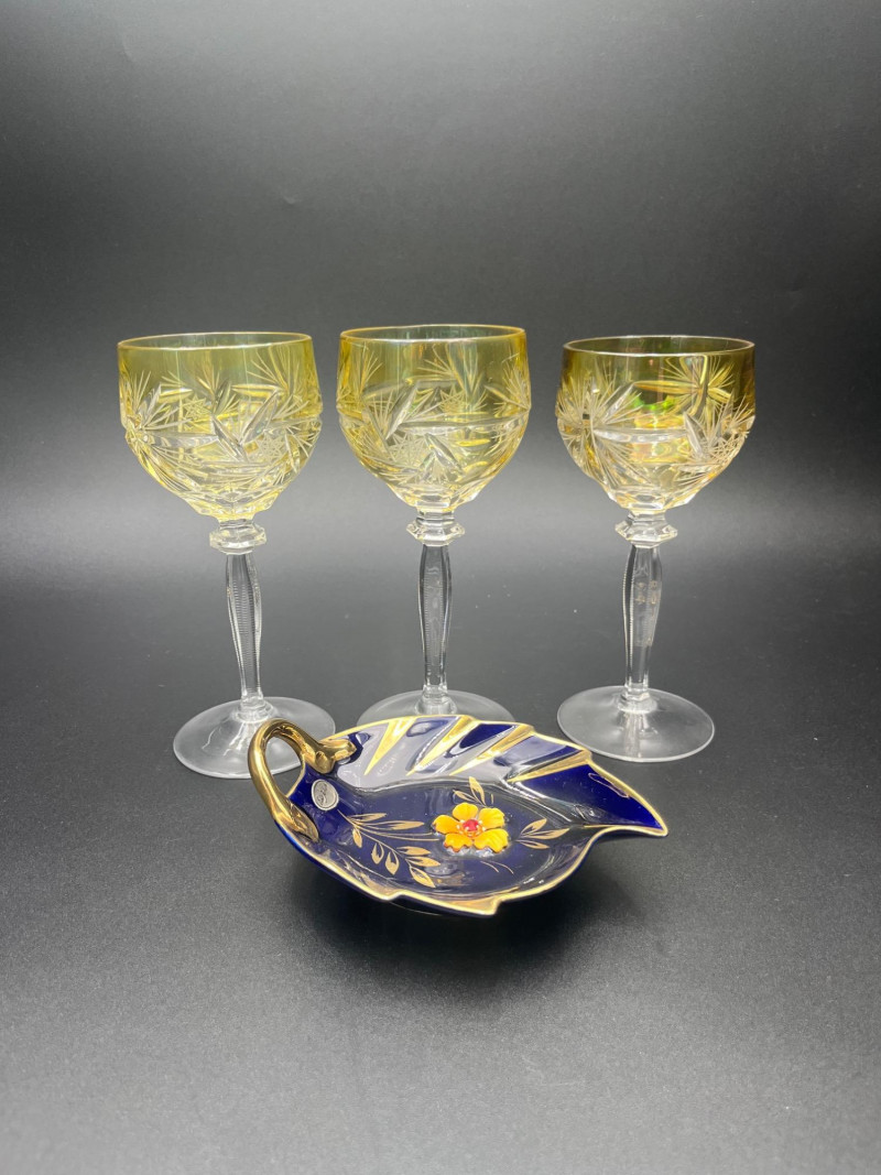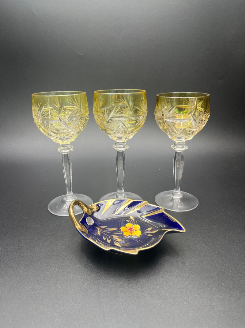 Bohemian Cut Crystal Hock Glasses and Ges. Gesch Cobalt Blue Dish A set of three Bohemian cut crystal hock wine glasses with yellow overlay bowls, each decorated with cut patterns and set on clear ribbed stems. Paired with a cobalt blue porcelain leaf-shaped dish featuring a floral motif, gilt detailing, and a gilt handle. The dish bears an “Echt Kobalt” label and a “Ges. Gesch.” mark, denoting registered German design. Measurements: