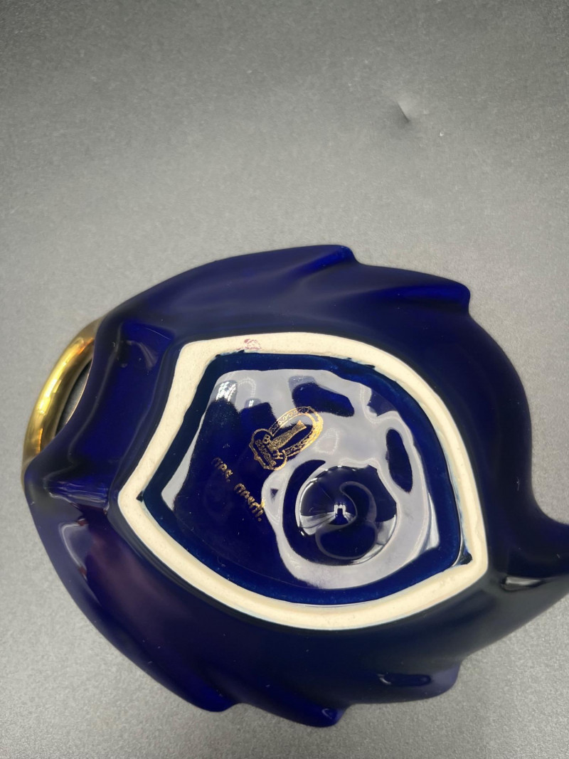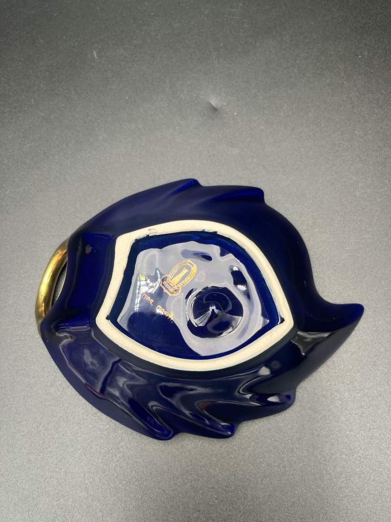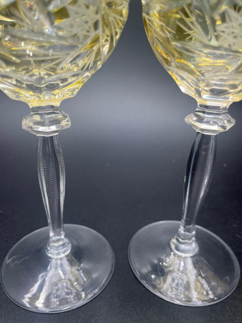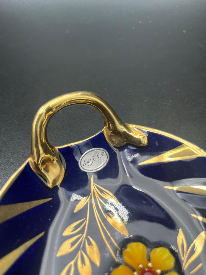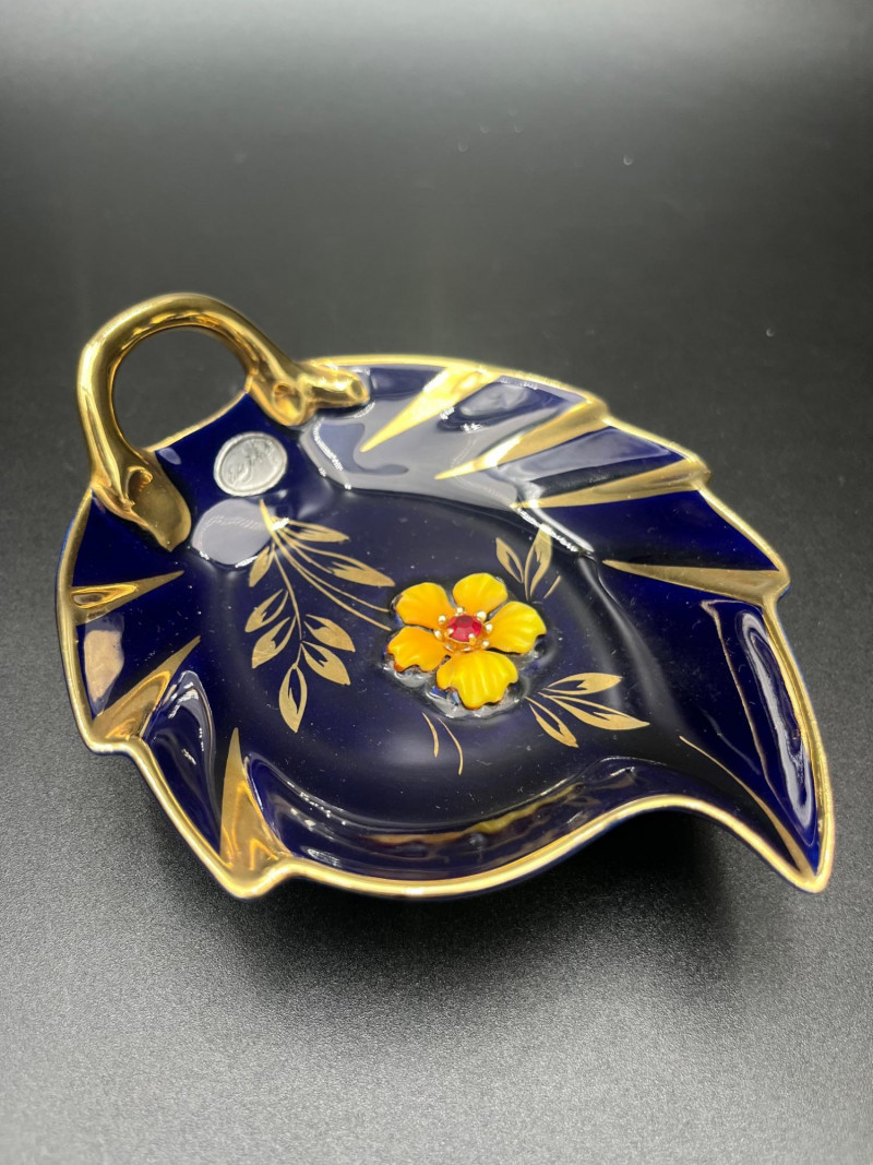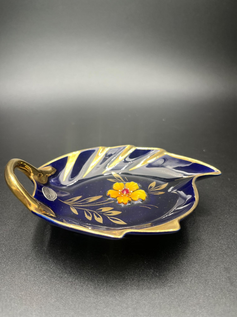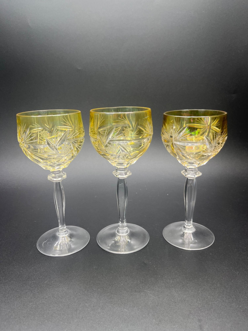 Bohemian Cut Crystal Hock Glasses and Ges. Gesch Cobalt Blue Dish A set of three Bohemian cut crystal hock wine glasses with yellow overlay bowls, each decorated with cut patterns and set on clear ribbed stems. Paired with a cobalt blue porcelain leaf-shaped dish featuring a floral motif, gilt detailing, and a gilt handle. The dish bears an “Echt Kobalt” label and a “Ges. Gesch.” mark, denoting registered German design. Measurements: