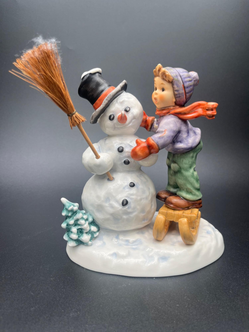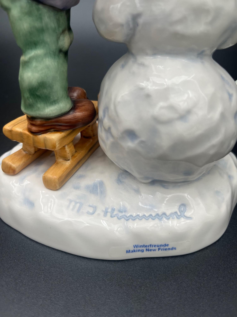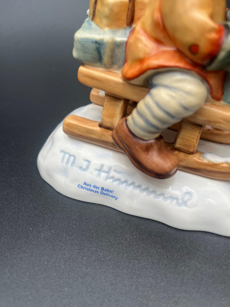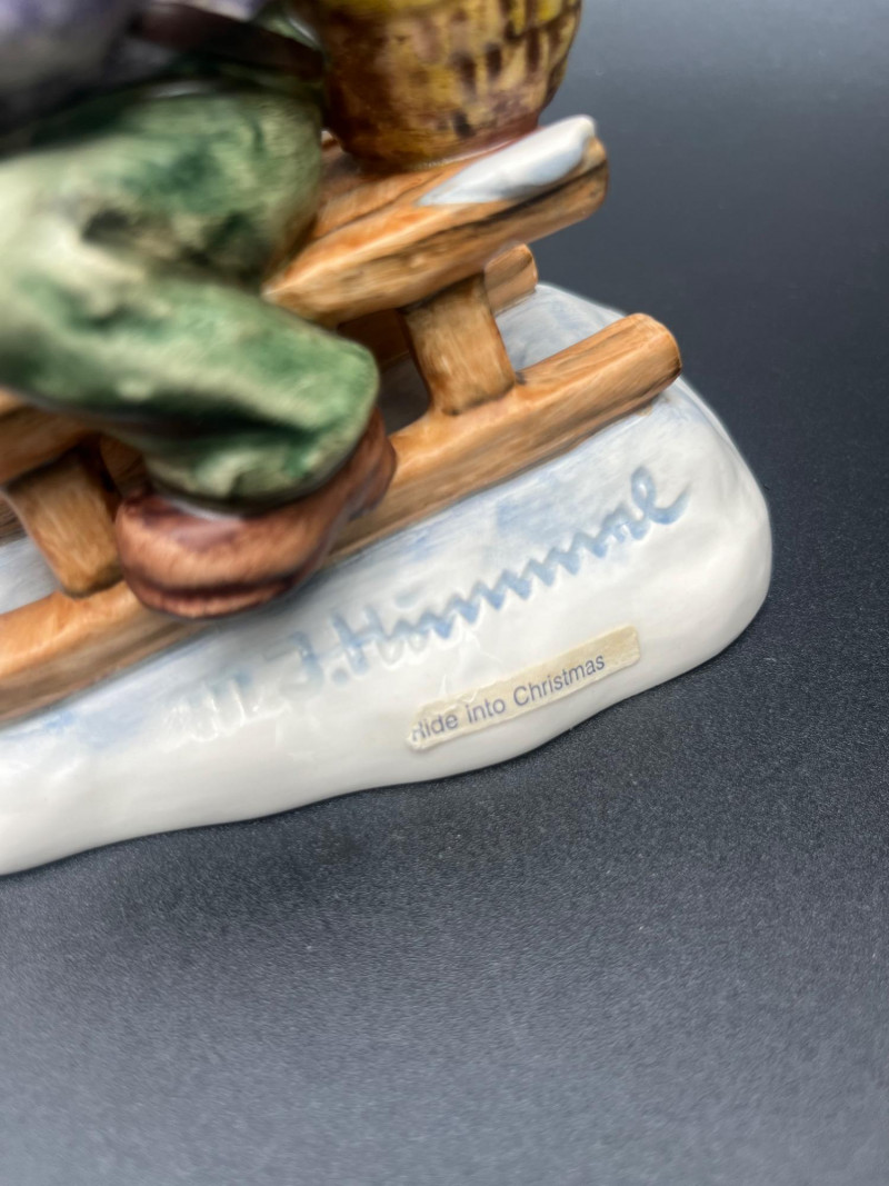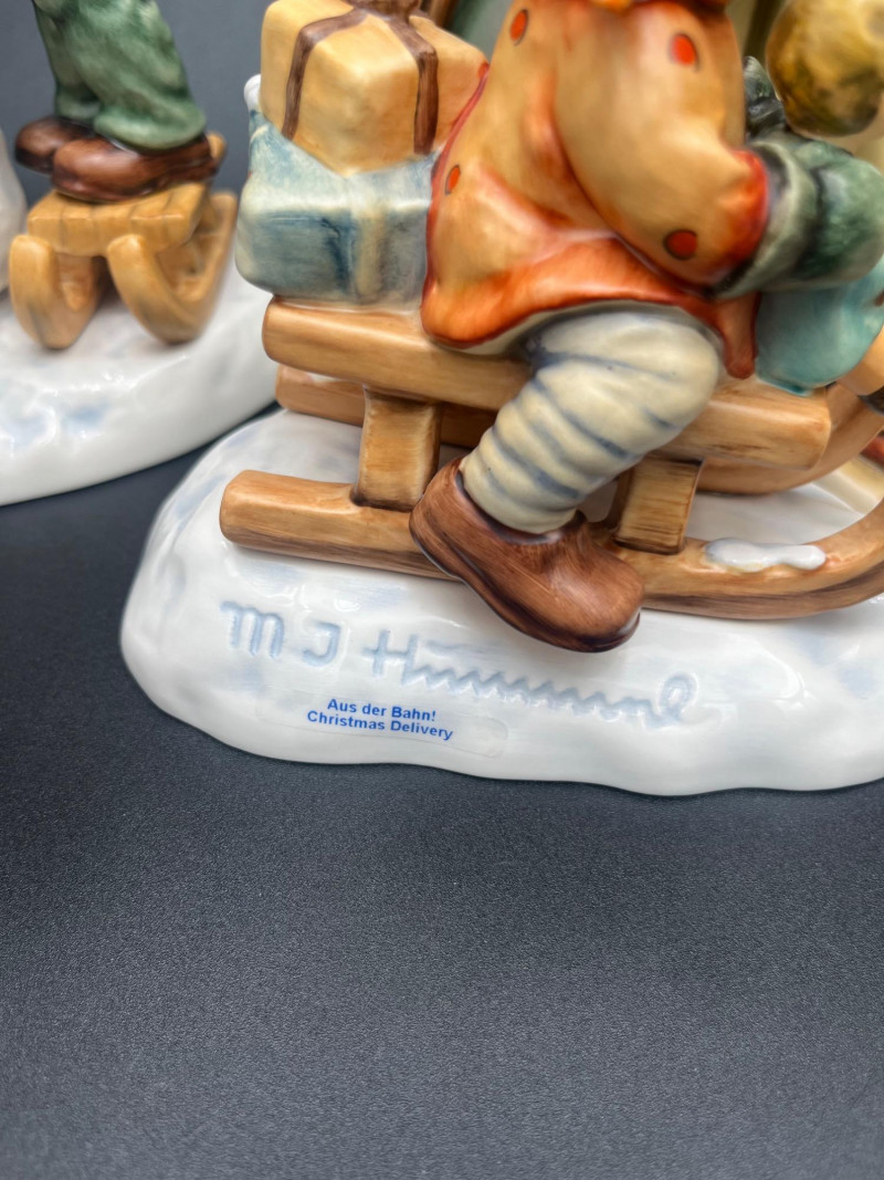 Delight in this charming collection of Goebel Hummel Christmas figurines, featuring a joyful winter wonderland of hand-painted ceramic characters. Made in Germany and ranging in size from approximately 3.5" to 7.5" tall, this beautifully curated set includes sleigh-riding children, angelic musicians, festive trees, snowmen, and heartwarming nativity scenes. Many of the figurines are from limited or first edition releases, including pieces like “Christmas Surprise” HUM 536/3/0 and “Winter Message” First Issue 1997. Several pieces are artist signed, and all bear the classic Goebel Germany backstamp, signifying their authenticity and collectible status. This is a must-have ensemble for serious collectors or holiday decorators looking to add timeless, high-quality charm to their seasonal displays. Condition: No visible chips or cracks.