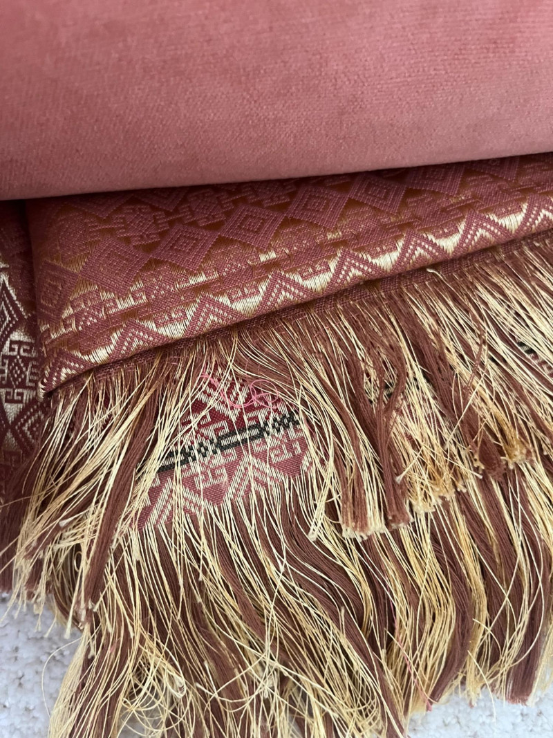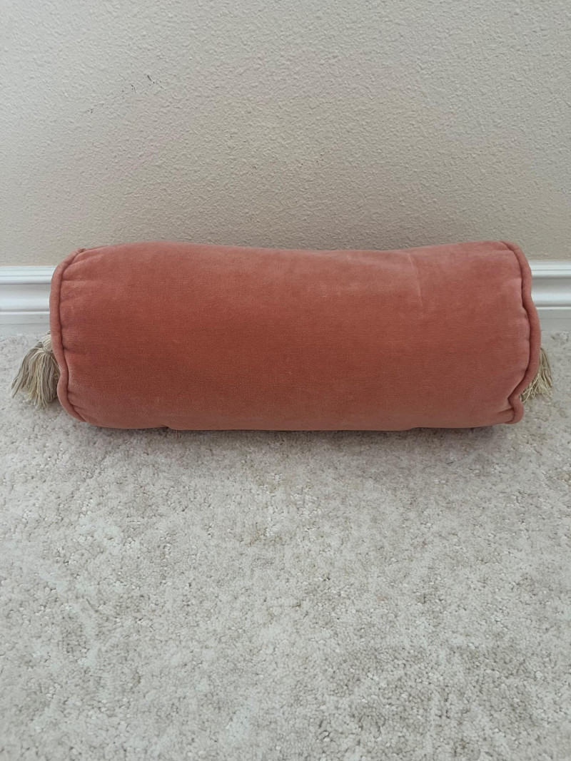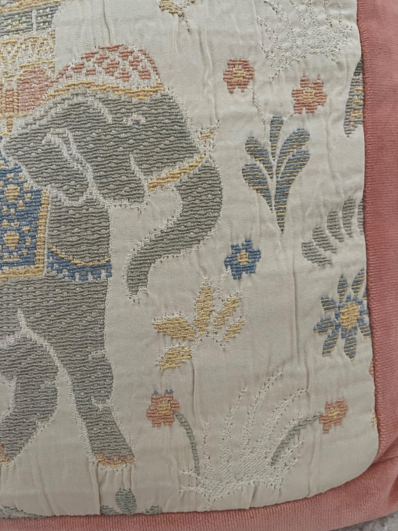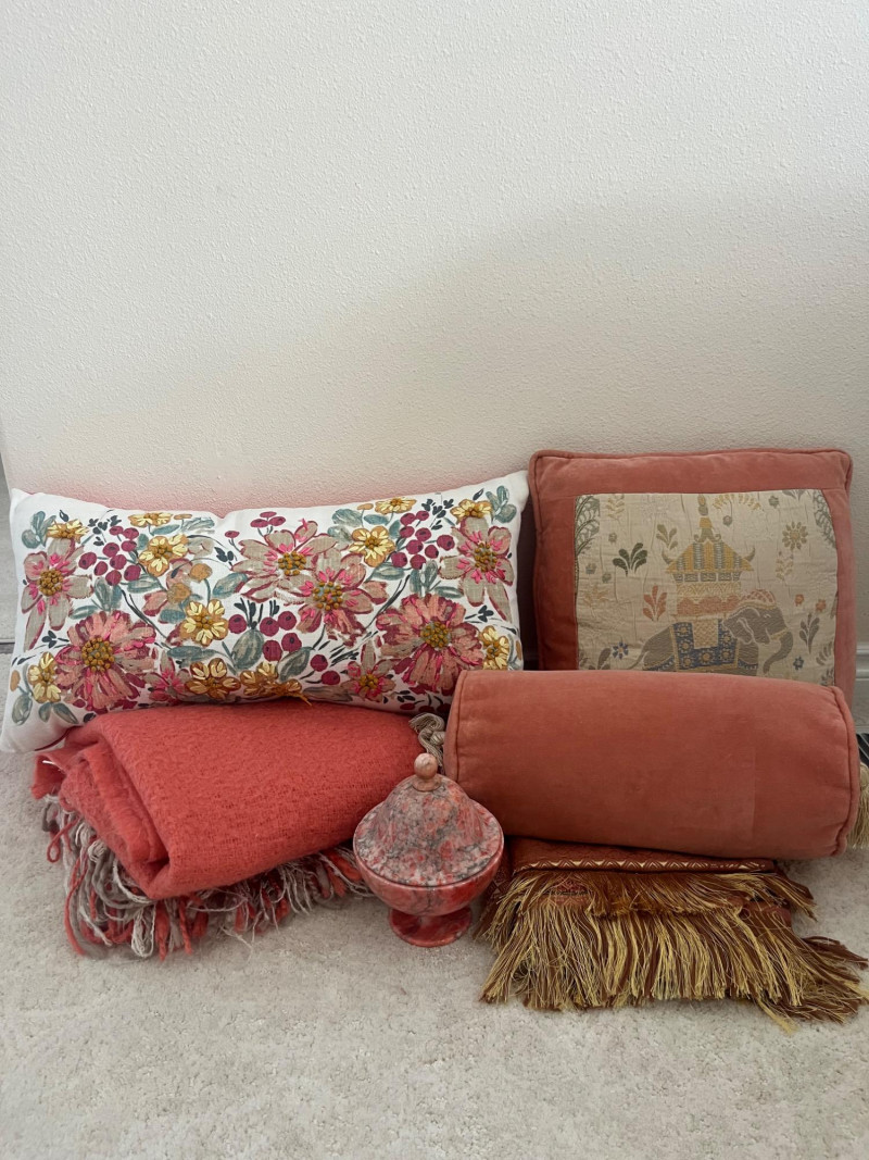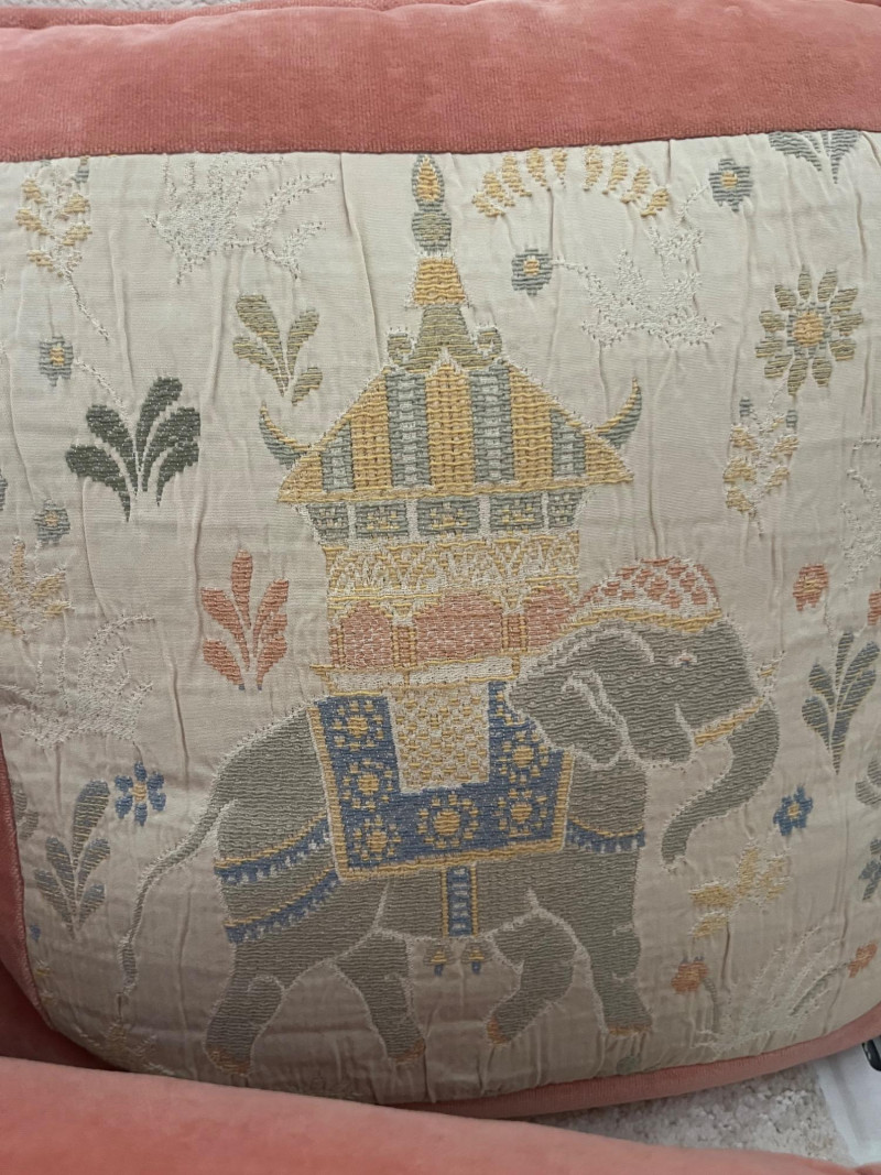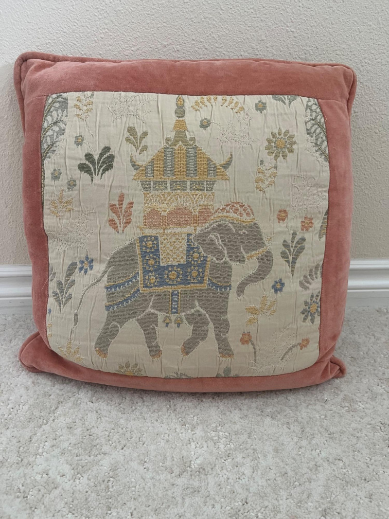 Textile and Decor Ensemble with Stone Jar A collection of soft furnishings and decor featuring coordinated tones and varied textures. Included are a long rectangular pillow with floral embroidery, a cylindrical pillow with tassels on both ends, and a square pillow with an elephant tapestry panel framed by solid fabric. A loosely woven pink blanket with fringe is paired with a second textile displaying geometric patterns and long fringe. Completing the group is a lidded stone jar formed with a footed base, rounded bowl, and domed lid topped with a knob finial. Dimensions: Long floral pillow: 25" W x 13" D Cylinder pillow (excluding tassels): 16" W x 6.75" diameter Elephant pillow: 16" H x 16" W Pink blanket: 79" L x 50" W Patterned textile with fringe: 75.25" L x 39.5" W Lidded stone jar: 8" H x 5.5" diam