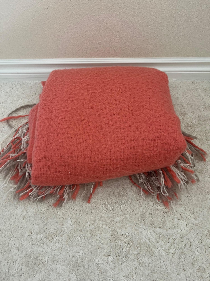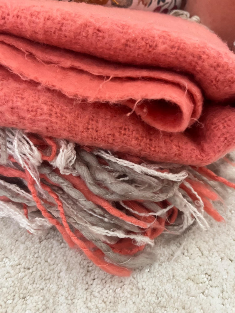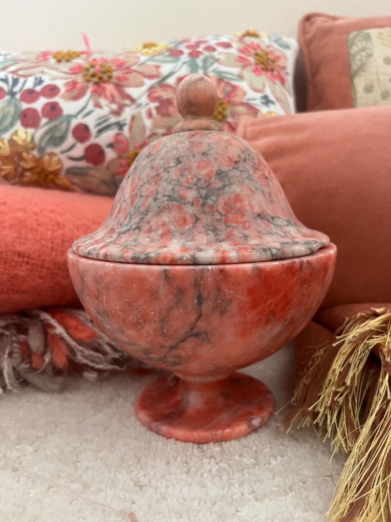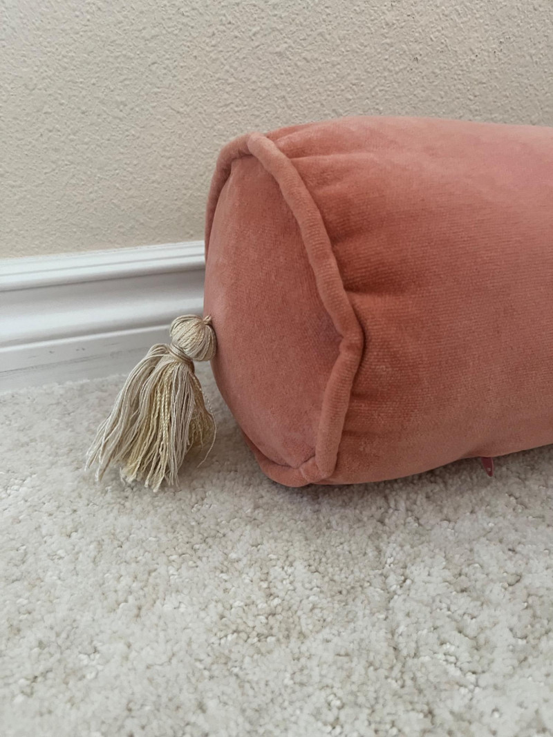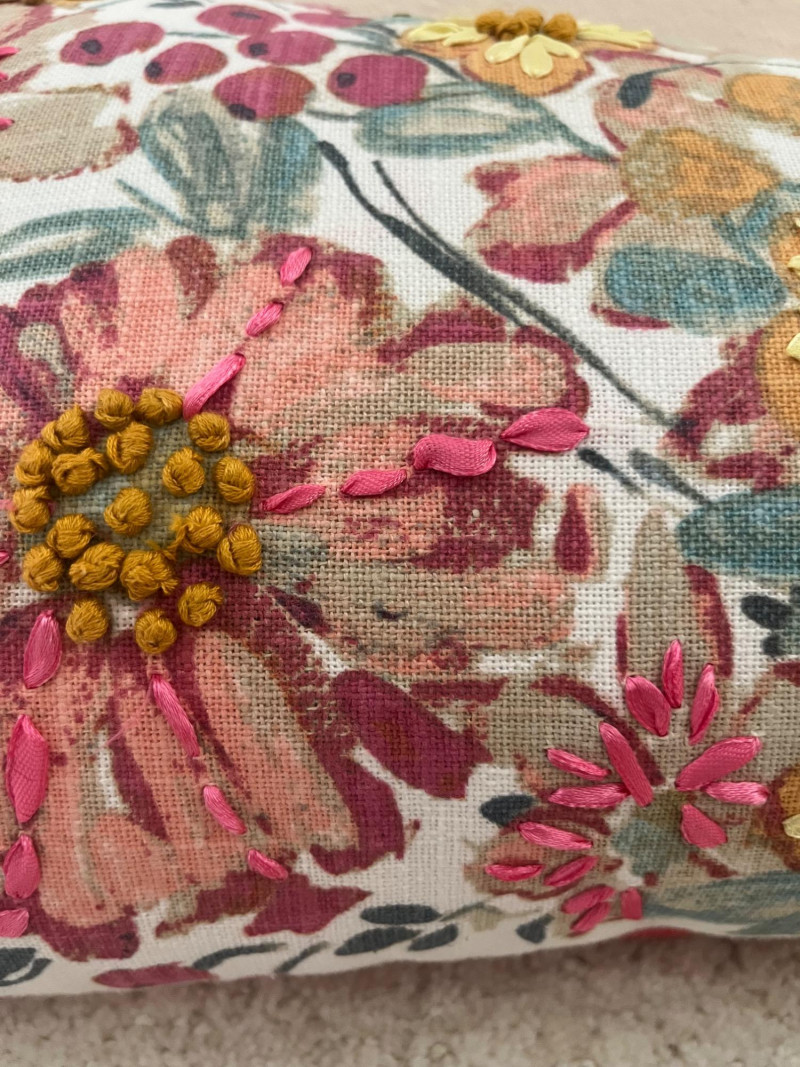 Textile and Decor Ensemble with Stone Jar A collection of soft furnishings and decor featuring coordinated tones and varied textures. Included are a long rectangular pillow with floral embroidery, a cylindrical pillow with tassels on both ends, and a square pillow with an elephant tapestry panel framed by solid fabric. A loosely woven pink blanket with fringe is paired with a second textile displaying geometric patterns and long fringe. Completing the group is a lidded stone jar formed with a footed base, rounded bowl, and domed lid topped with a knob finial. Dimensions: Long floral pillow: 25" W x 13" D Cylinder pillow (excluding tassels): 16" W x 6.75" diameter Elephant pillow: 16" H x 16" W Pink blanket: 79" L x 50" W Patterned textile with fringe: 75.25" L x 39.5" W Lidded stone jar: 8" H x 5.5" diam