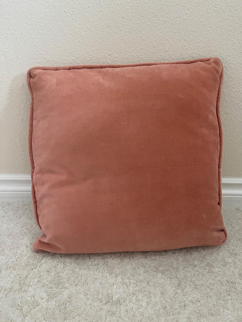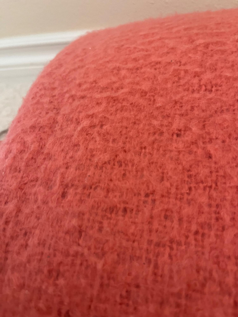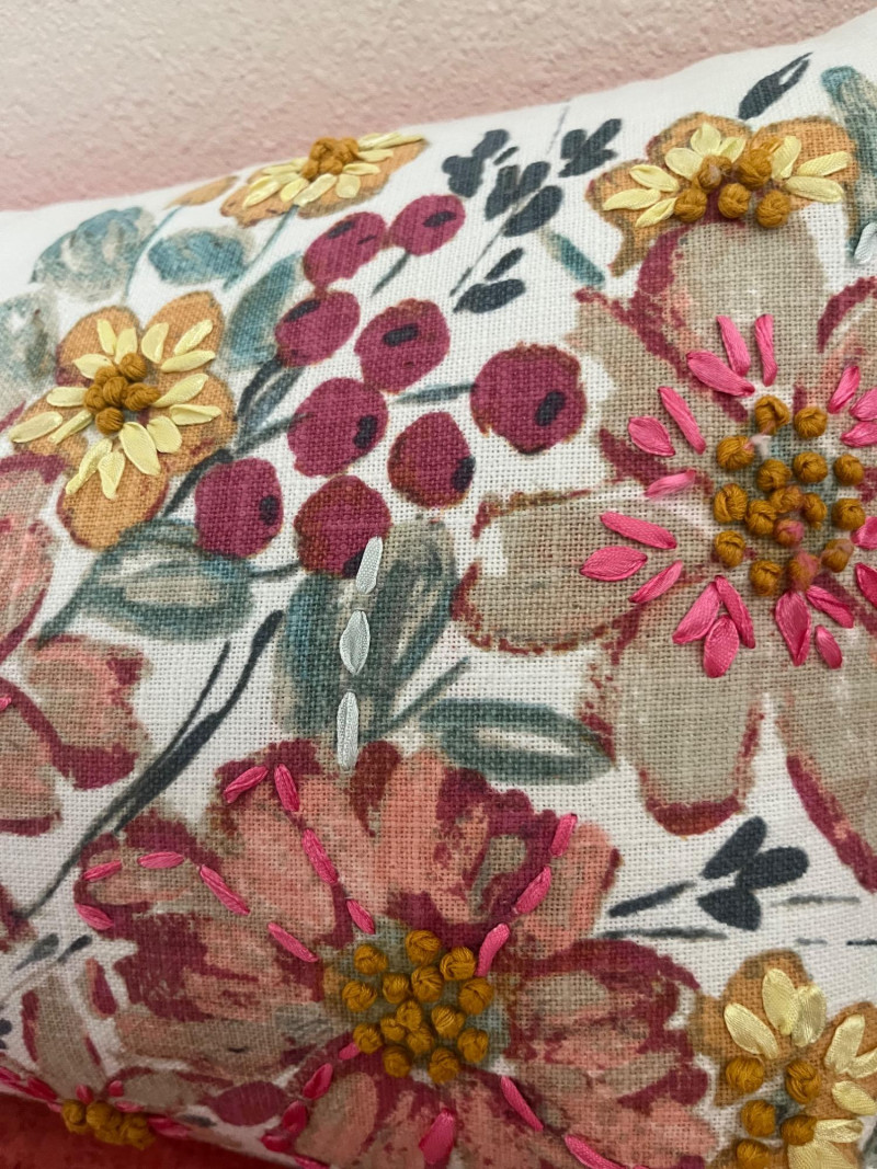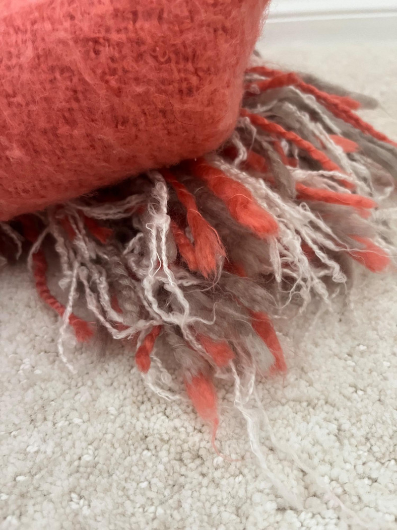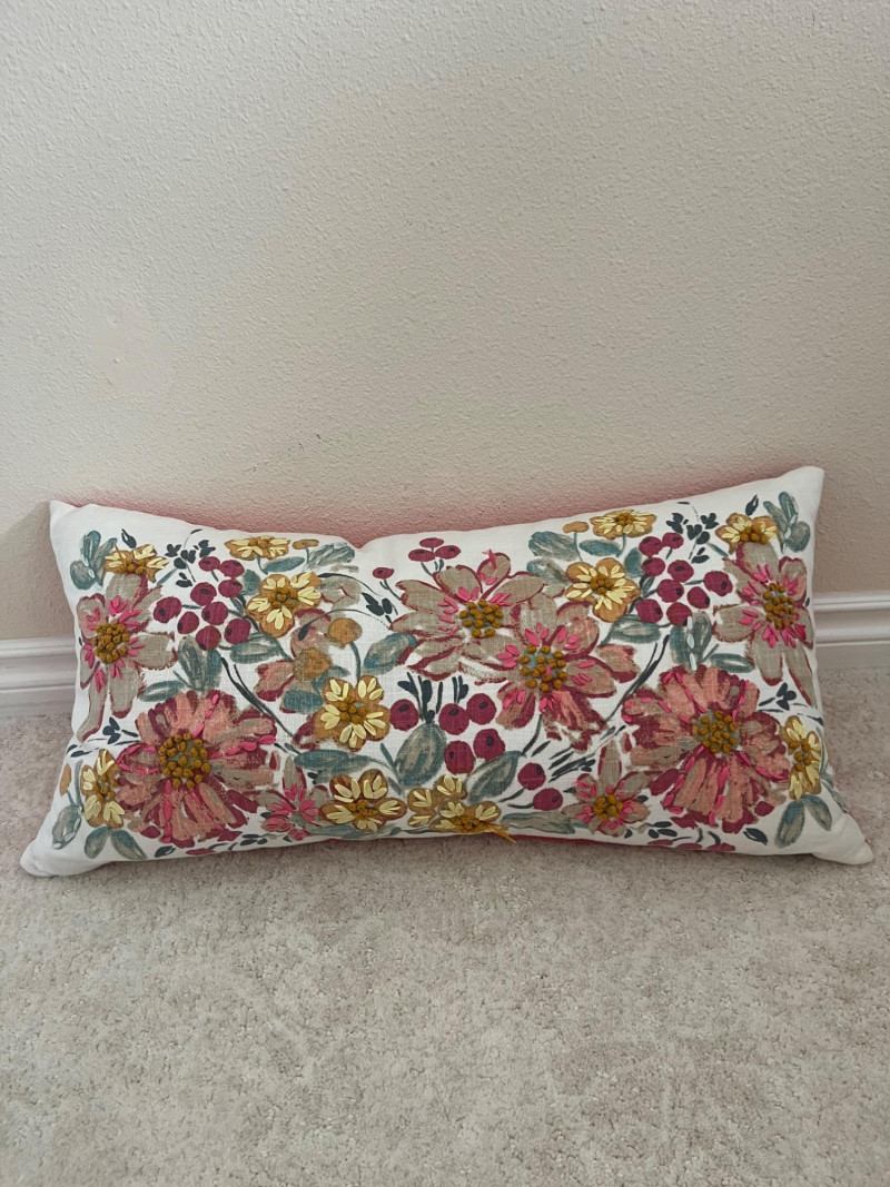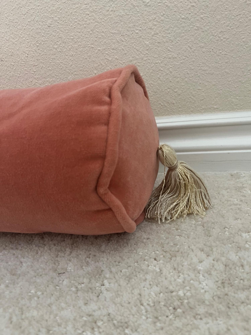 Textile and Decor Ensemble with Stone Jar A collection of soft furnishings and decor featuring coordinated tones and varied textures. Included are a long rectangular pillow with floral embroidery, a cylindrical pillow with tassels on both ends, and a square pillow with an elephant tapestry panel framed by solid fabric. A loosely woven pink blanket with fringe is paired with a second textile displaying geometric patterns and long fringe. Completing the group is a lidded stone jar formed with a footed base, rounded bowl, and domed lid topped with a knob finial. Dimensions: Long floral pillow: 25" W x 13" D Cylinder pillow (excluding tassels): 16" W x 6.75" diameter Elephant pillow: 16" H x 16" W Pink blanket: 79" L x 50" W Patterned textile with fringe: 75.25" L x 39.5" W Lidded stone jar: 8" H x 5.5" diam