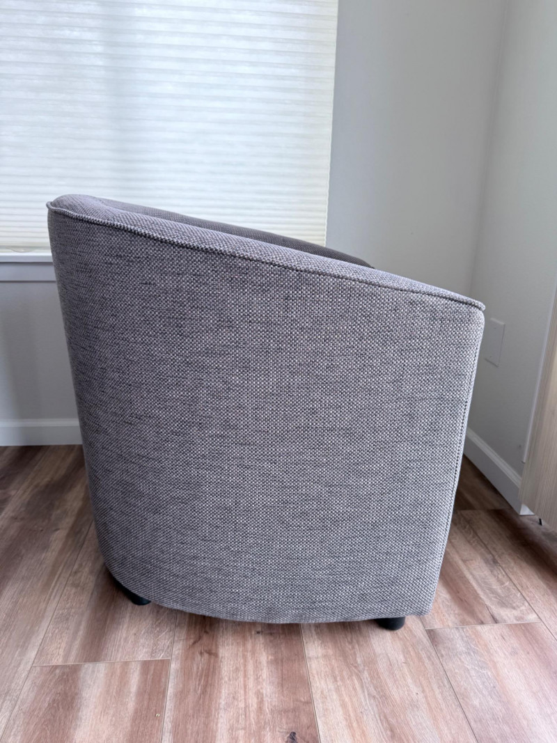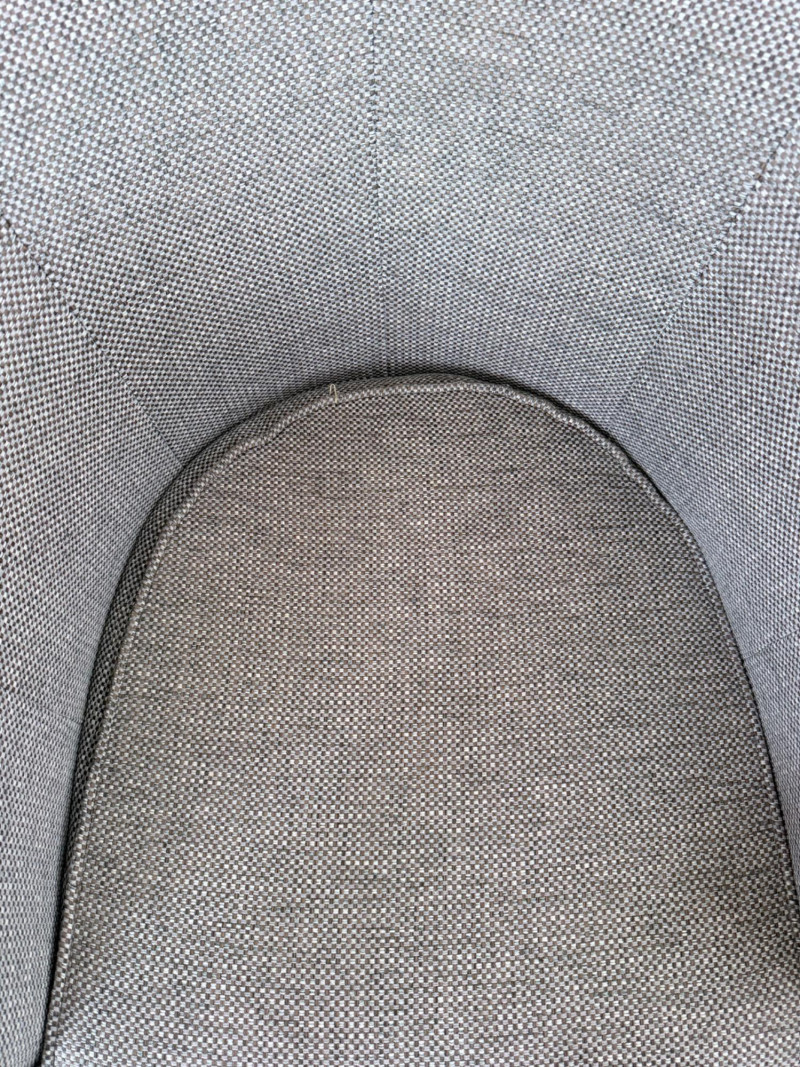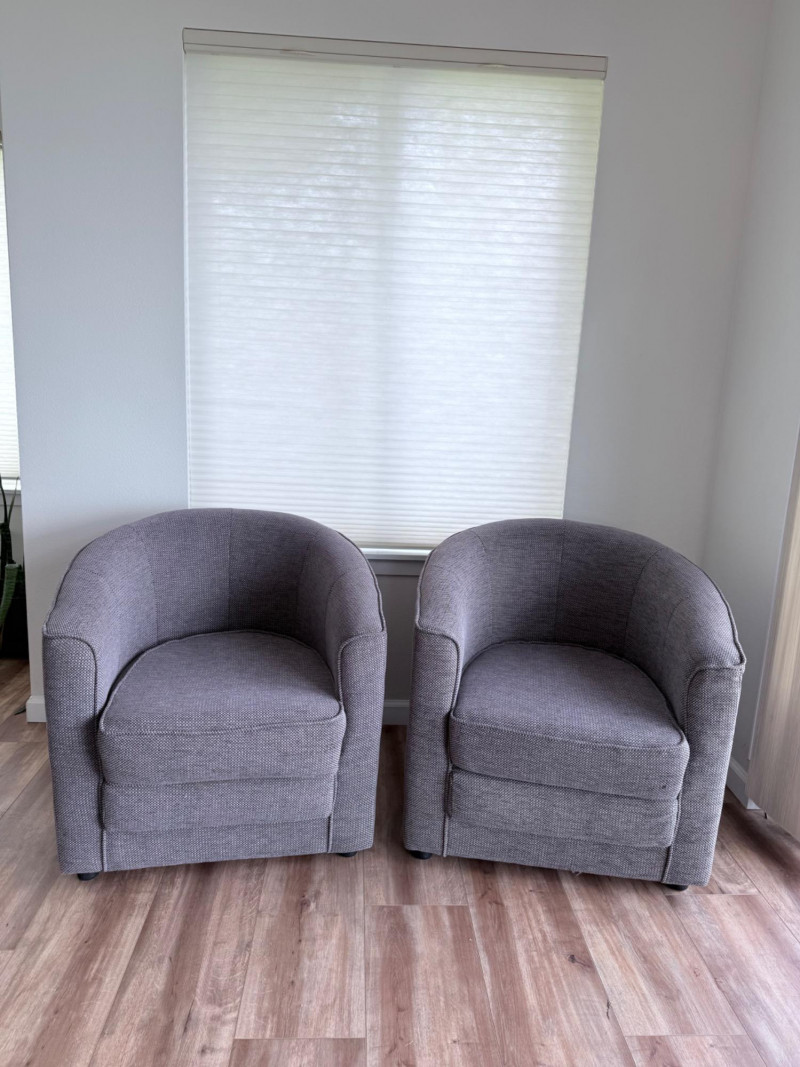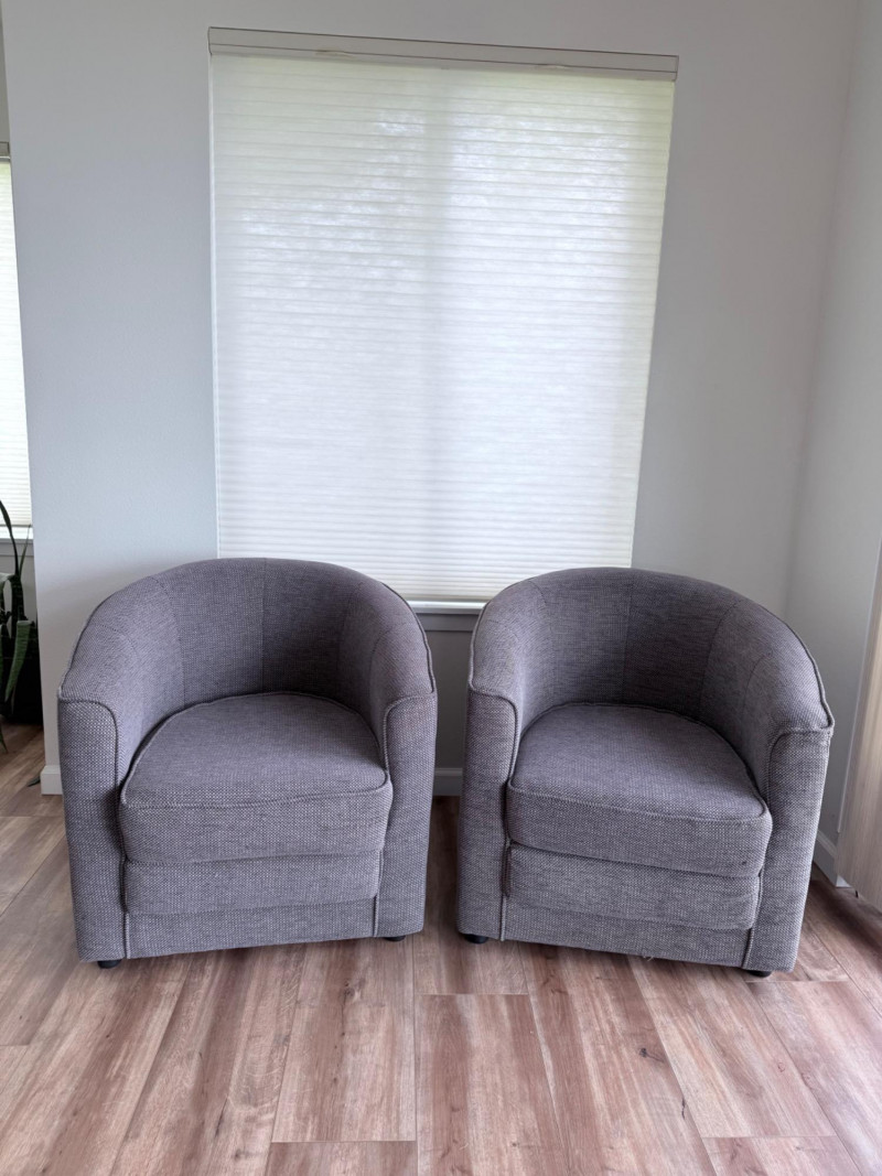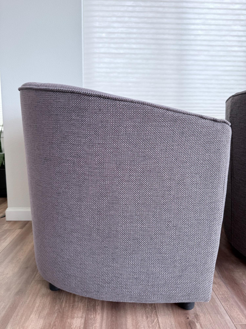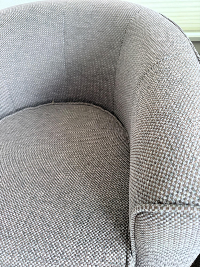 Pair of Upholstered Barrel Chairs Set of two barrel chairs with curved backs and continuous armrests. Each chair is upholstered in a two-tone woven fabric with a checkered pattern. The seat cushions are integrated into the frame and contoured to fit. Both chairs rest on fixed, non-swivel bases with low-profile feet.