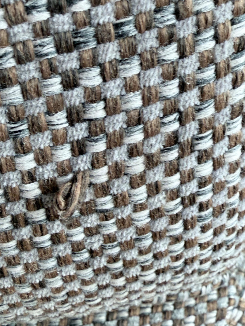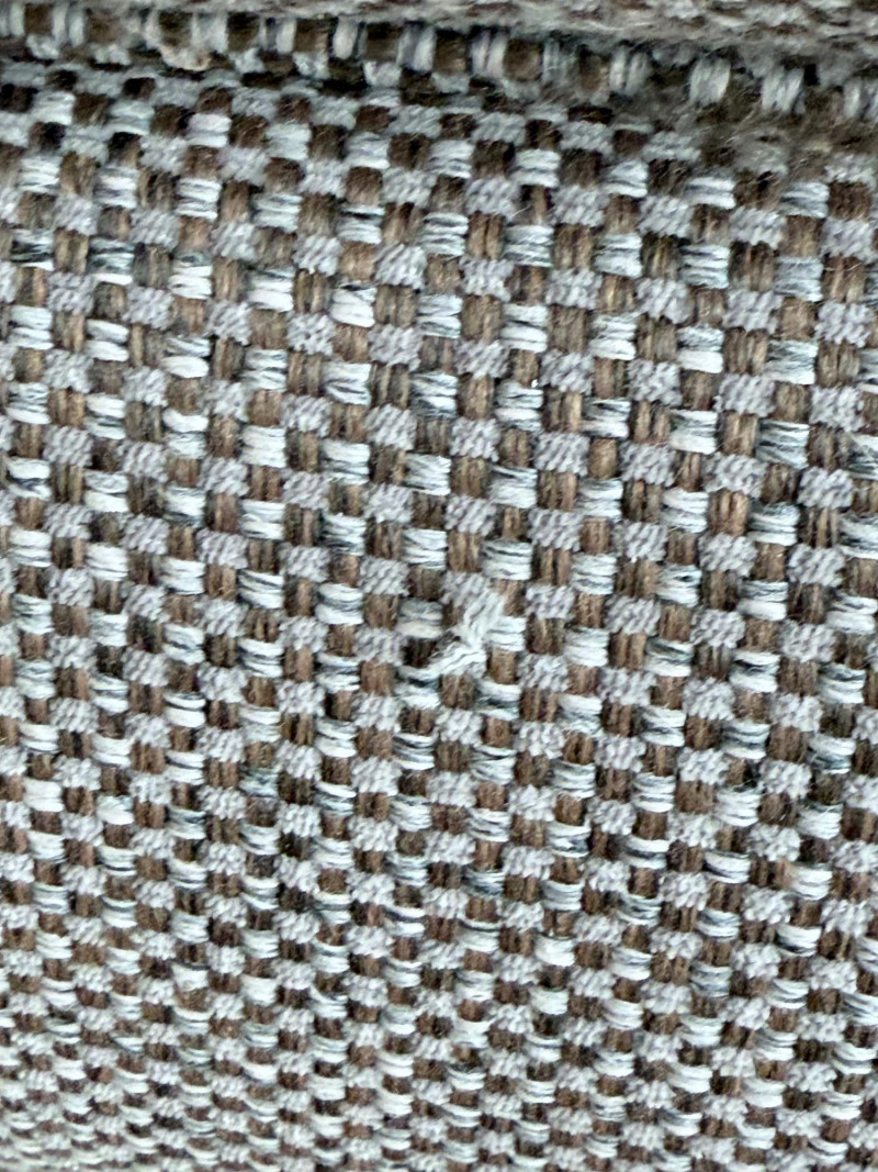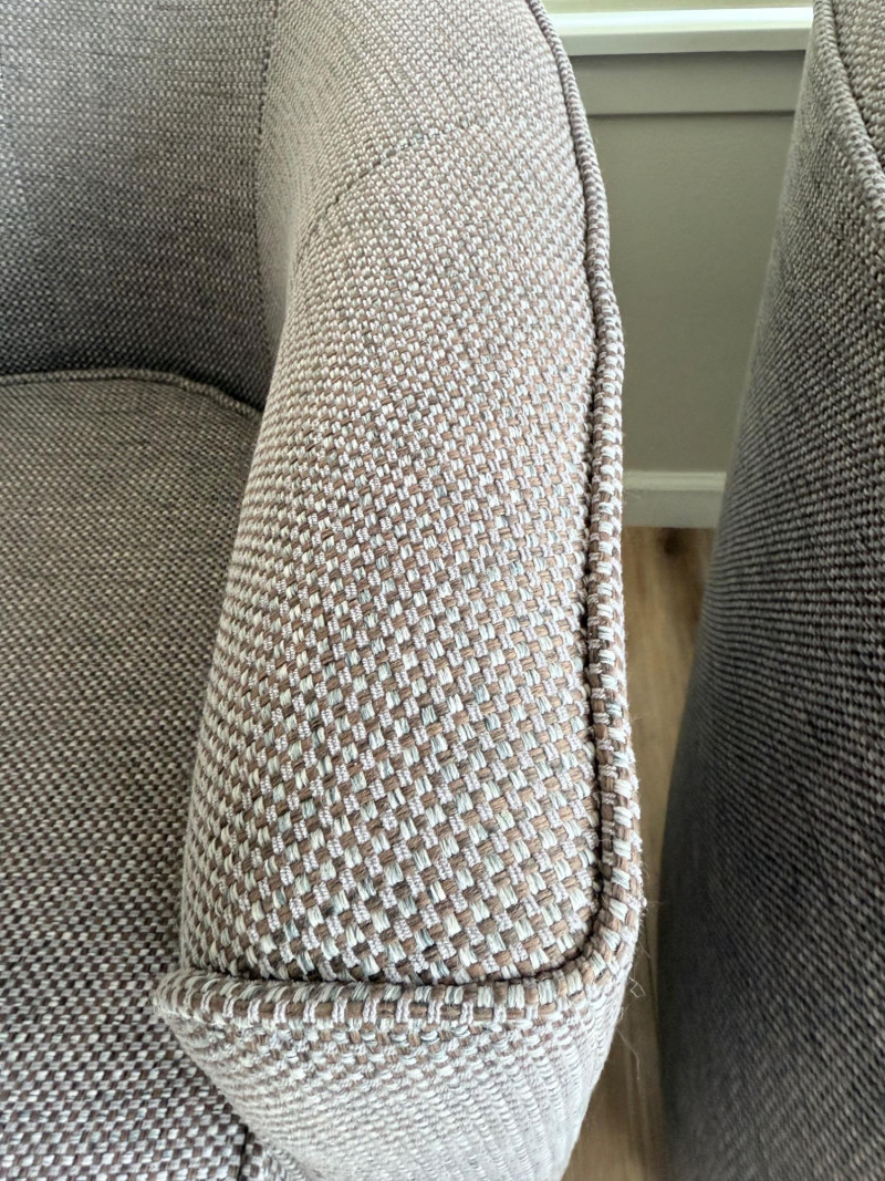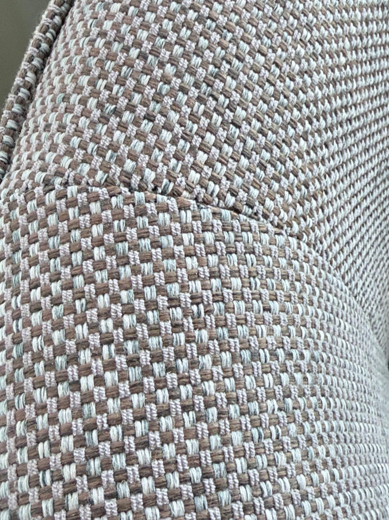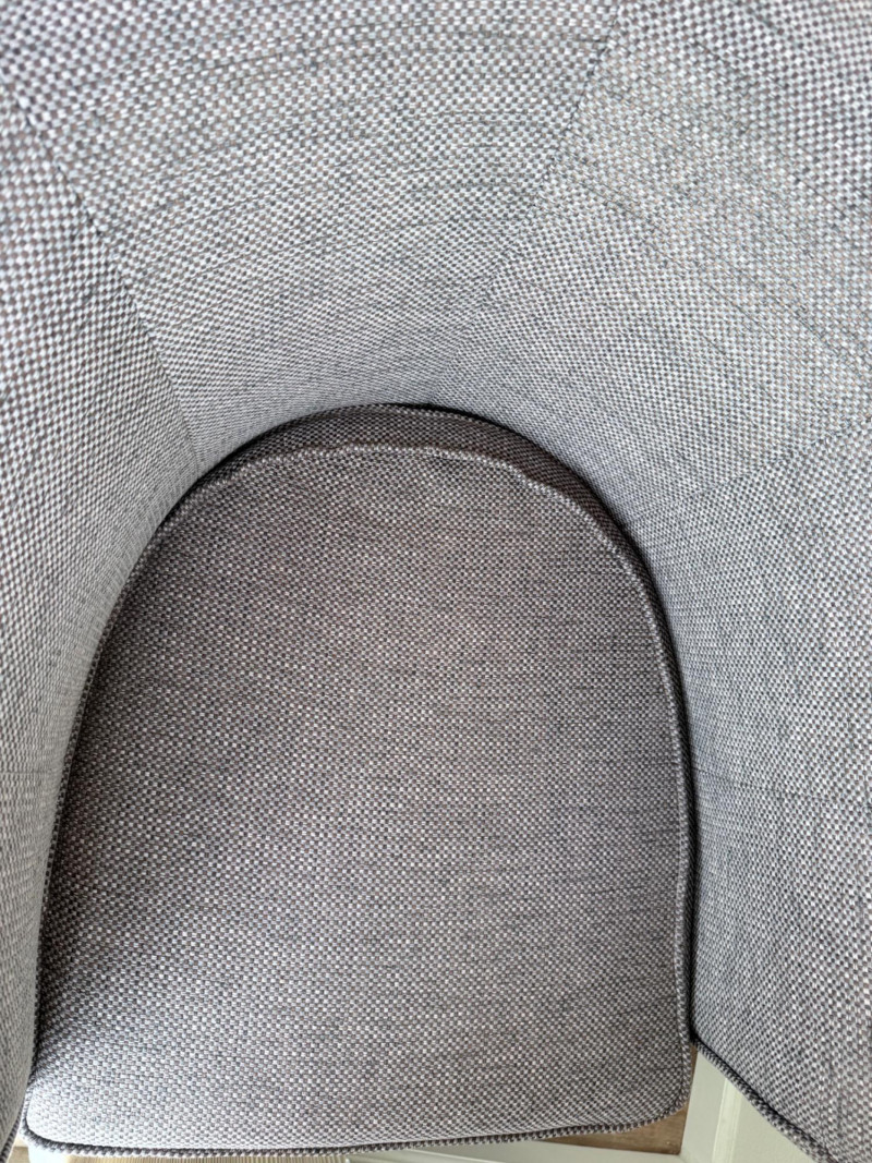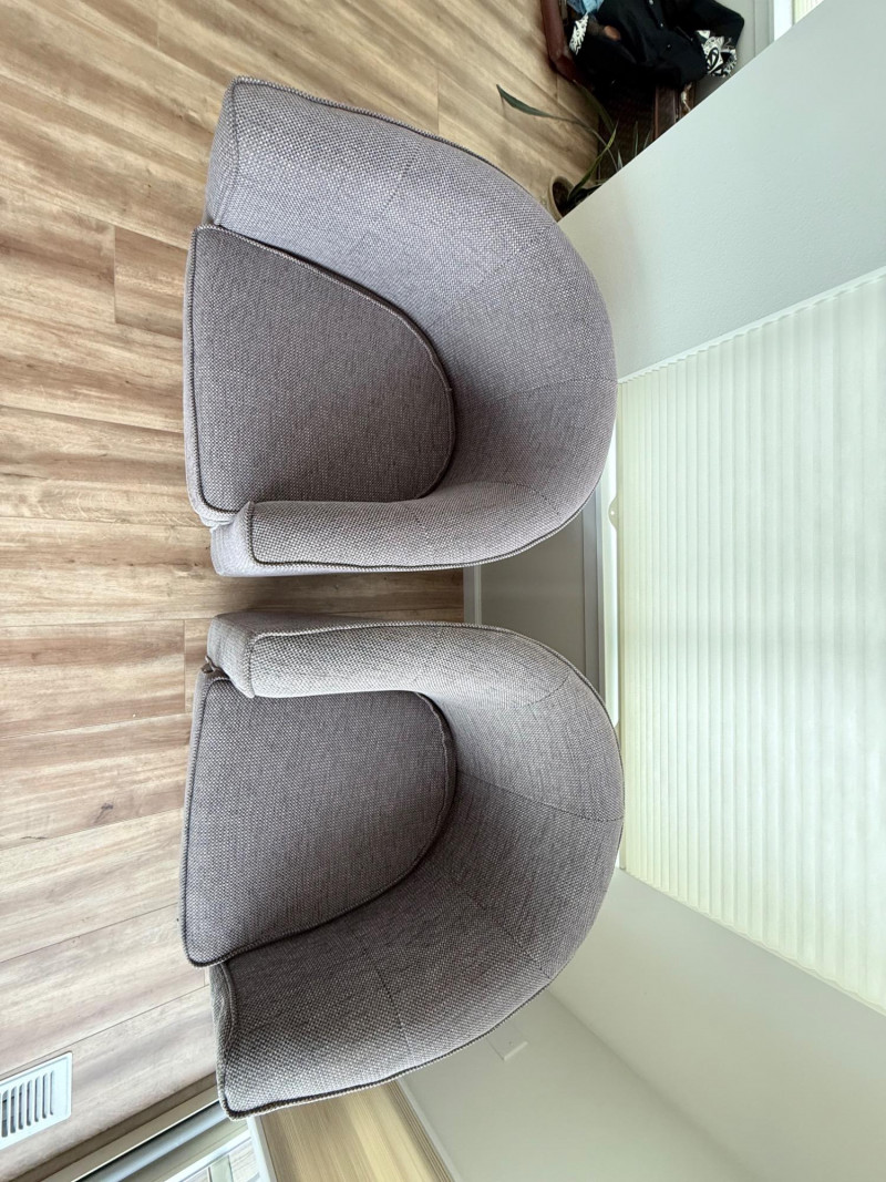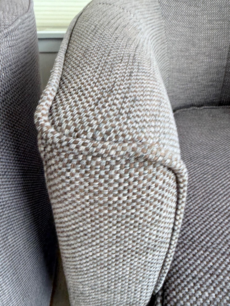 Pair of Upholstered Barrel Chairs Set of two barrel chairs with curved backs and continuous armrests. Each chair is upholstered in a two-tone woven fabric with a checkered pattern. The seat cushions are integrated into the frame and contoured to fit. Both chairs rest on fixed, non-swivel bases with low-profile feet.