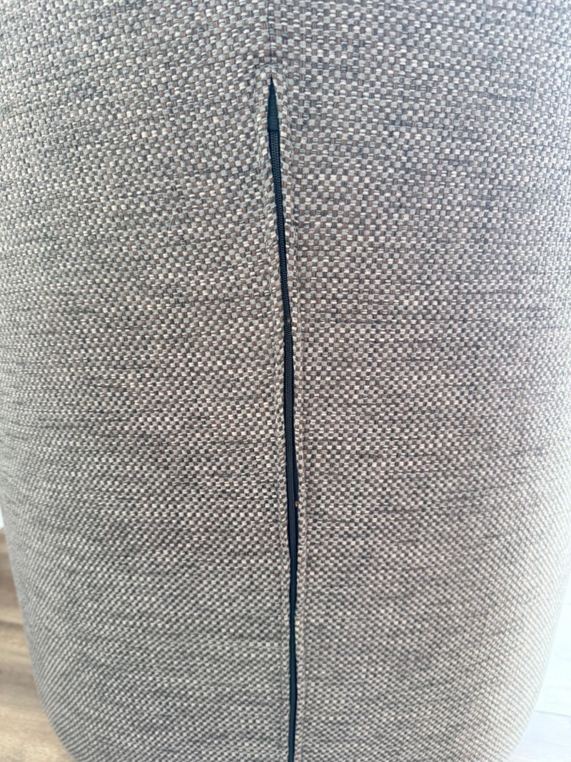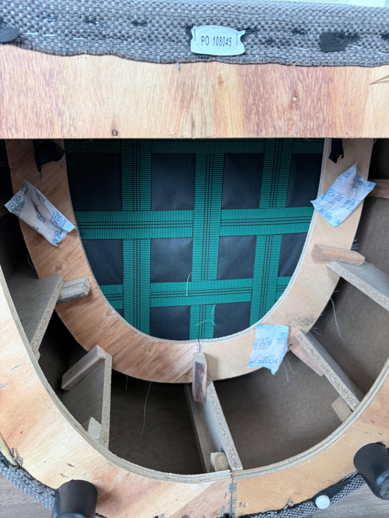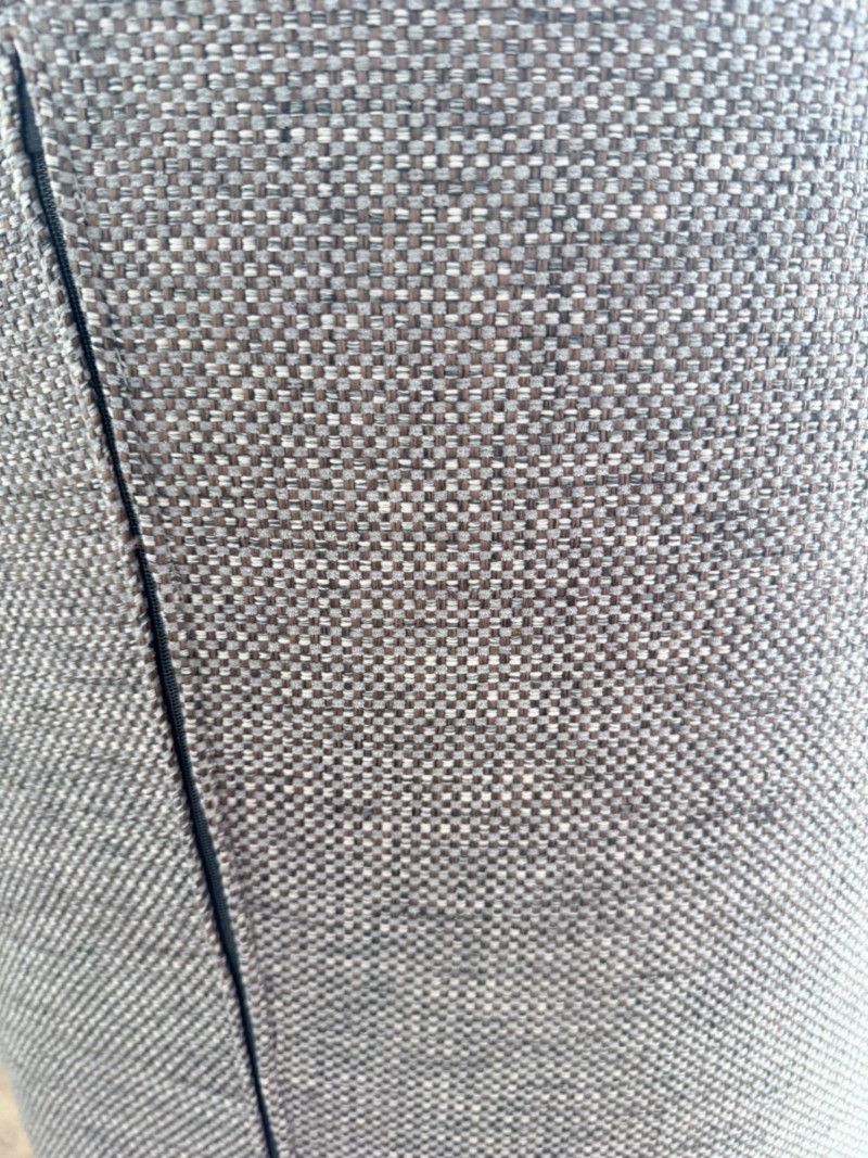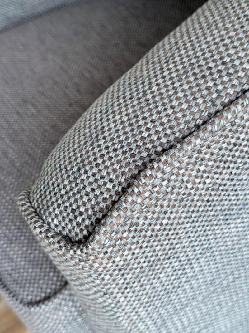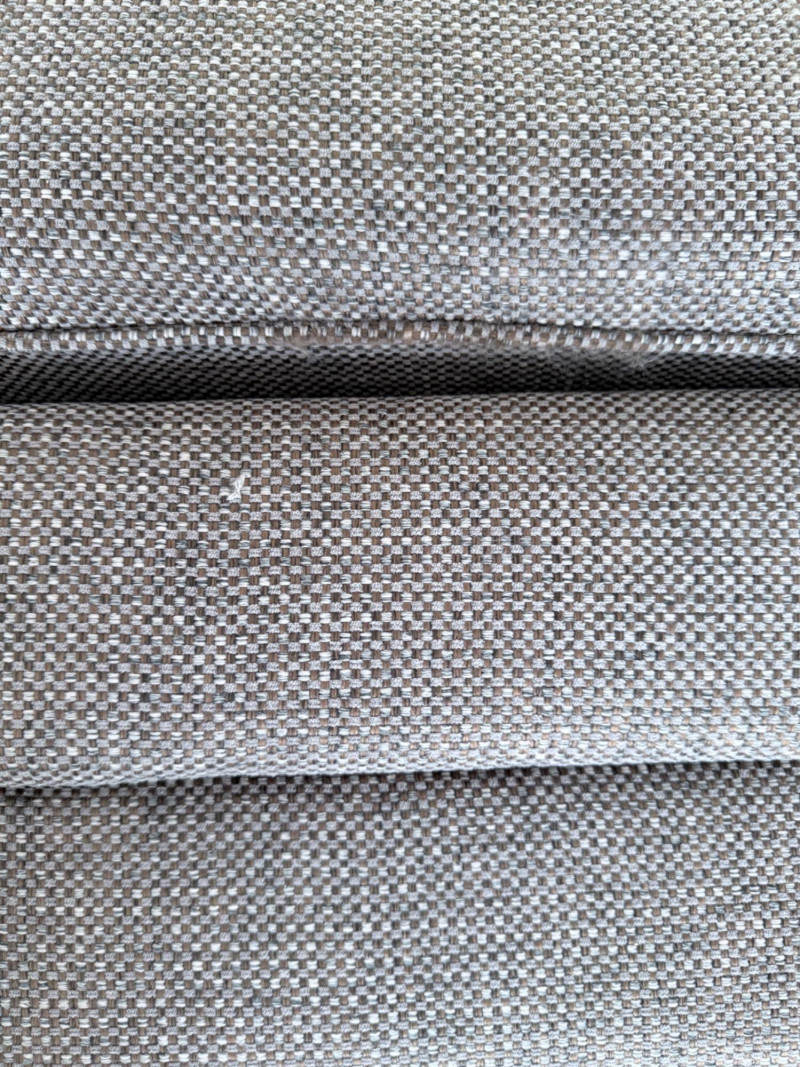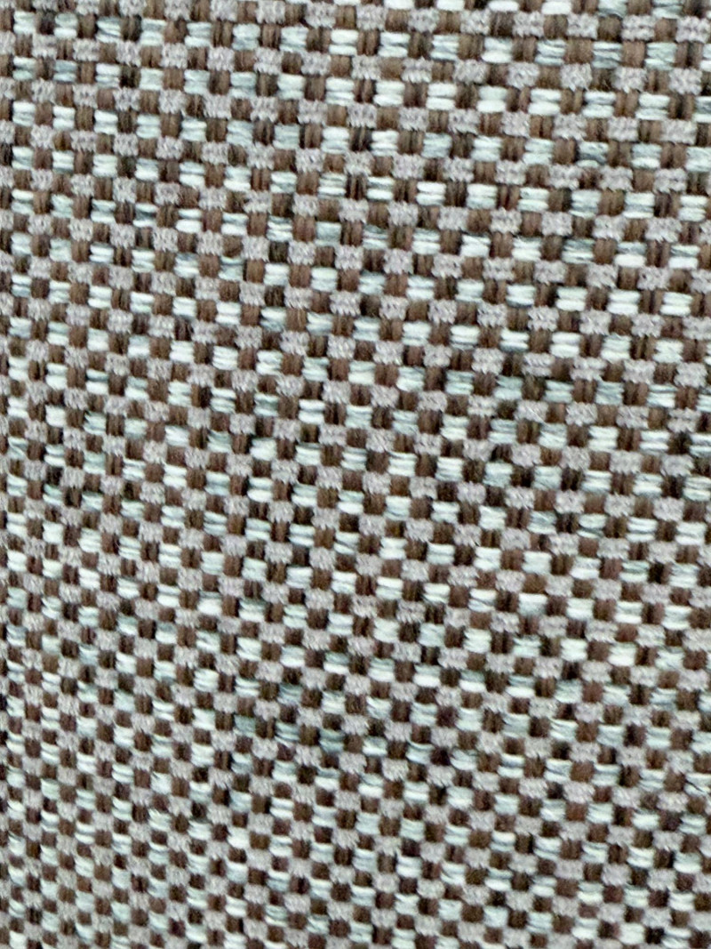 Pair of Upholstered Barrel Chairs Set of two barrel chairs with curved backs and continuous armrests. Each chair is upholstered in a two-tone woven fabric with a checkered pattern. The seat cushions are integrated into the frame and contoured to fit. Both chairs rest on fixed, non-swivel bases with low-profile feet.