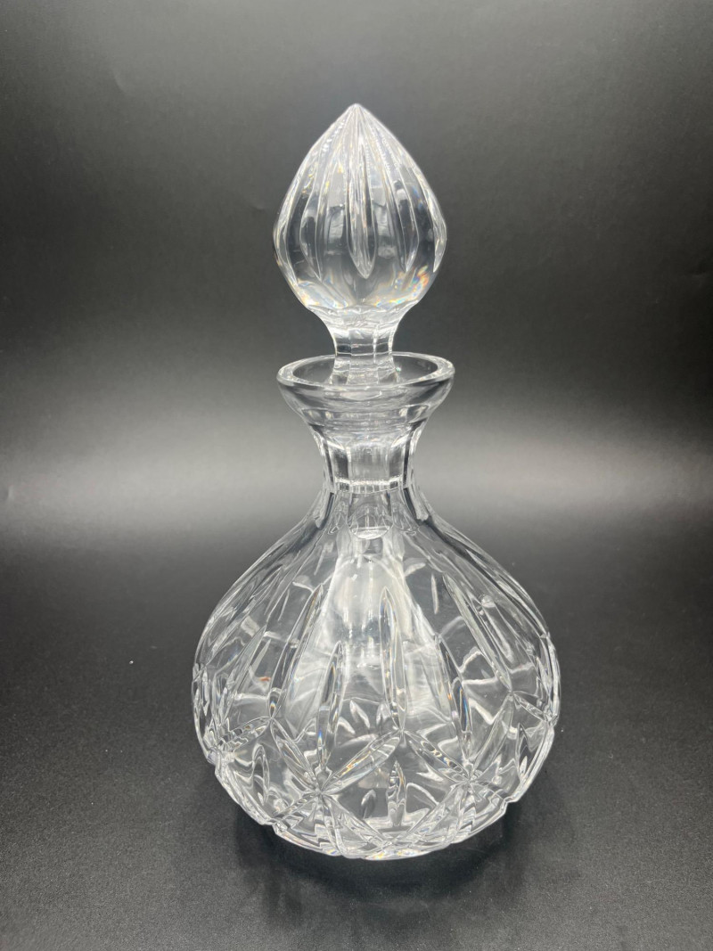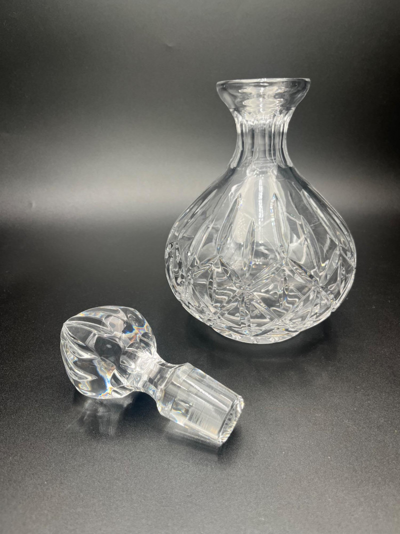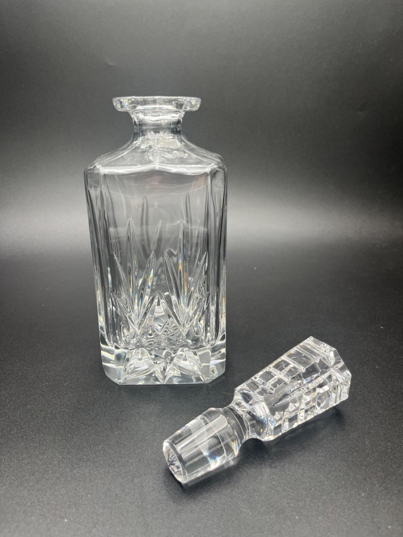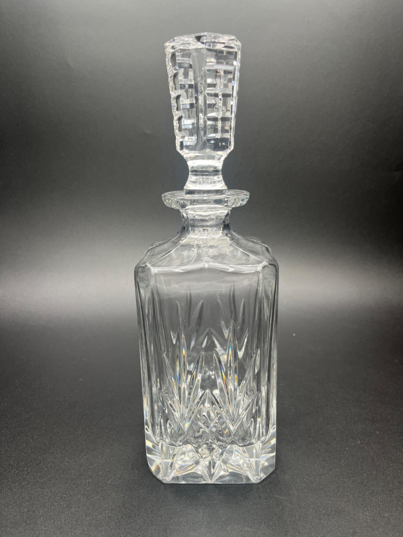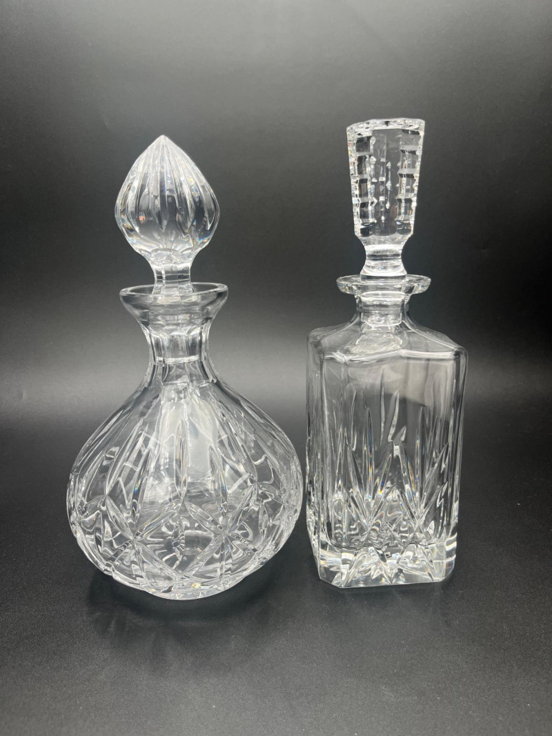 Pair of Cut Glass Liquor Decanters – Bohemian Style A pair of cut glass decanters, one with a bulb-shaped body and teardrop stopper, the other with a rectangular form and faceted stopper. Both are decorated with vertical and crisscrossed cut patterns. The round decanter is likely the same or from the same production style—often attributed to Bohemian cut glass or styled similarly. Dimensions: