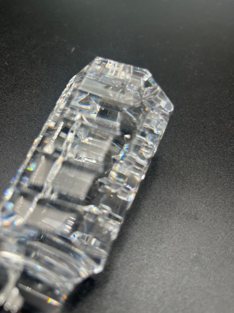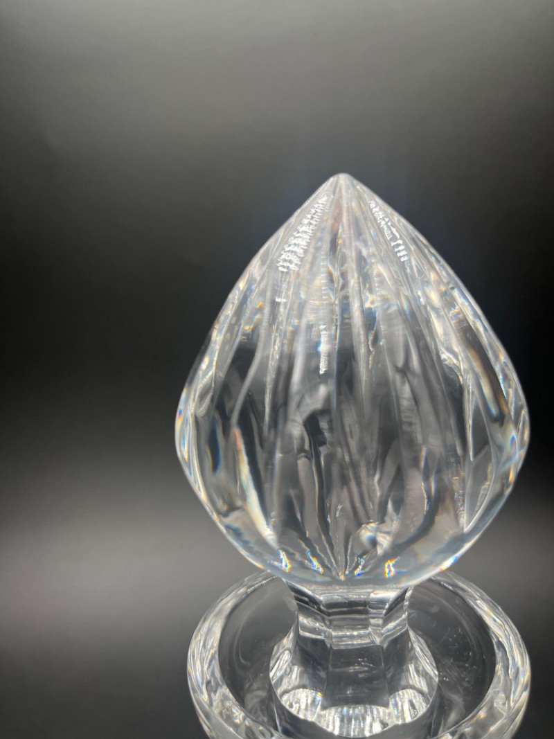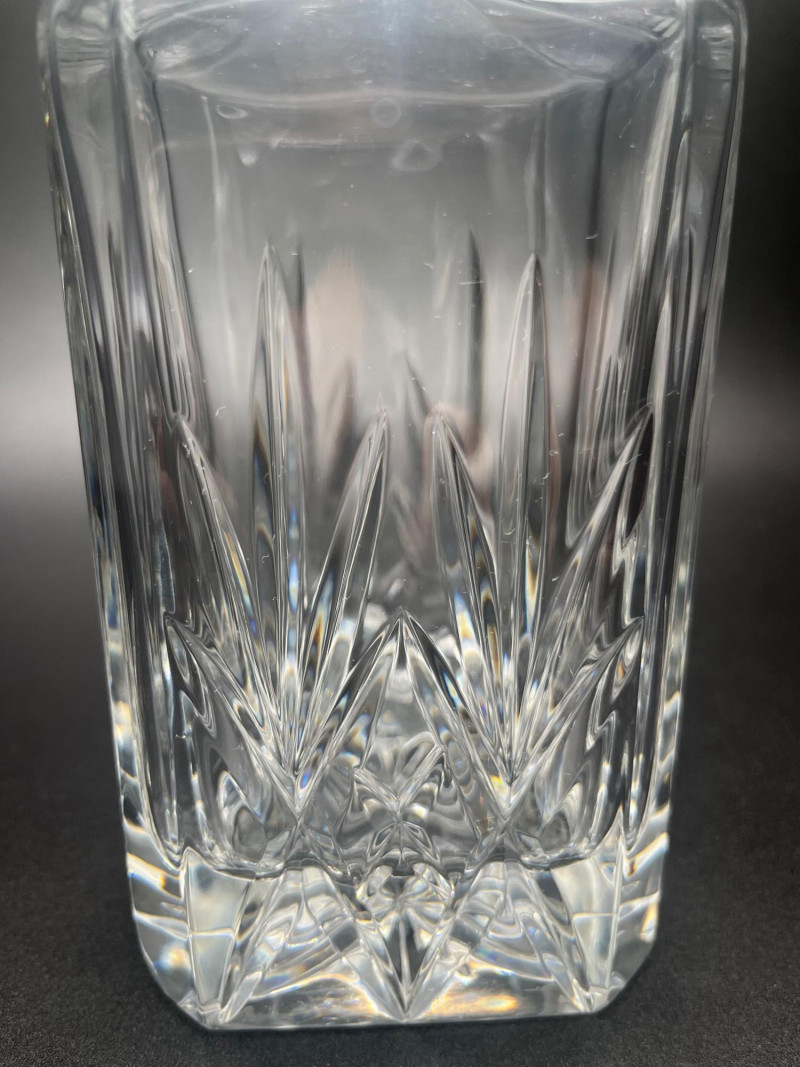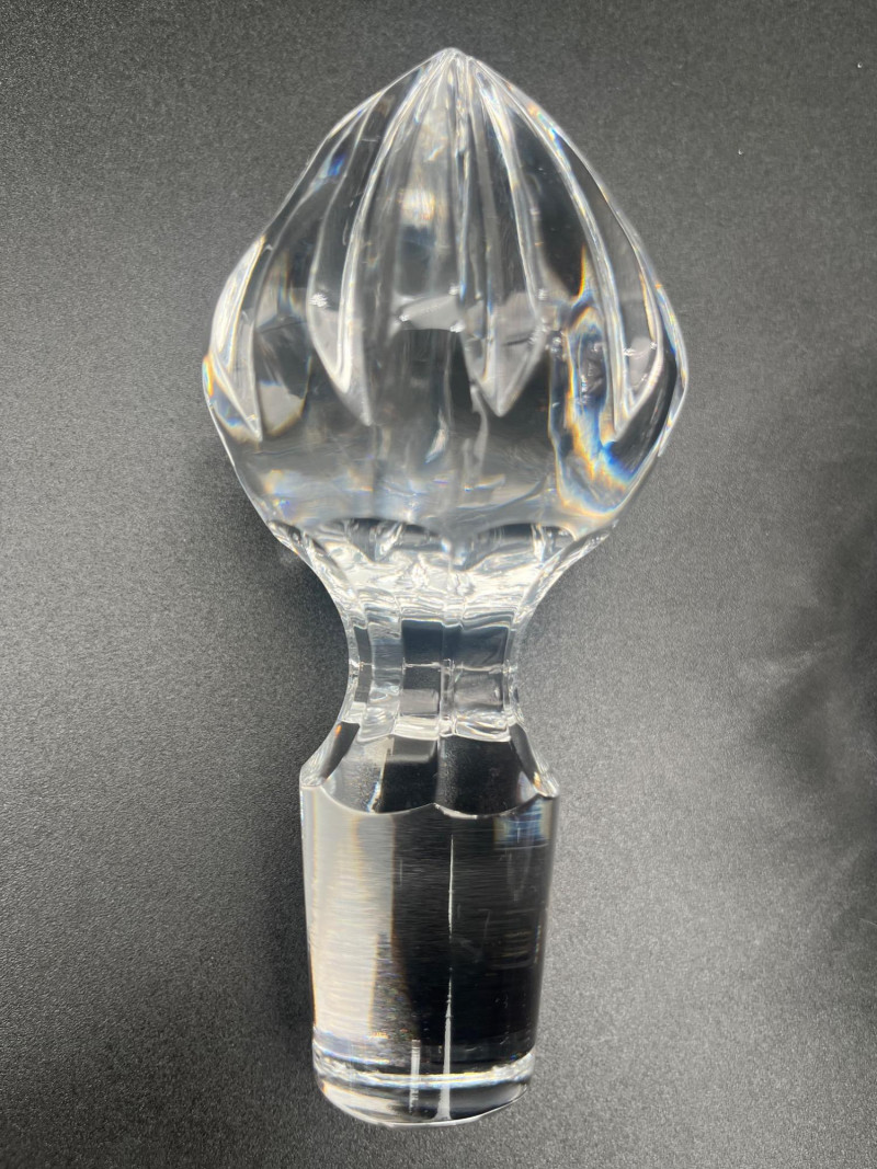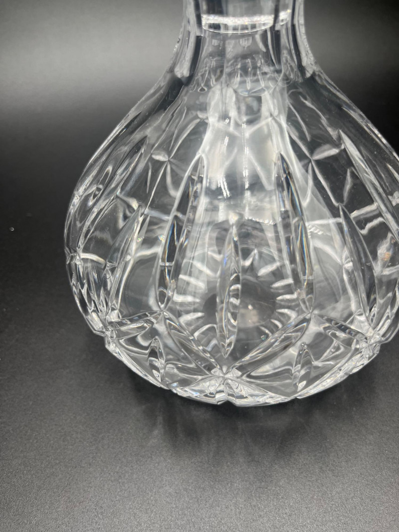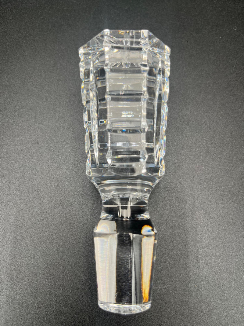 Pair of Cut Glass Liquor Decanters – Bohemian Style A pair of cut glass decanters, one with a bulb-shaped body and teardrop stopper, the other with a rectangular form and faceted stopper. Both are decorated with vertical and crisscrossed cut patterns. The round decanter is likely the same or from the same production style—often attributed to Bohemian cut glass or styled similarly. Dimensions: