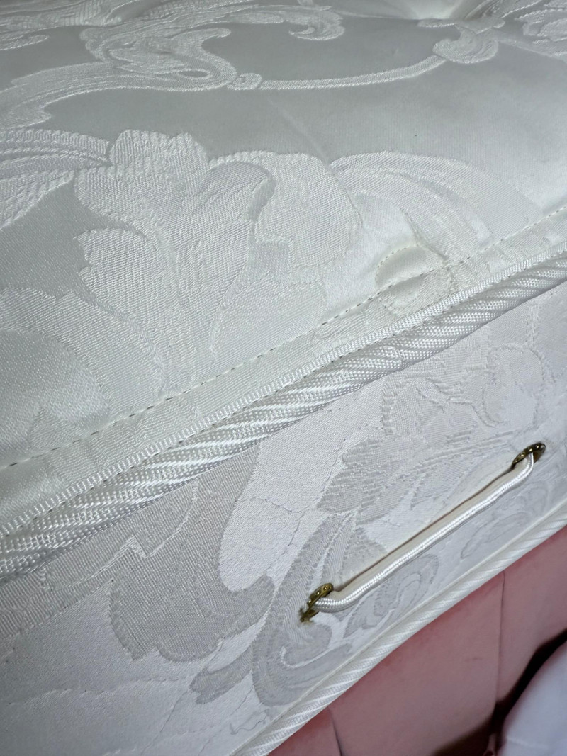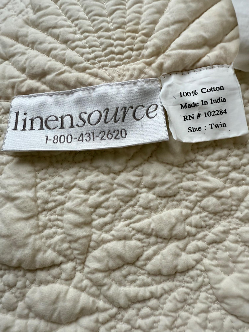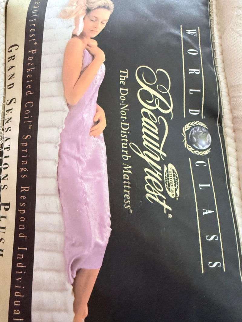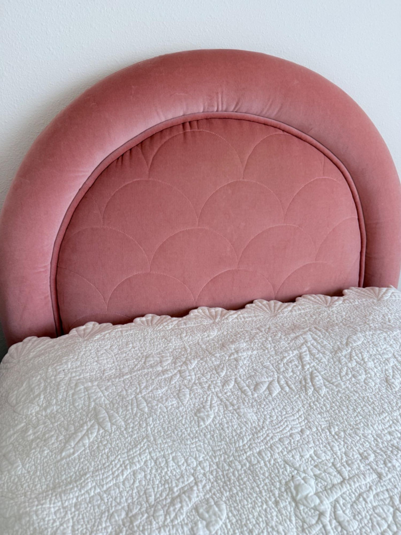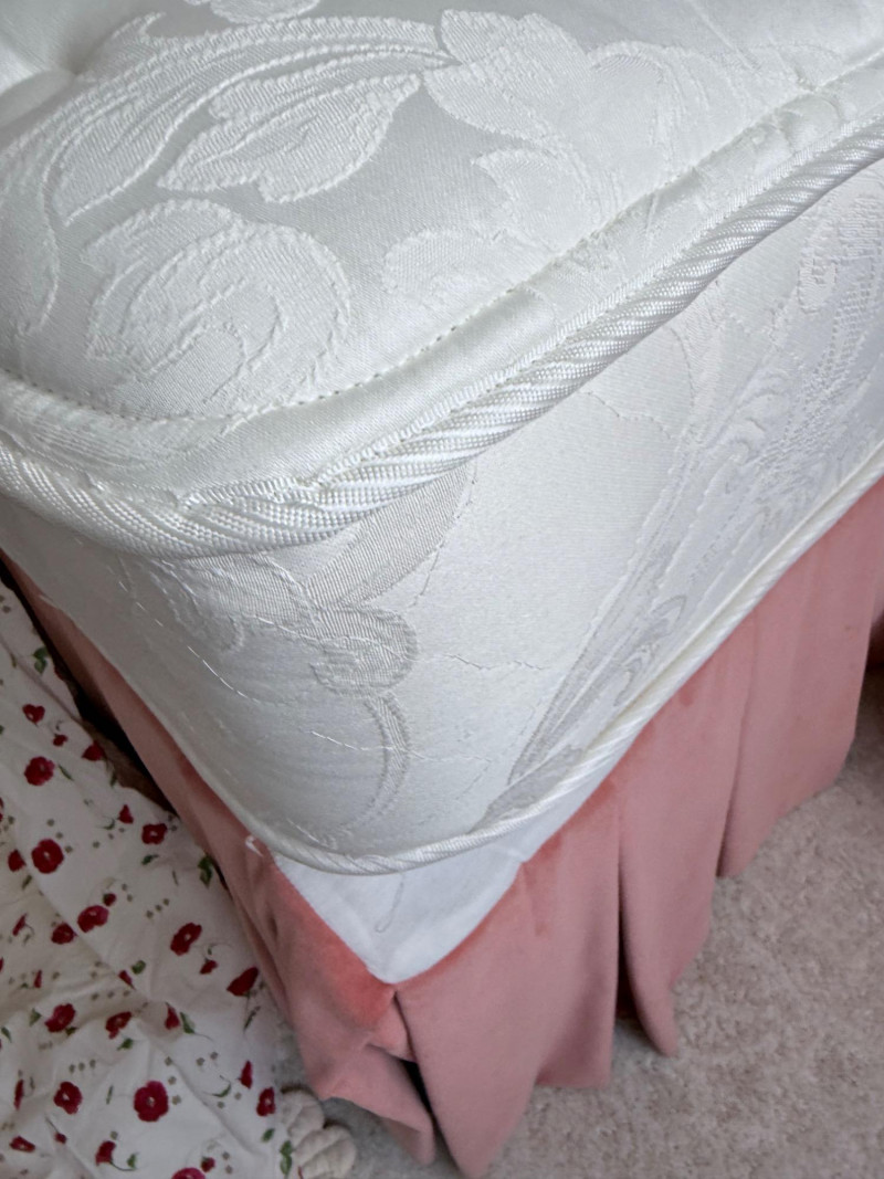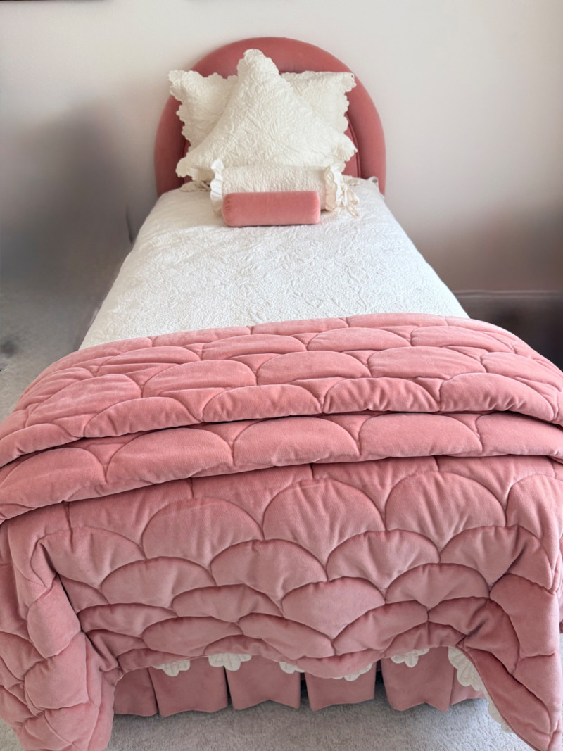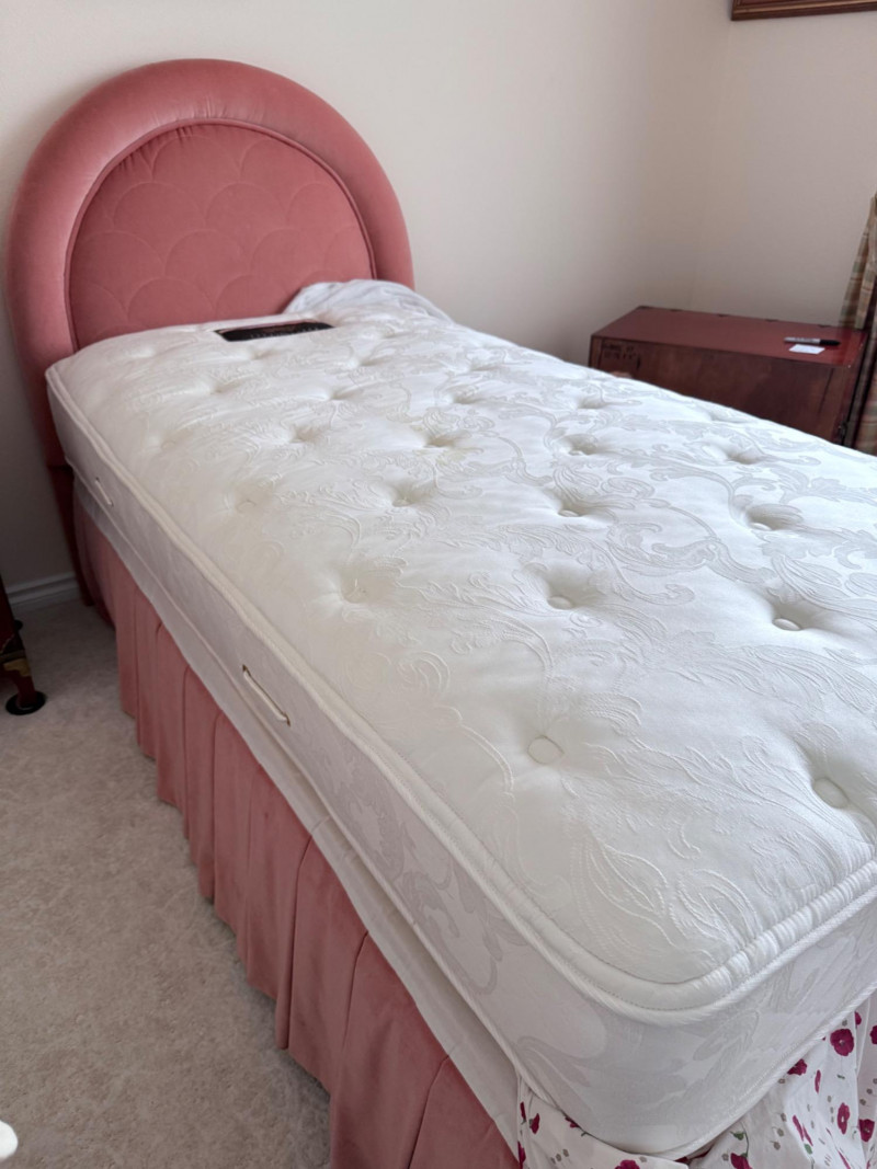 Twin Bed with Headboard and Bedding Ensemble Twin-size bed with an arched upholstered headboard in soft fabric. The mattress is a Beautyrest World Class “Do-Not-Disturb” model with pocketed coil springs. It is layered with a cotton quilt by Linensource, made in India, with stitched floral patterns. A scallop-patterned pink comforter is folded at the foot, and a matching skirt hangs below the mattress. The bedding includes four pillows: two square shams with tassels, one cylindrical cushion, and one matching accent pillow. A floral fitted sheet and foam padding are also included. Mattress Brand: Beautyrest World Class Approximate Dimensions: