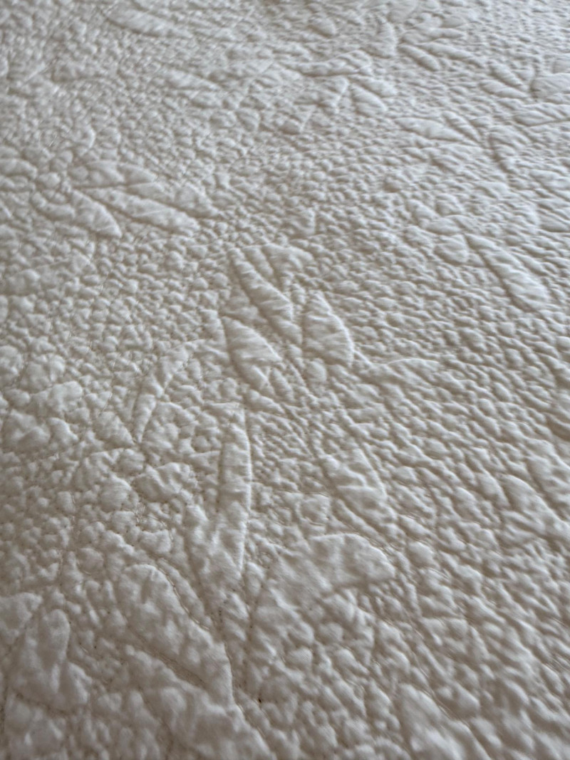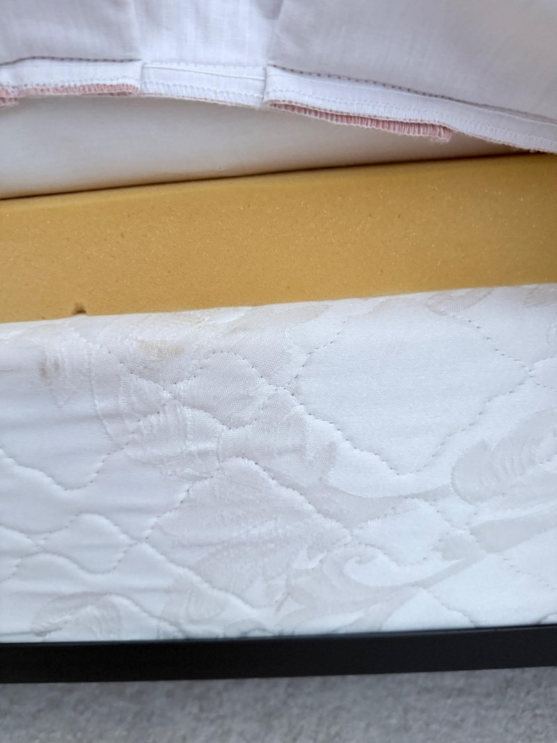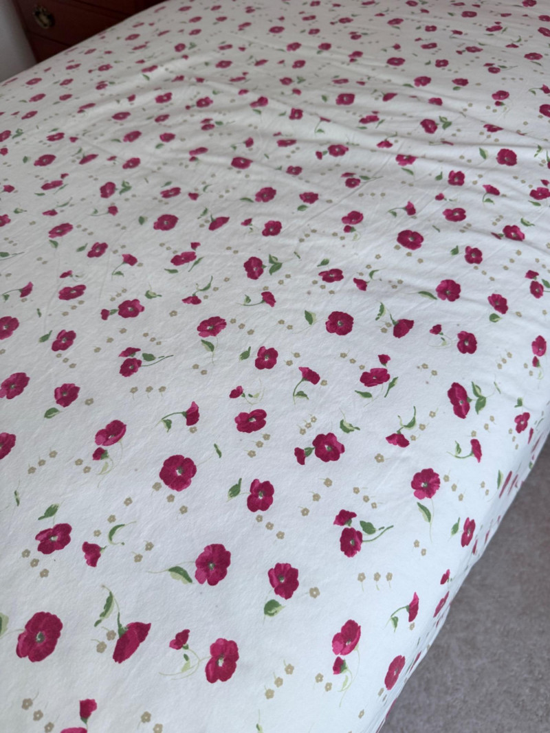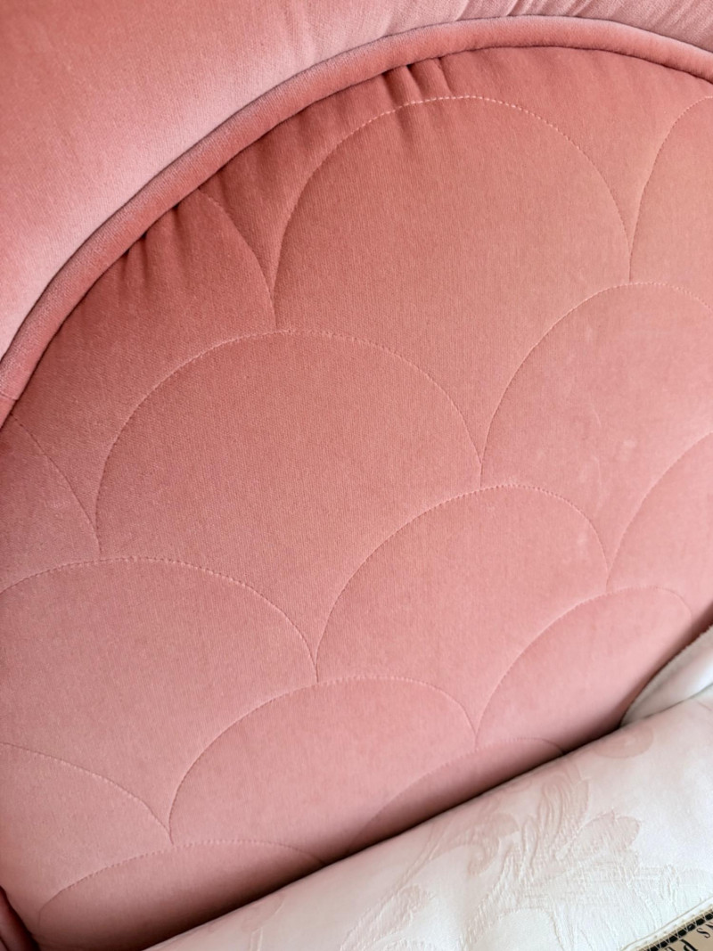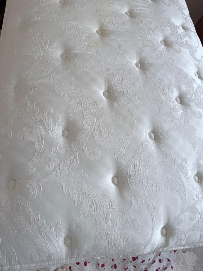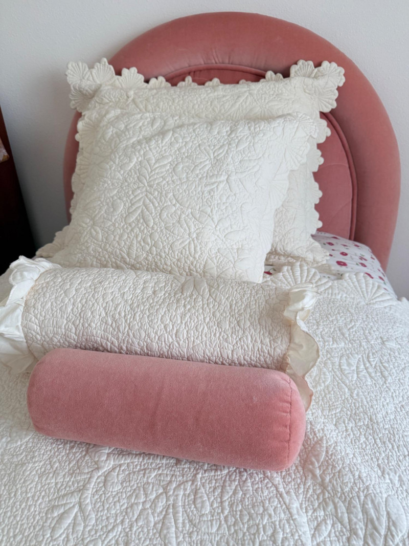 Twin Bed with Headboard and Bedding Ensemble Twin-size bed with an arched upholstered headboard in soft fabric. The mattress is a Beautyrest World Class “Do-Not-Disturb” model with pocketed coil springs. It is layered with a cotton quilt by Linensource, made in India, with stitched floral patterns. A scallop-patterned pink comforter is folded at the foot, and a matching skirt hangs below the mattress. The bedding includes four pillows: two square shams with tassels, one cylindrical cushion, and one matching accent pillow. A floral fitted sheet and foam padding are also included. Mattress Brand: Beautyrest World Class Approximate Dimensions: