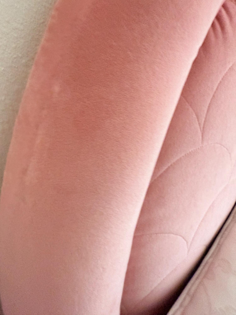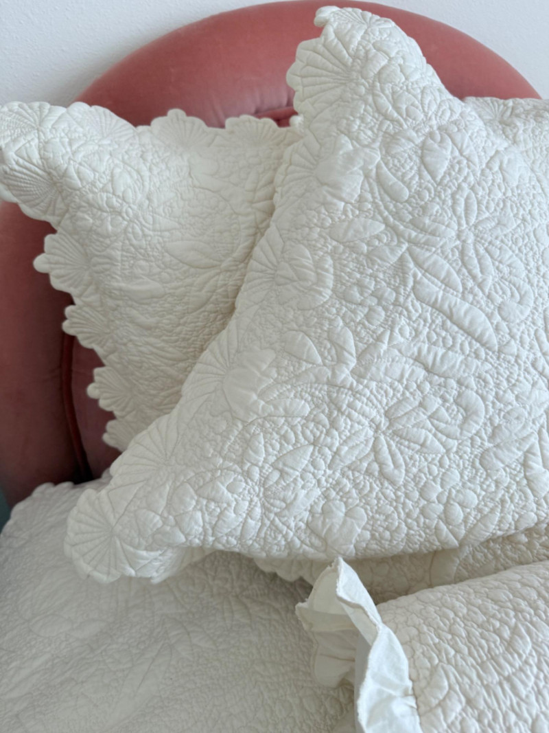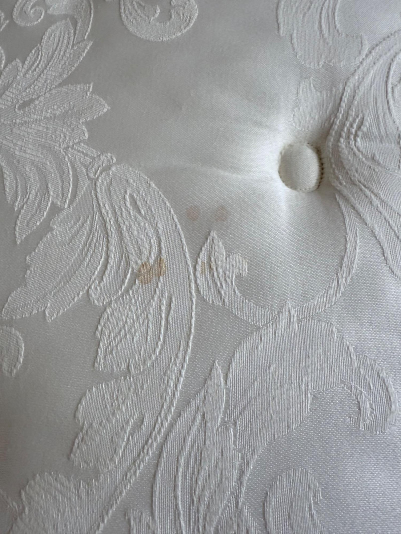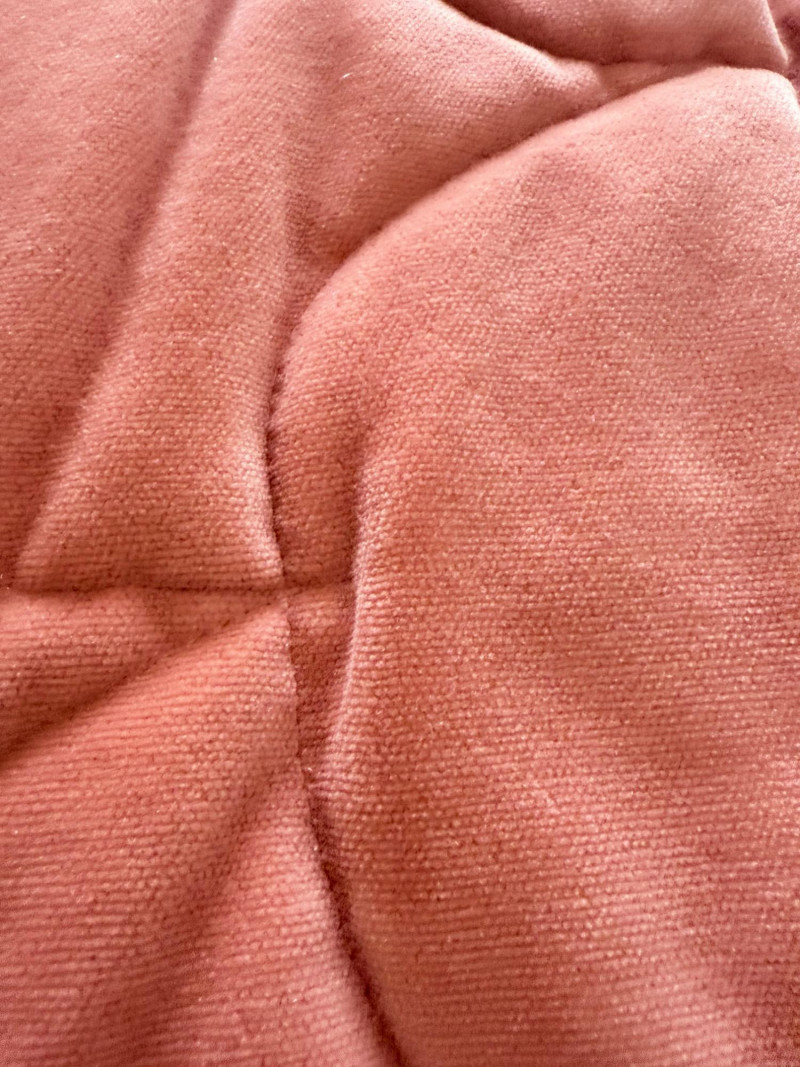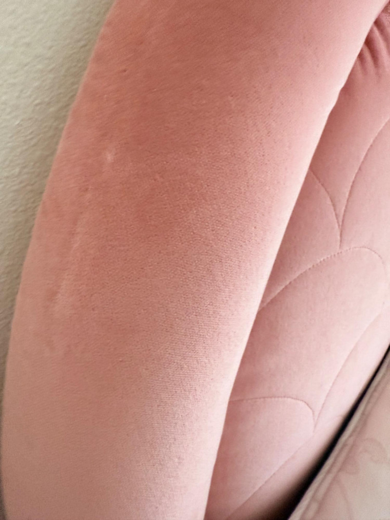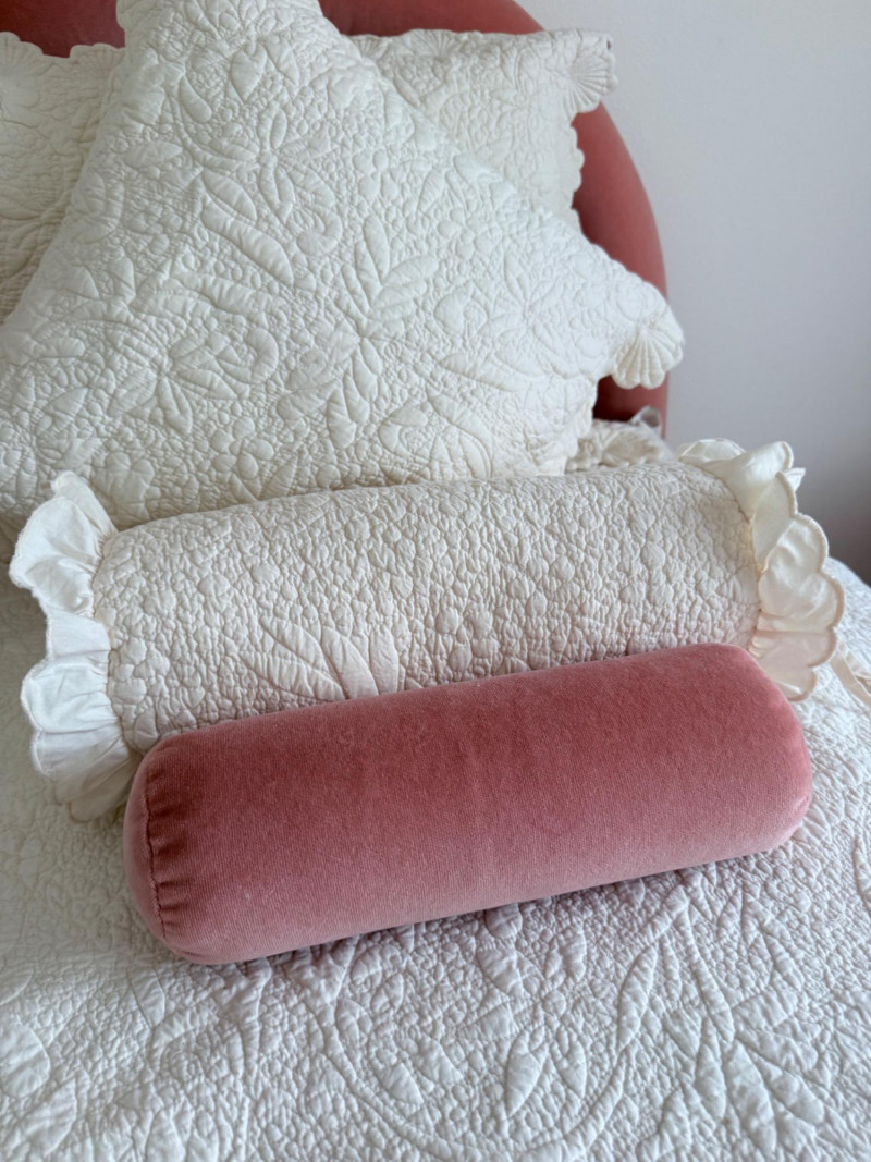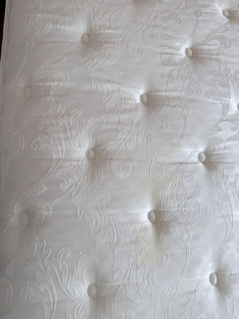 Twin Bed with Headboard and Bedding Ensemble Twin-size bed with an arched upholstered headboard in soft fabric. The mattress is a Beautyrest World Class “Do-Not-Disturb” model with pocketed coil springs. It is layered with a cotton quilt by Linensource, made in India, with stitched floral patterns. A scallop-patterned pink comforter is folded at the foot, and a matching skirt hangs below the mattress. The bedding includes four pillows: two square shams with tassels, one cylindrical cushion, and one matching accent pillow. A floral fitted sheet and foam padding are also included. Mattress Brand: Beautyrest World Class Approximate Dimensions: