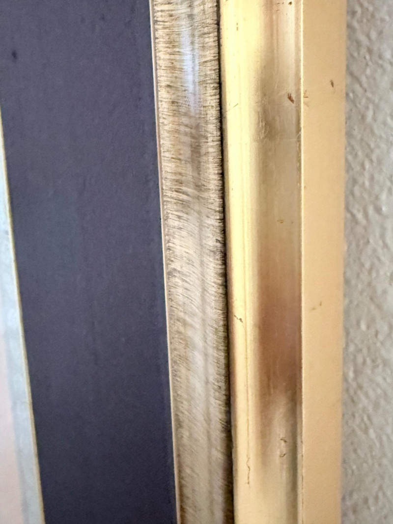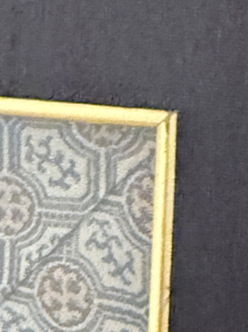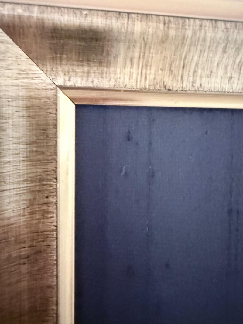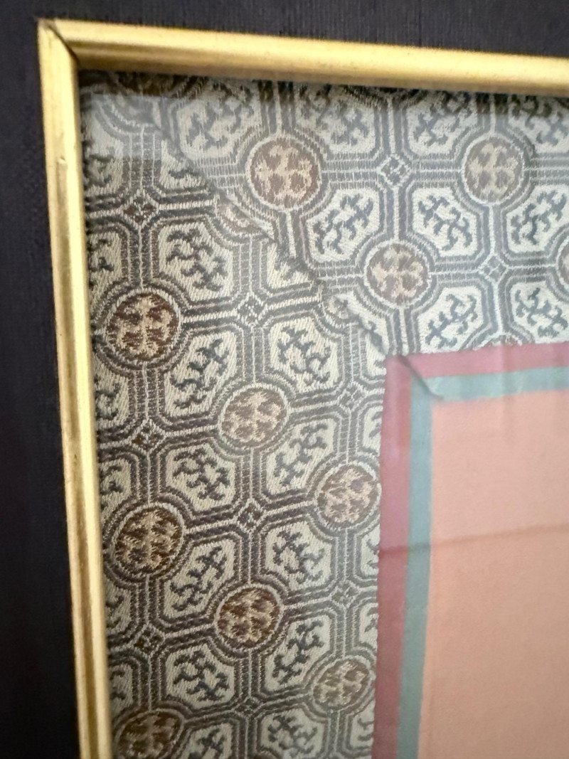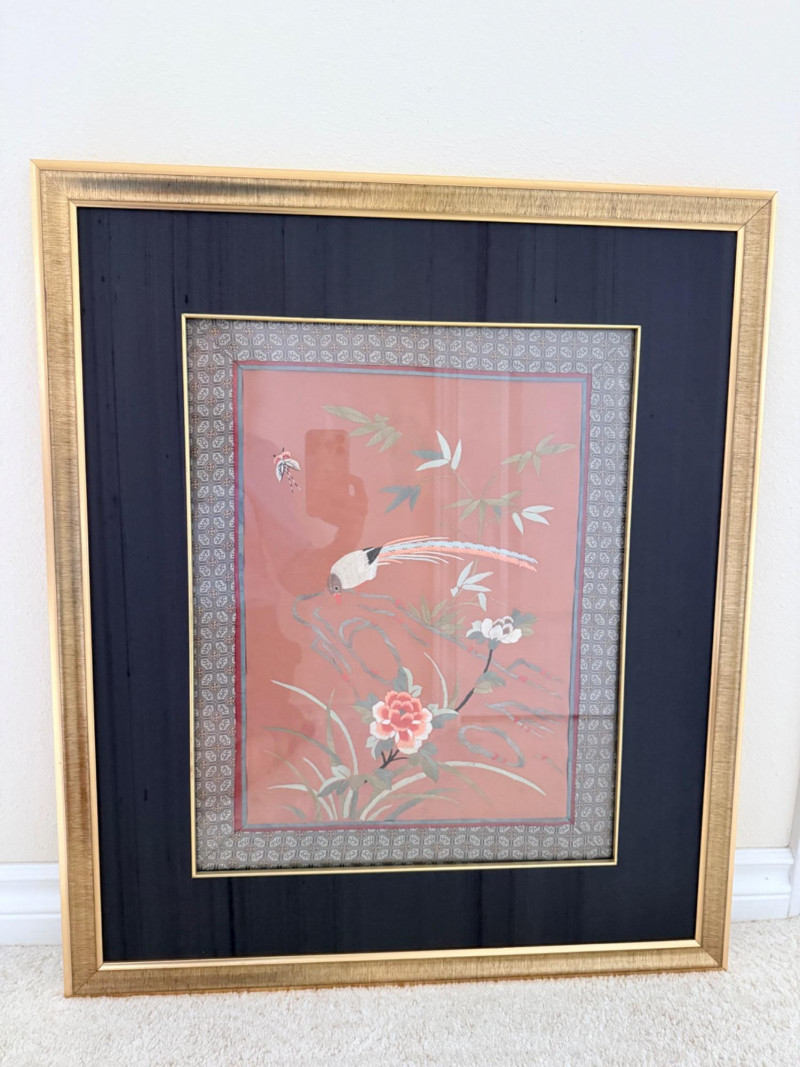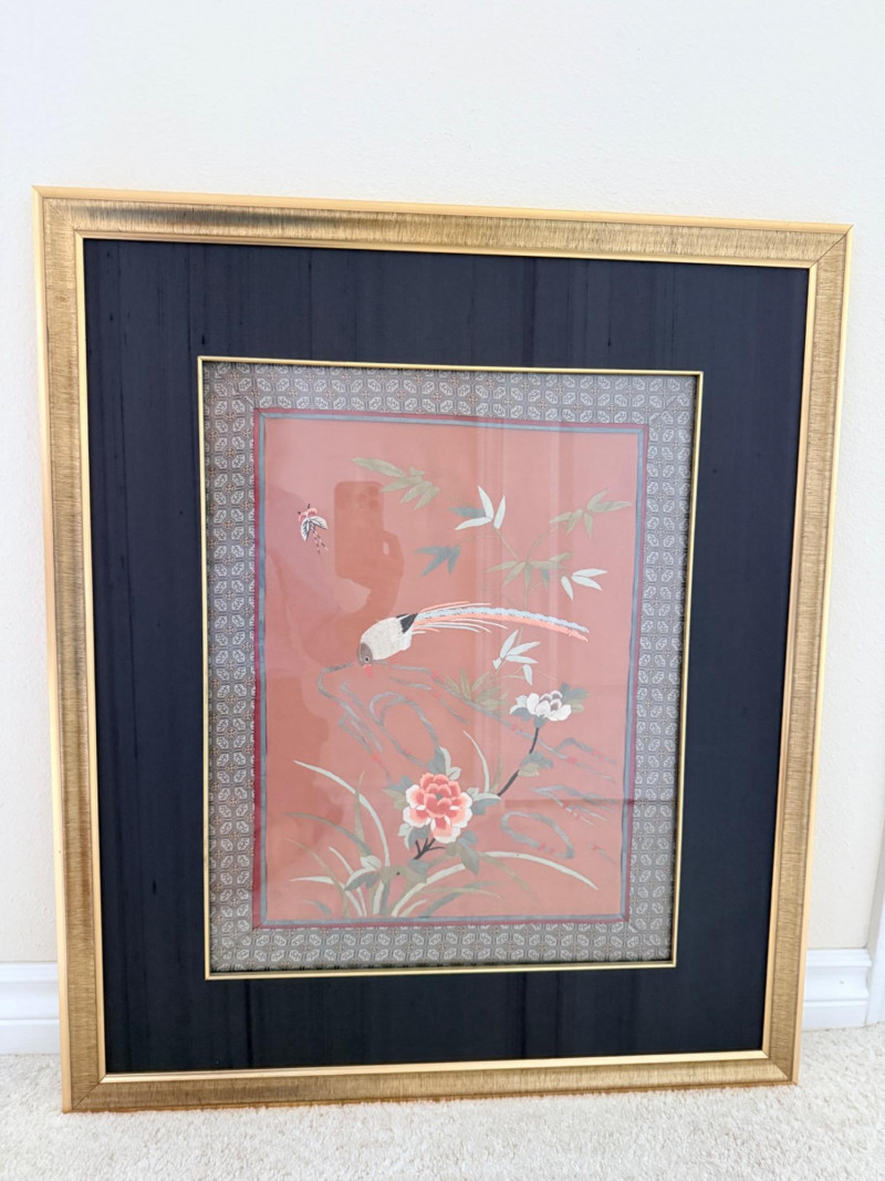 Chinese Framed Embroidered Silk Bird and Peonies Silk embroidery depicting a long-tailed bird perched on a branch, surrounded by peony blossoms and bamboo leaves. A small insect is positioned near the upper left. The embroidered panel is bordered with a geometric patterned textile and mounted on a dark silk mat with a gold-toned fillet. Framed in wood with a metallic finish and paper backing. Dimensions: 24.75 in W x 28.25 in H