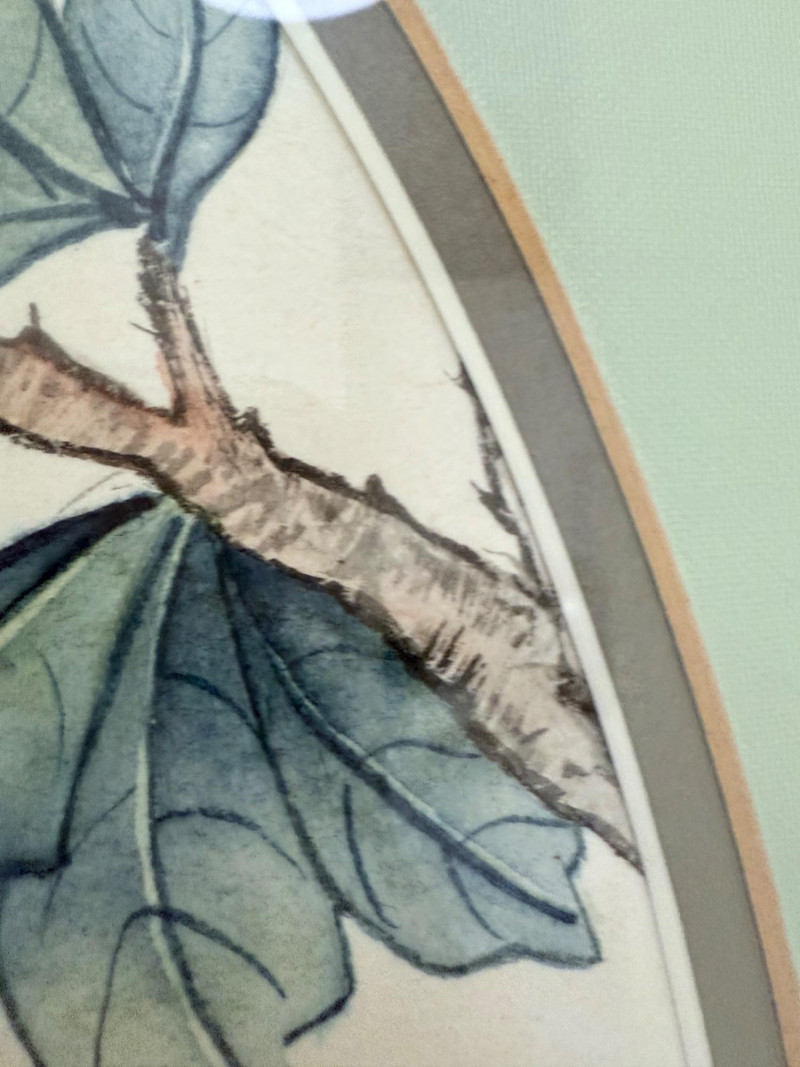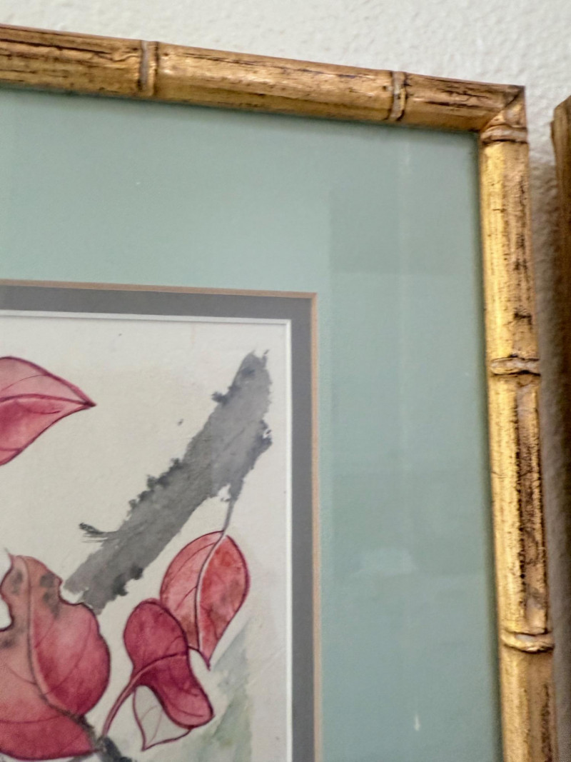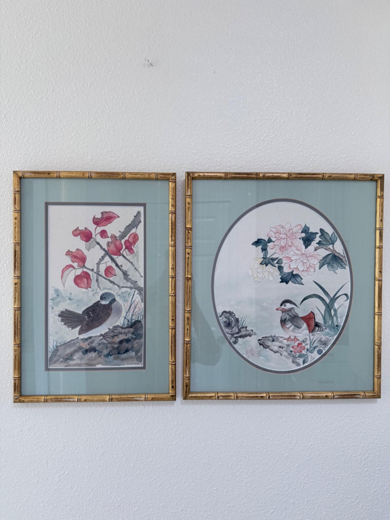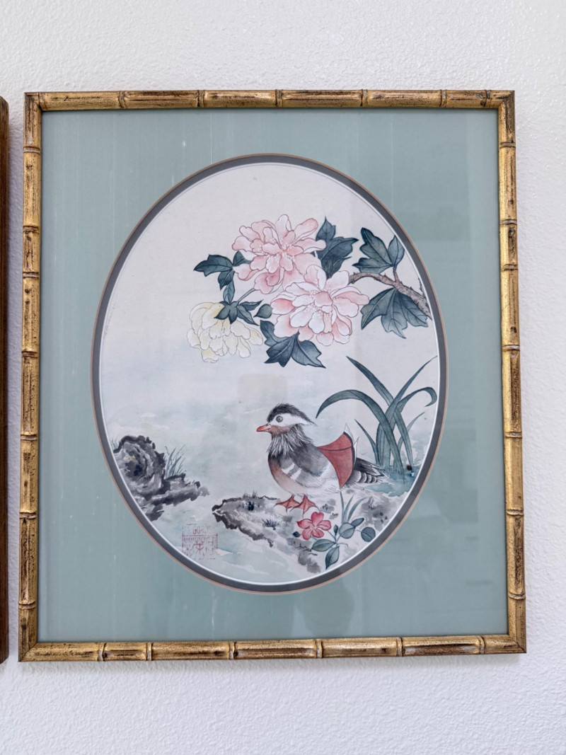 Pair of Framed Chinese Bird and Flower Watercolor Paintings A pair of watercolor paintings featuring birds perched among flowering branches and natural rock formations. One piece presents a circular composition with two birds beneath blooming peonies, while the other features a vertical format with a single bird beside twisting foliage and leaves. Both works include calligraphic seals. The paintings are framed under glass with bamboo-style gilt frames and light green mats, one with an oval window and the other with a rectangular opening. Dimensions: