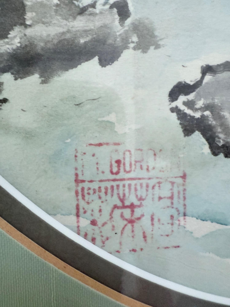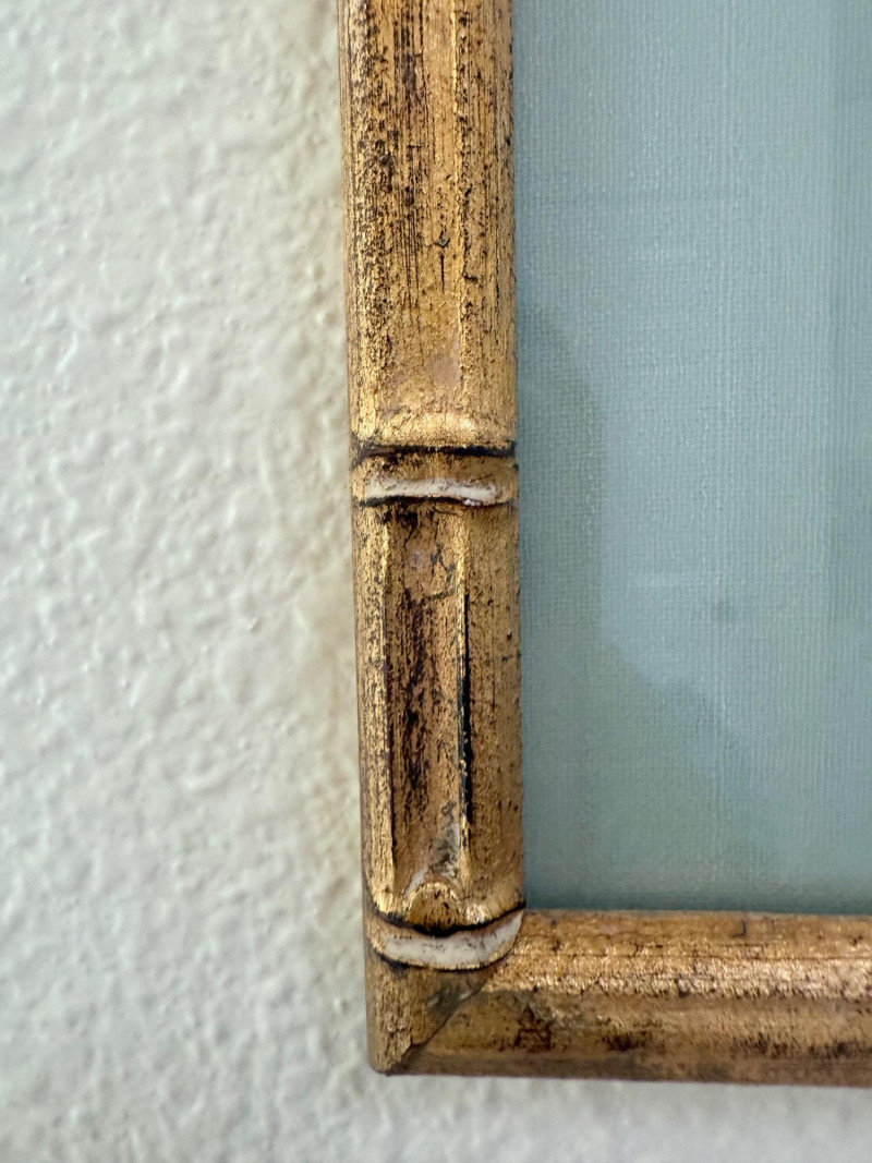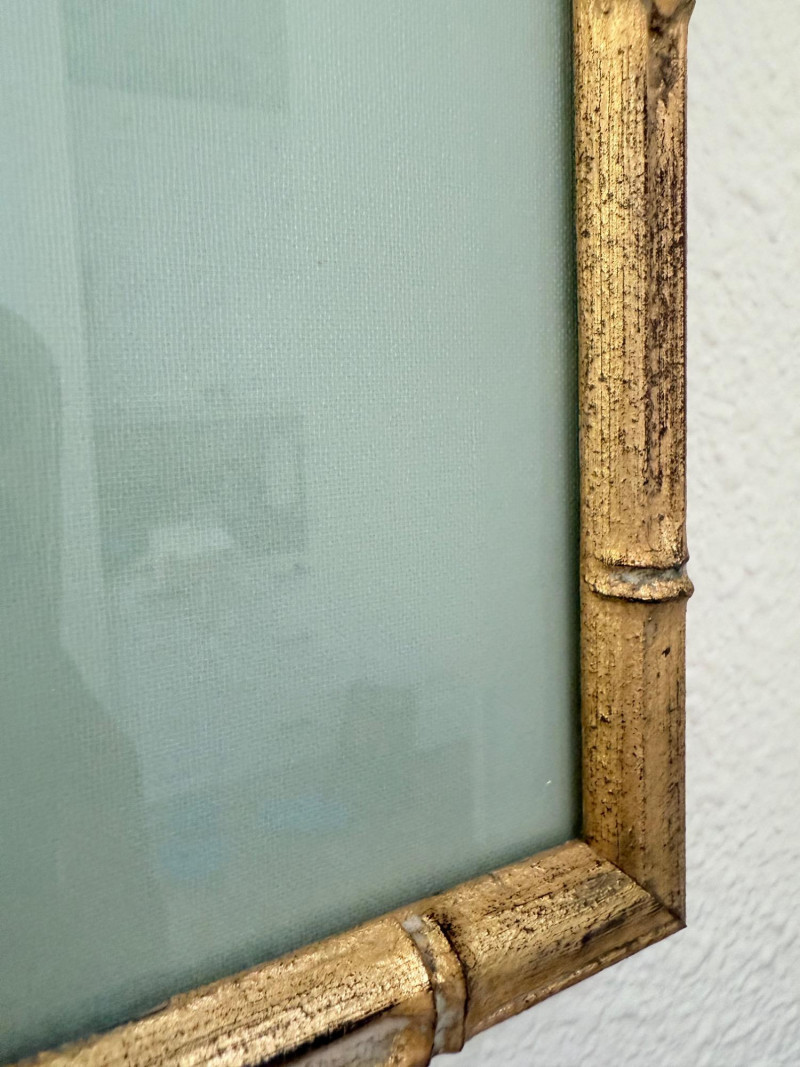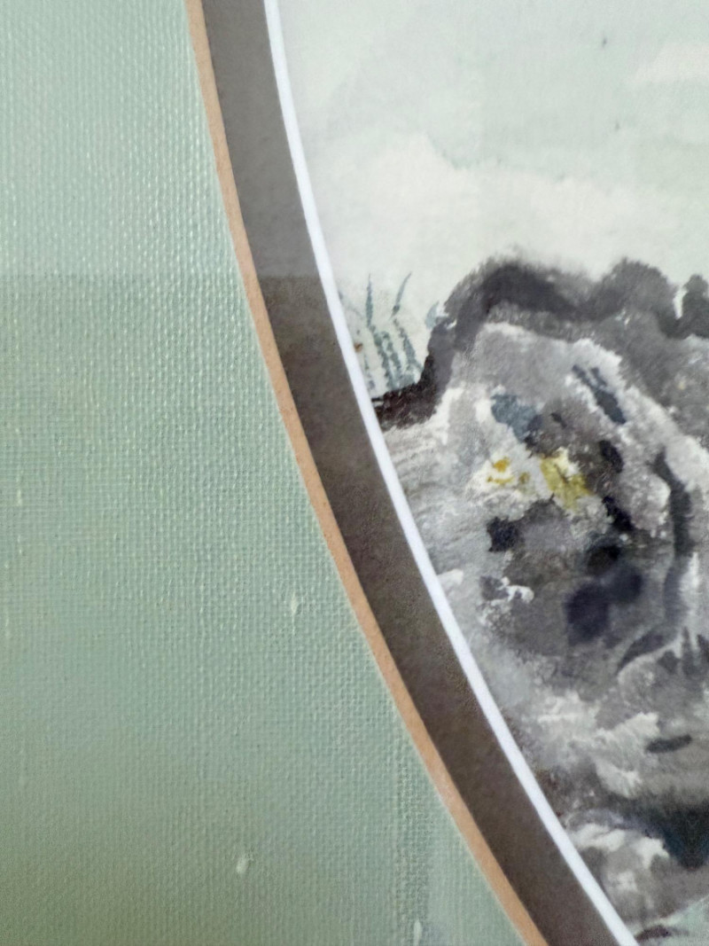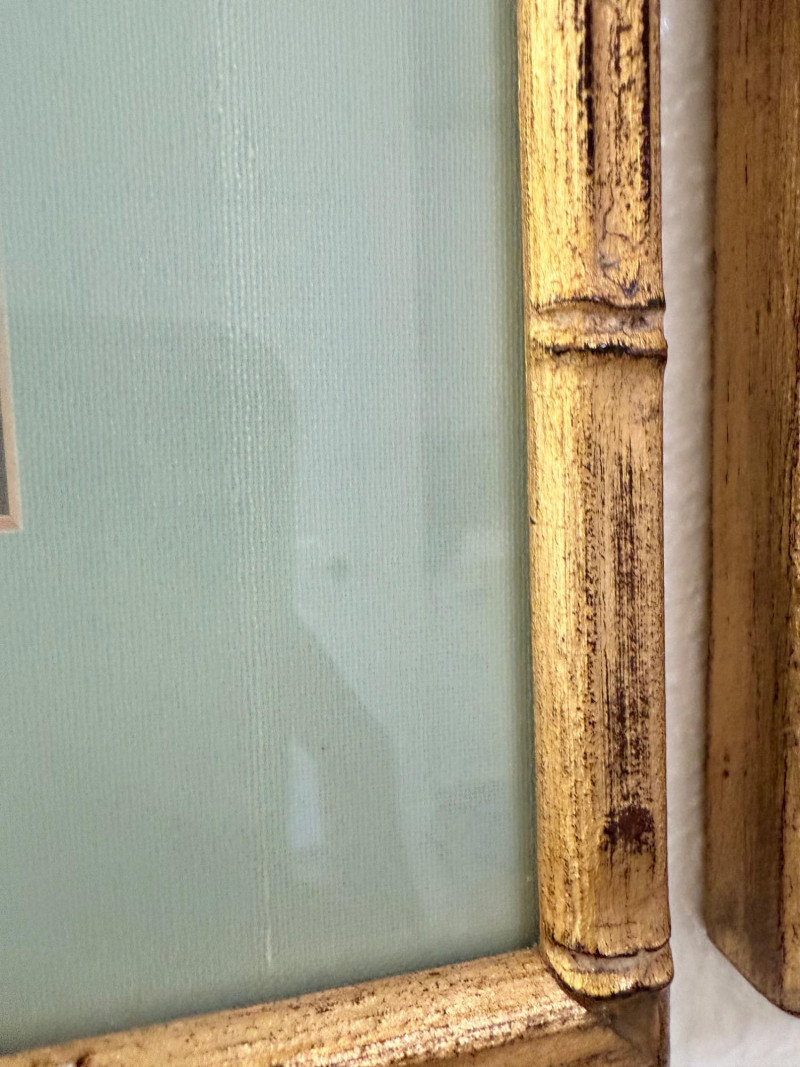 Pair of Framed Chinese Bird and Flower Watercolor Paintings A pair of watercolor paintings featuring birds perched among flowering branches and natural rock formations. One piece presents a circular composition with two birds beneath blooming peonies, while the other features a vertical format with a single bird beside twisting foliage and leaves. Both works include calligraphic seals. The paintings are framed under glass with bamboo-style gilt frames and light green mats, one with an oval window and the other with a rectangular opening. Dimensions: