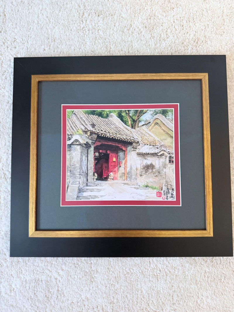 Watercolor of Traditional Chinese Courtyard Gate A watercolor painting depicting a traditional Chinese courtyard gate with tiled rooftops, gray brick walls, and a red wooden entrance flanked by stone lion figures. The architecture shows layered rooflines and surrounding alley walls, with partial views of trees in the background. Artist's calligraphy and red stamps appear in the lower right. The painting is double-matted in black and red and set in a wood frame. Dimensions: 16.5" W x 15.25" H (frame)