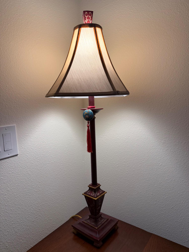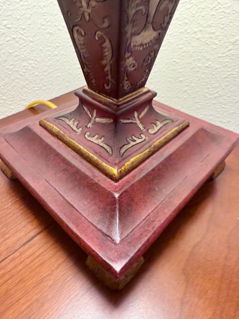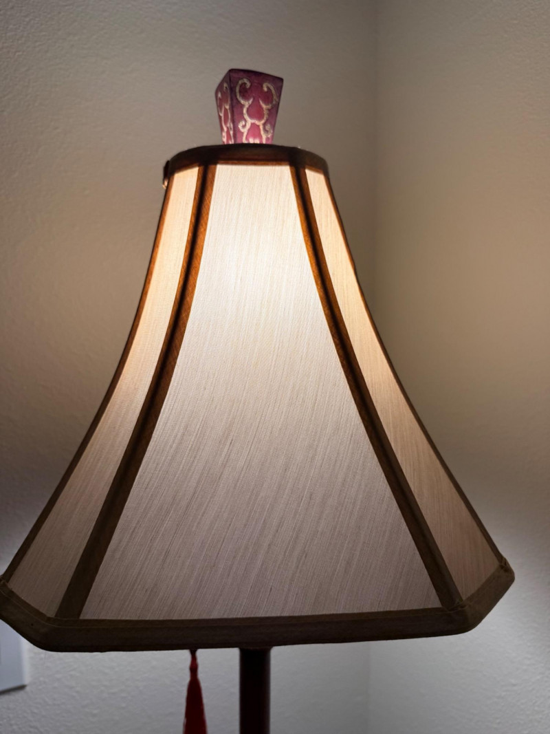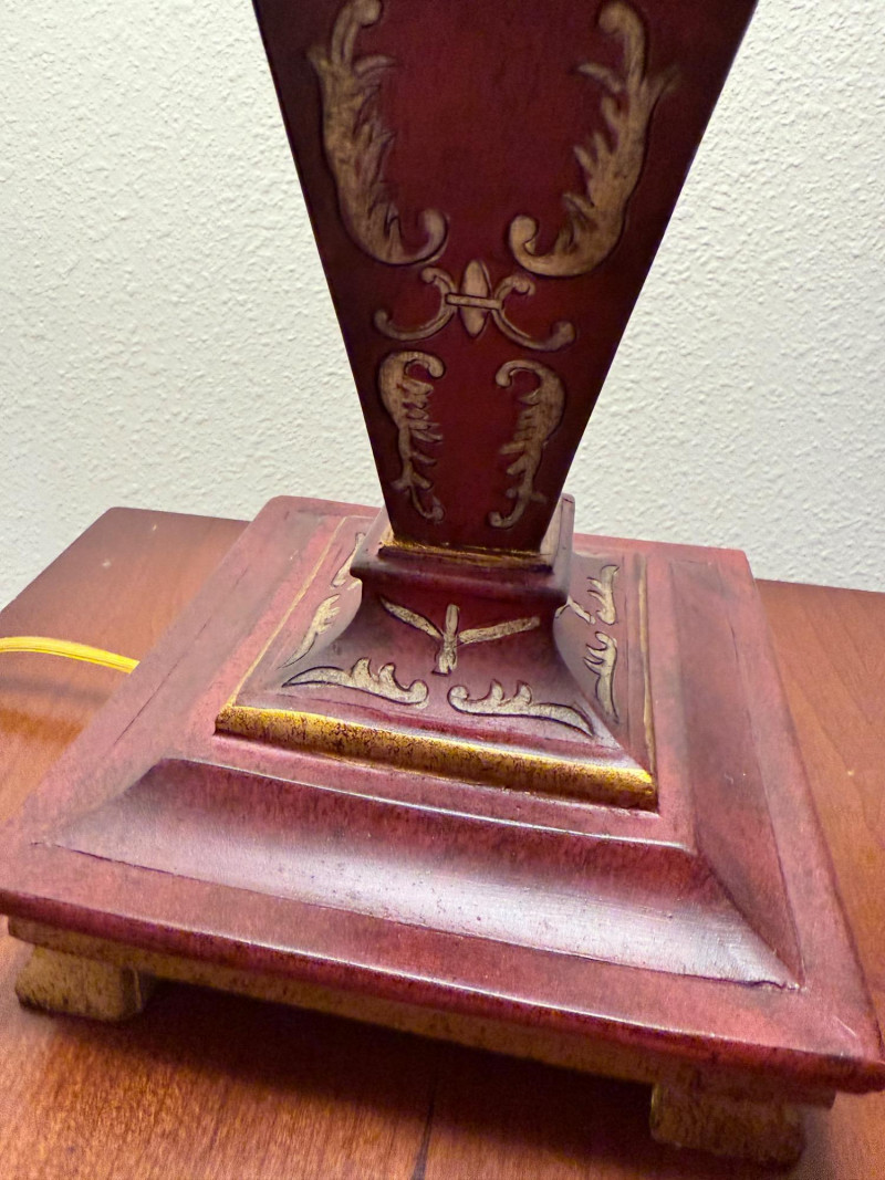 Wooden Table Lamp with Cloisonné Ornament A tall wooden table lamp with a flared square base and tapered body, decorated with gold scrollwork on all sides. A round platform at the upper stem supports a hanging cloisonné orb with floral motifs and a red tassel. The finial features matching scroll patterns. The lamp is fitted with a flared fabric shade that emits soft, diffused light. Dimensions: