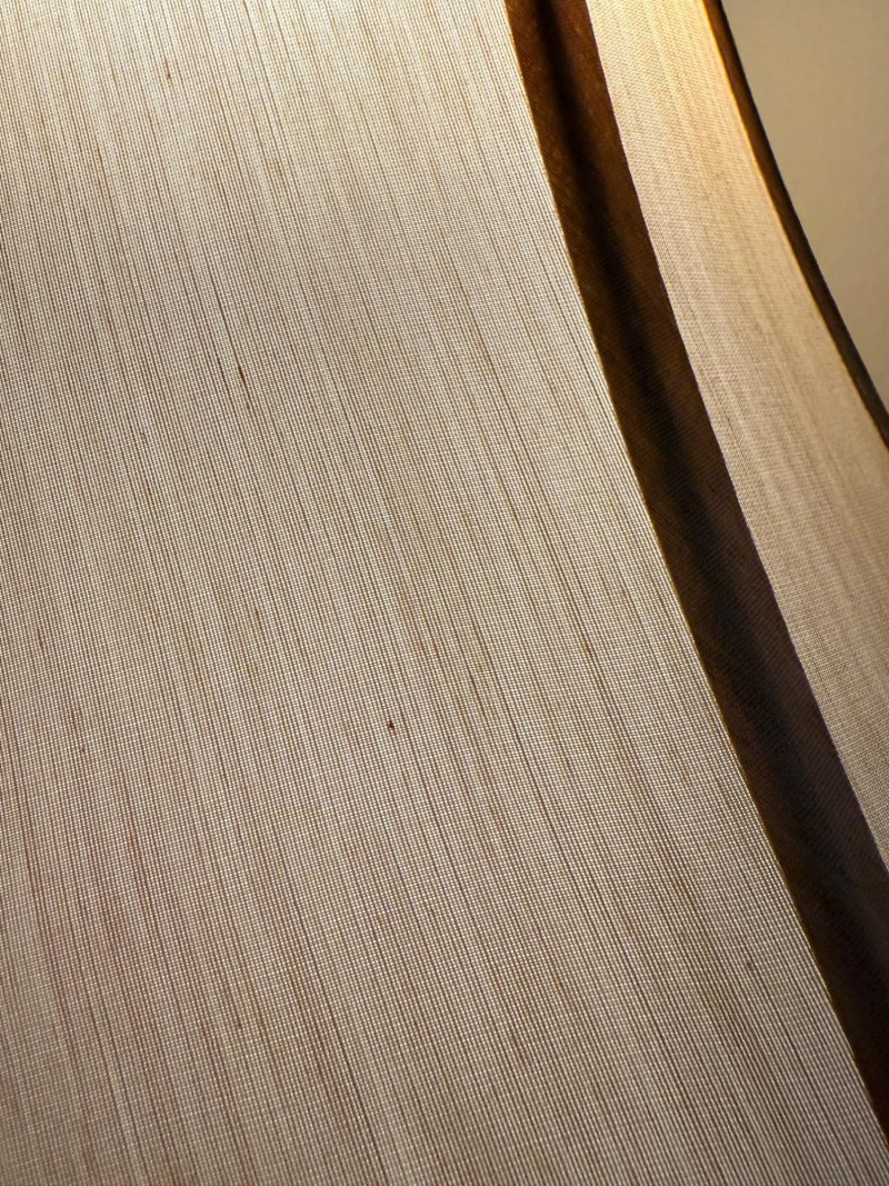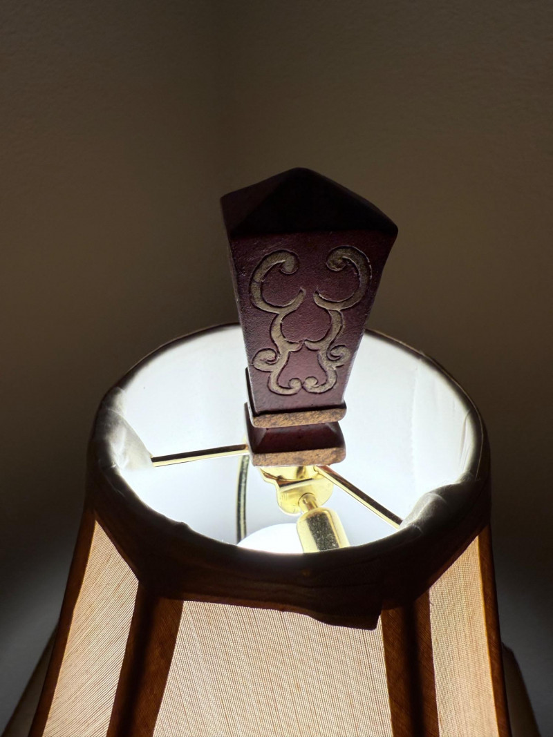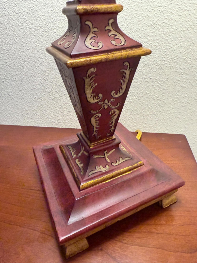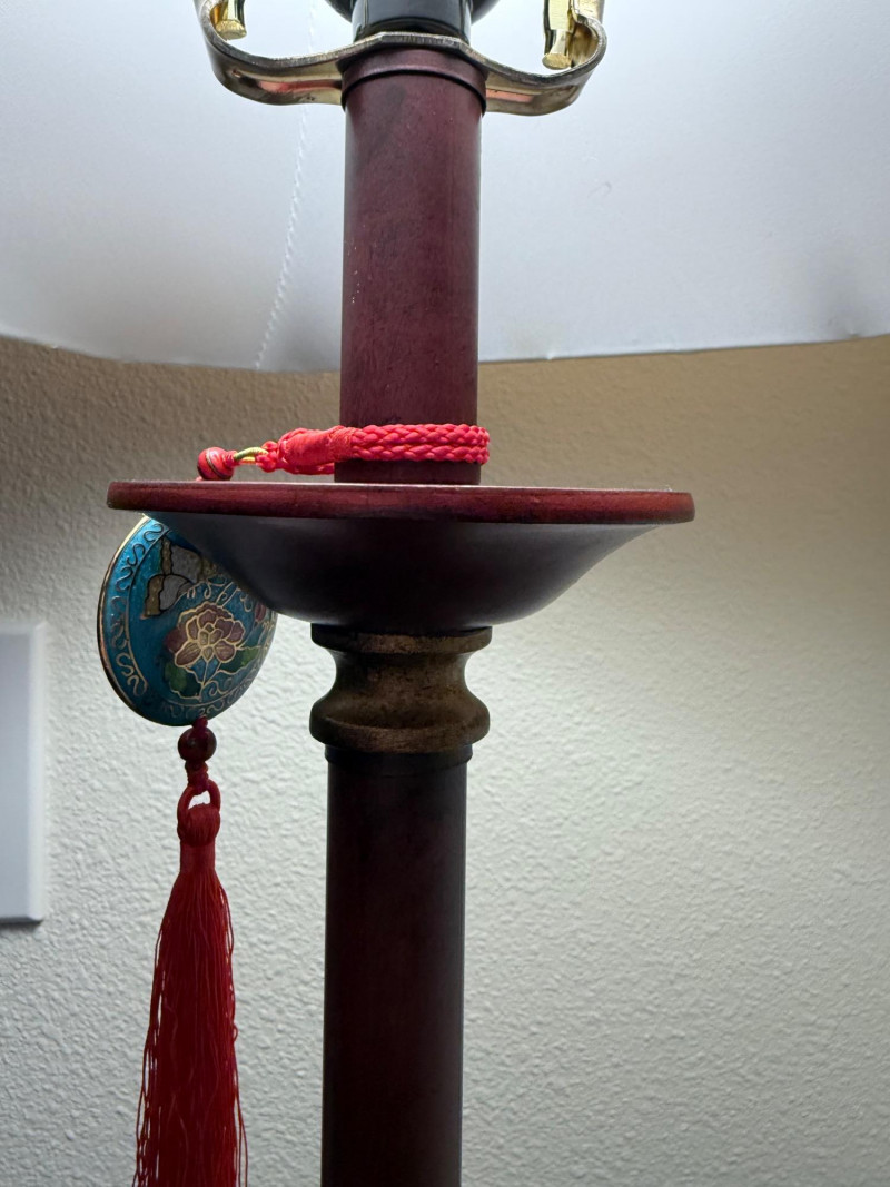 Wooden Table Lamp with Cloisonné Ornament A tall wooden table lamp with a flared square base and tapered body, decorated with gold scrollwork on all sides. A round platform at the upper stem supports a hanging cloisonné orb with floral motifs and a red tassel. The finial features matching scroll patterns. The lamp is fitted with a flared fabric shade that emits soft, diffused light. Dimensions: