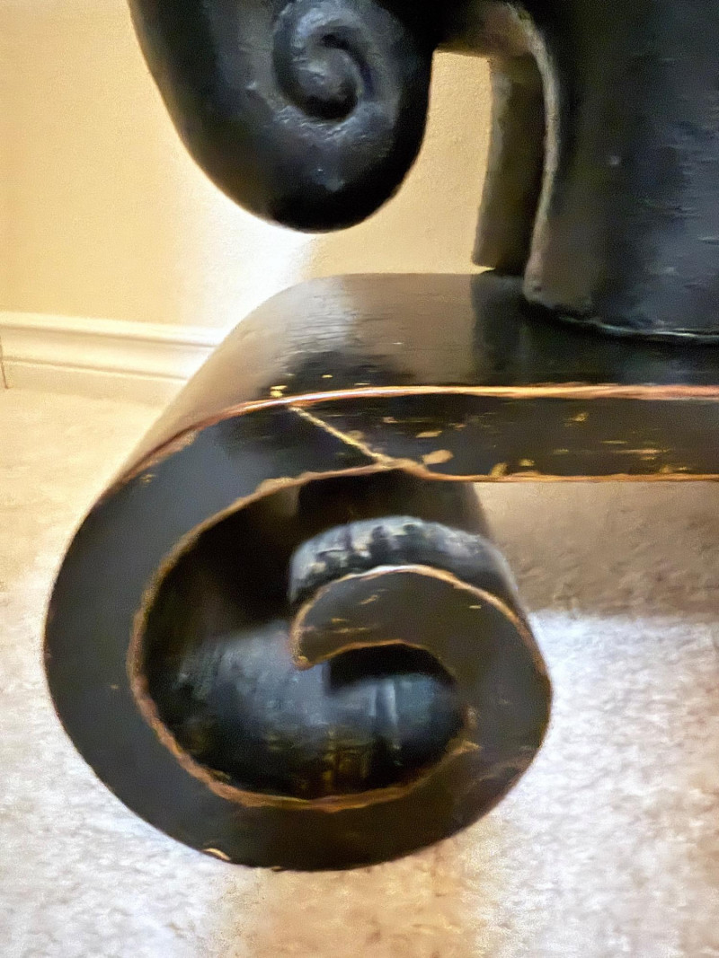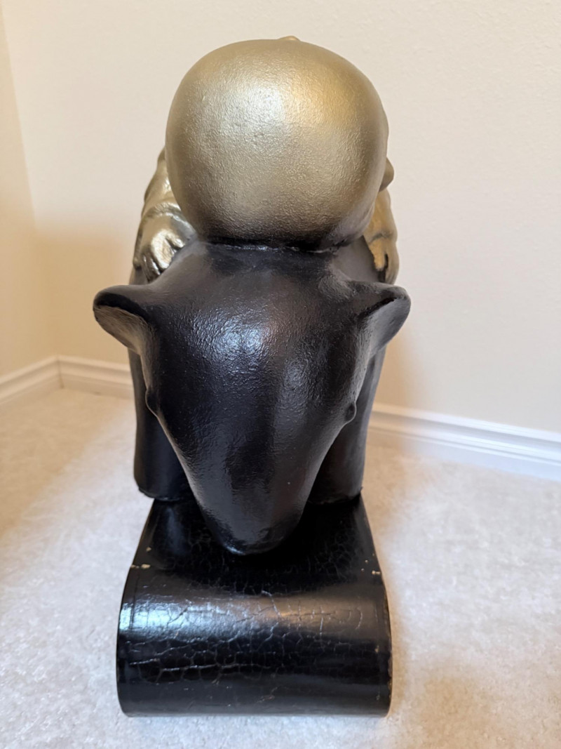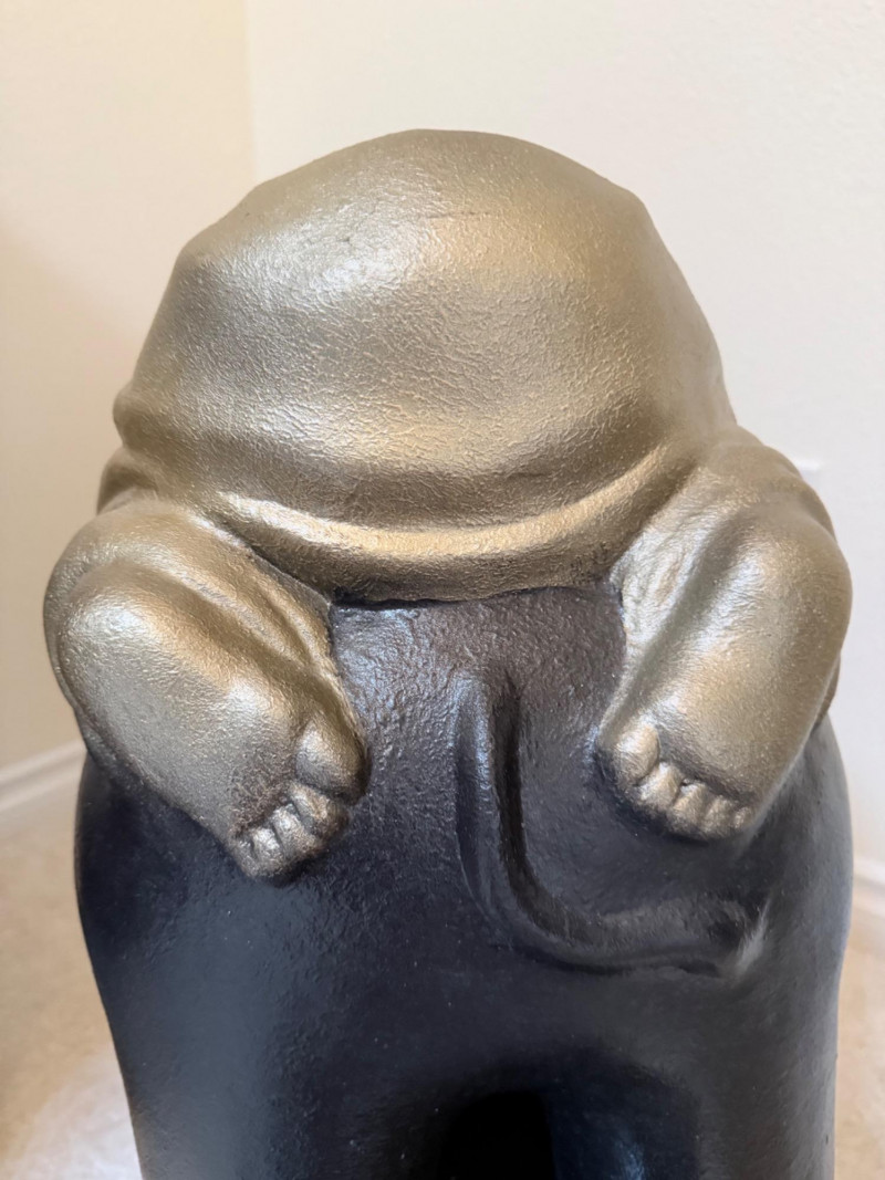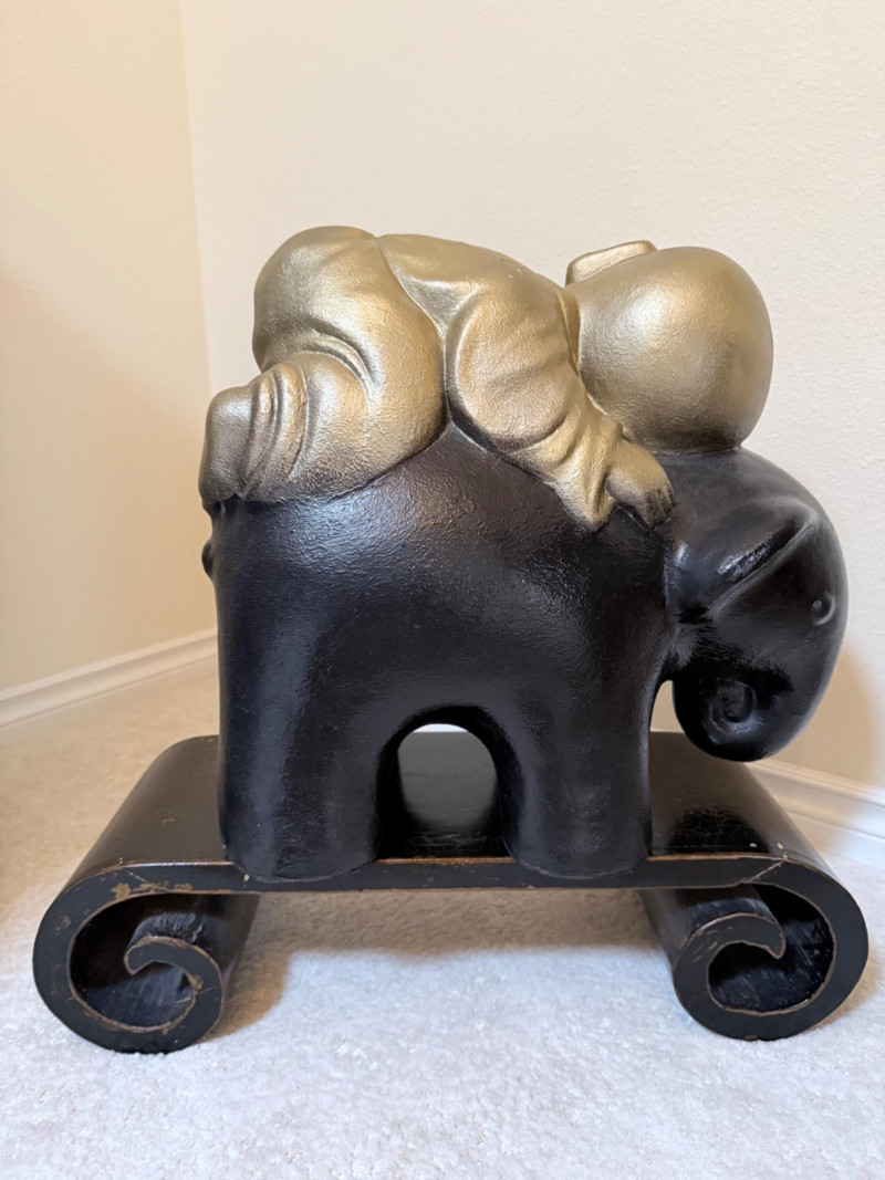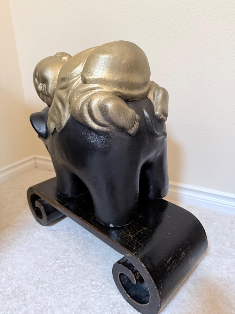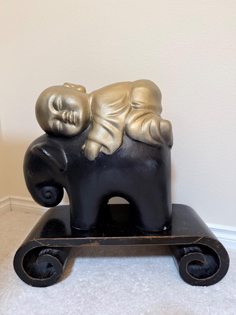 Shaolin Monk on Elephant Sculpture with Wooden Base A sculptural piece showing a reclining monk figure on the back of a stylized elephant. The figure rests with eyes closed and one arm draped forward. The elephant form features a curled trunk and arched legs. Both are finished in contrasting tones. The sculpture is mounted on a separate wooden stand with curled ends and surface wear along the edges. Dimensions: