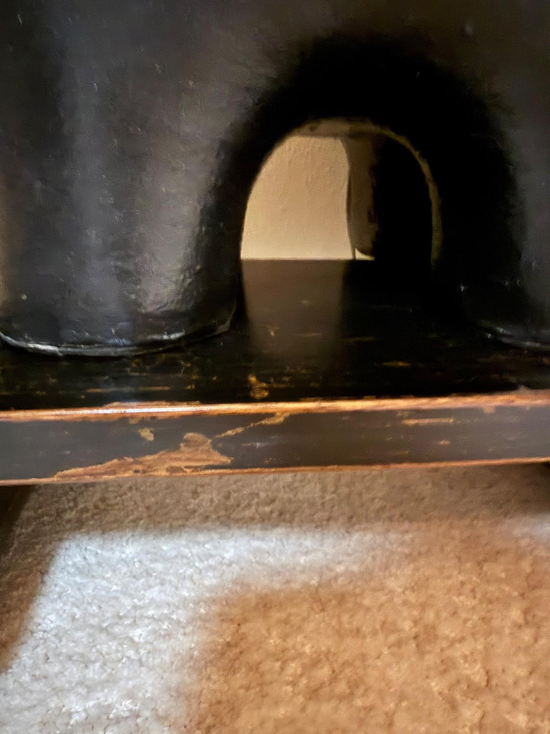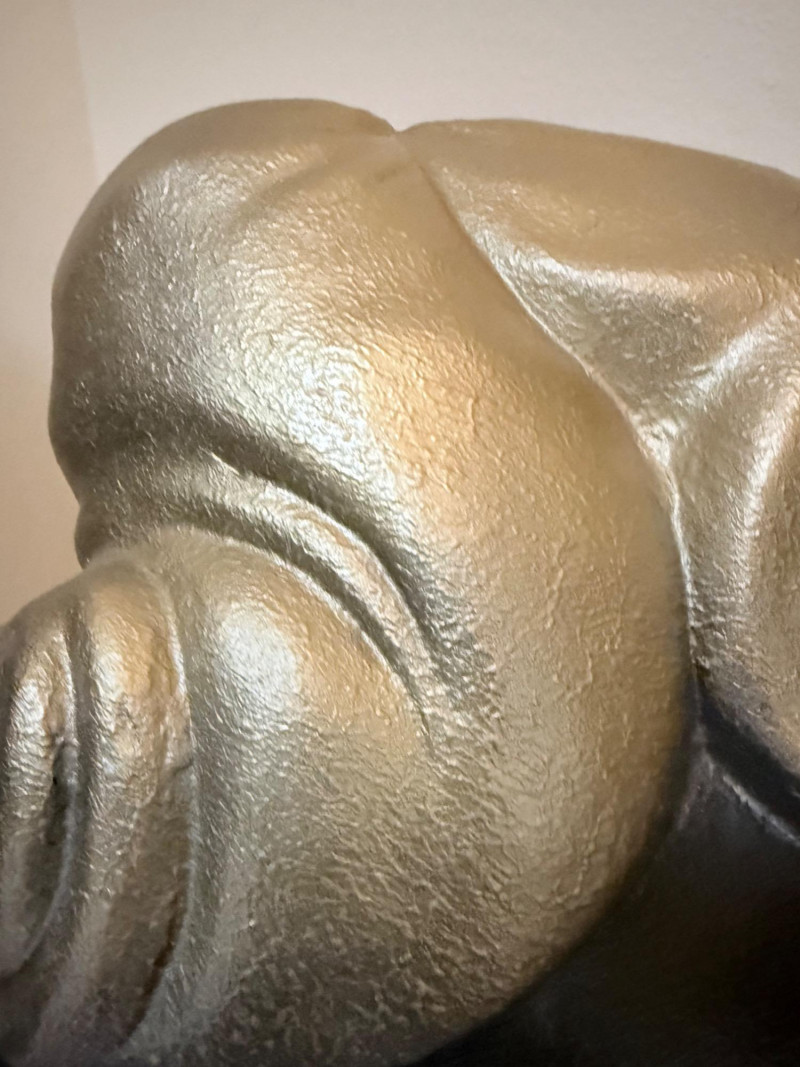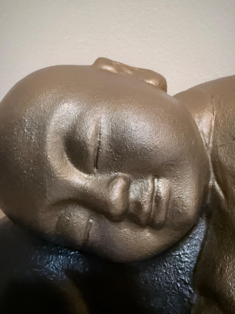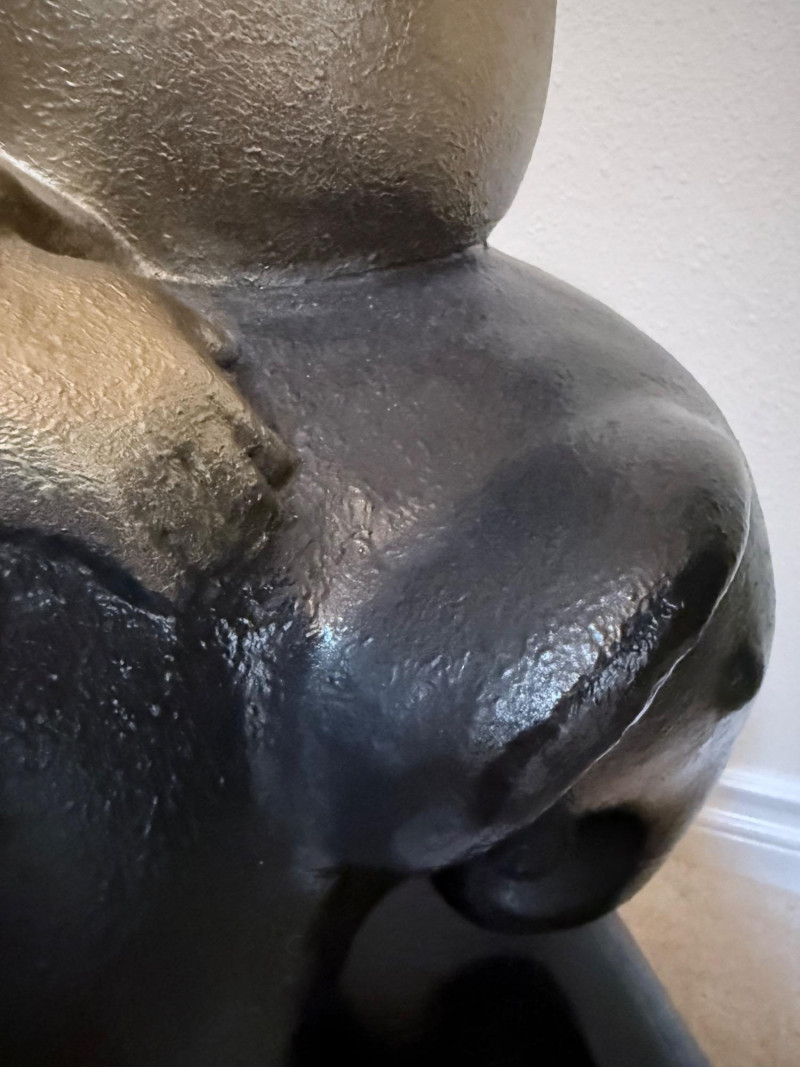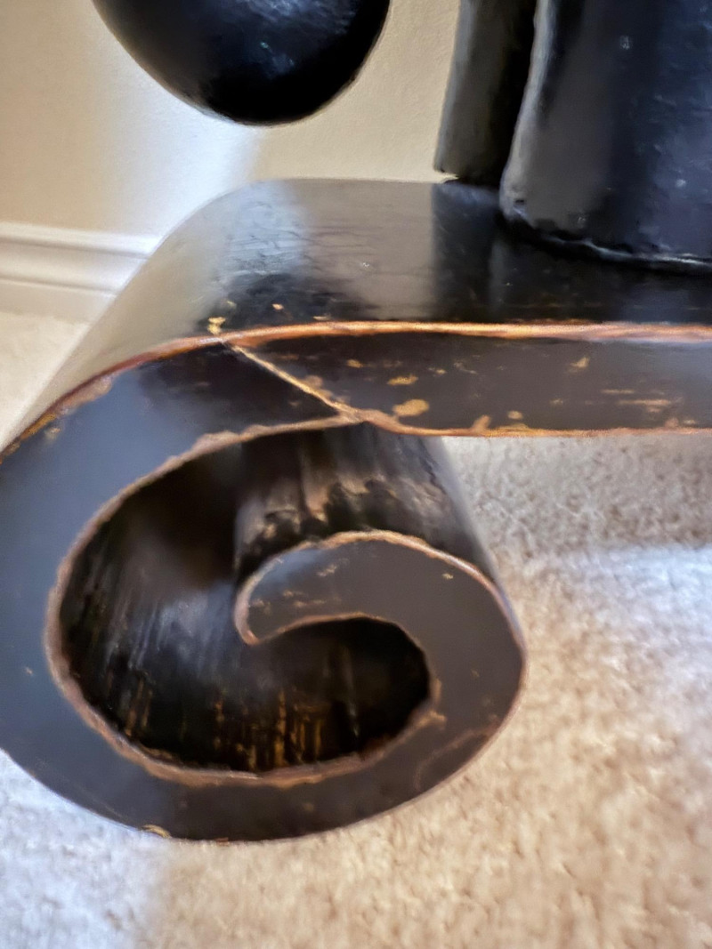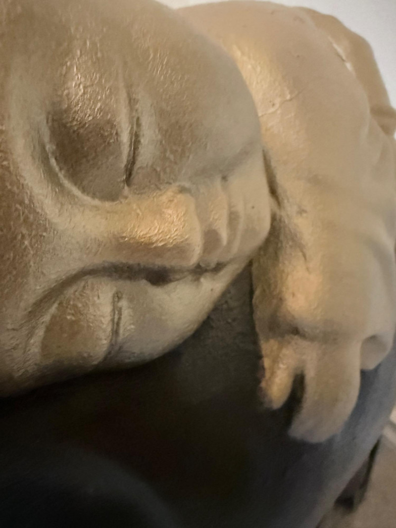 Shaolin Monk on Elephant Sculpture with Wooden Base A sculptural piece showing a reclining monk figure on the back of a stylized elephant. The figure rests with eyes closed and one arm draped forward. The elephant form features a curled trunk and arched legs. Both are finished in contrasting tones. The sculpture is mounted on a separate wooden stand with curled ends and surface wear along the edges. Dimensions: