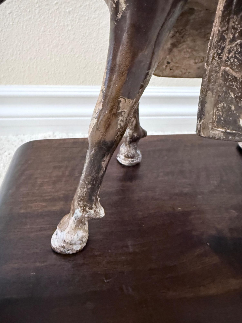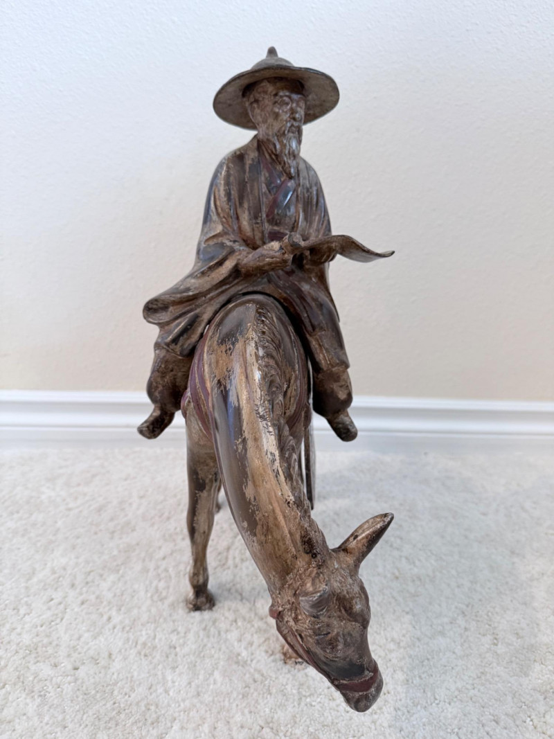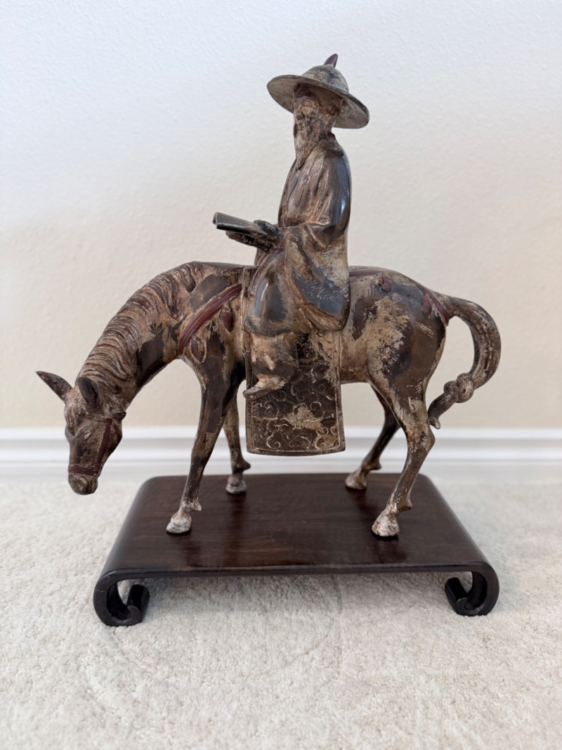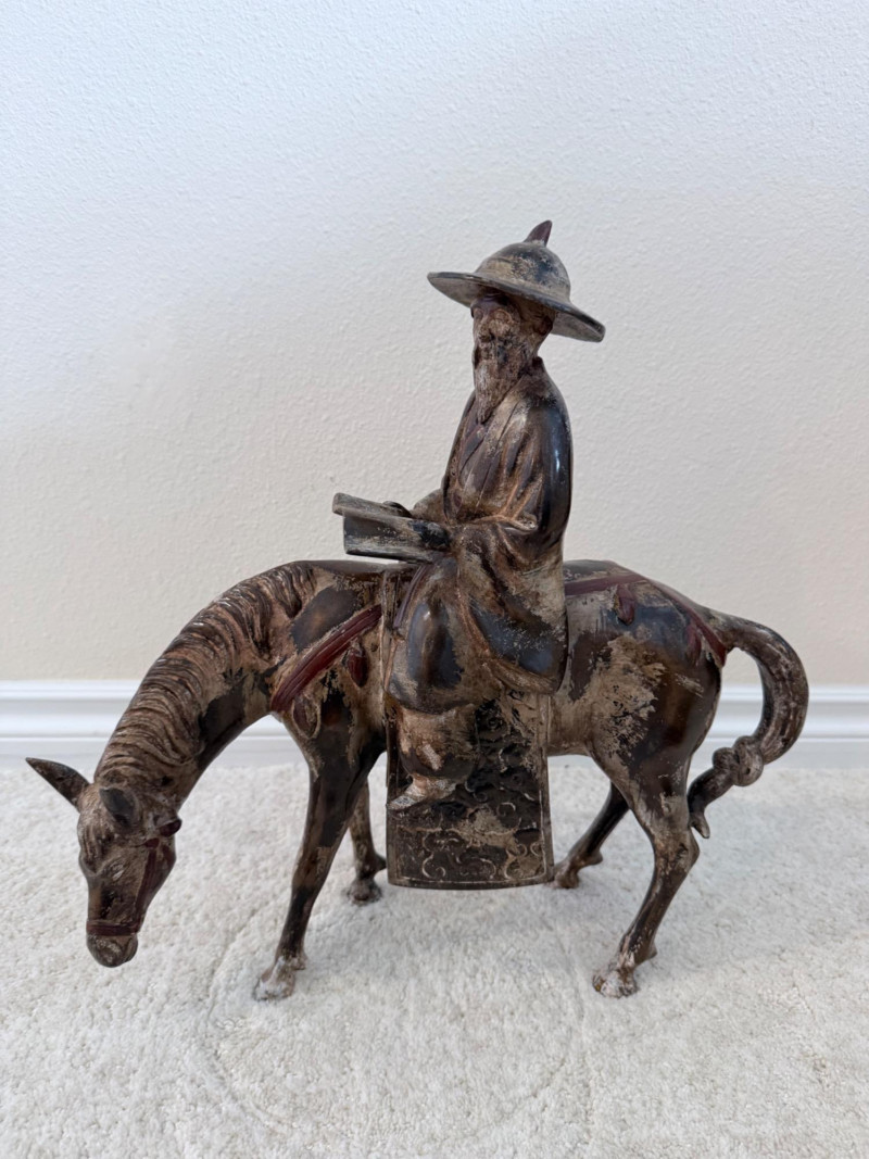 Vintage Chinese Metal Sculpture Figure on Horseback with Scroll Metal sculpture depicting a robed figure seated side-saddle on a horse, holding an open scroll. The figure wears a wide-brimmed hat and rests both feet on a platform beneath the robe. The horse is shown with head lowered and tail curled, with visible saddle and harness details. The figure and horse are separate components and are displayed on a wooden stand with curled feet. Dimensions: