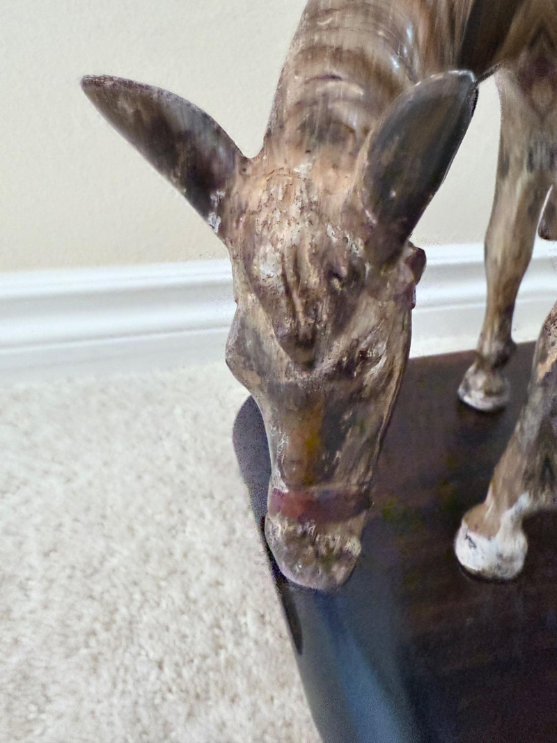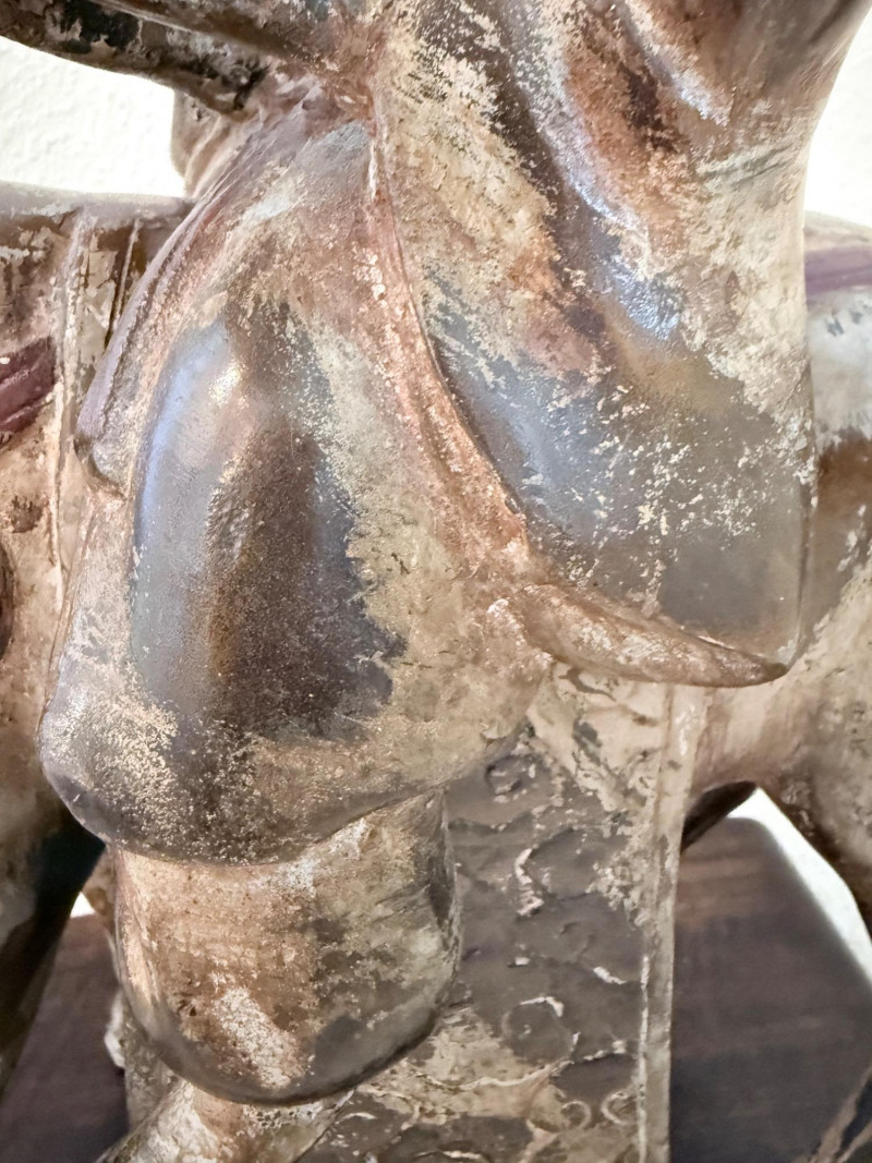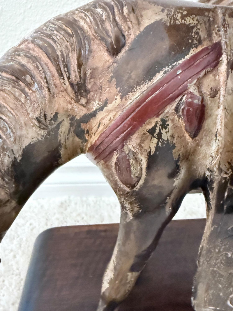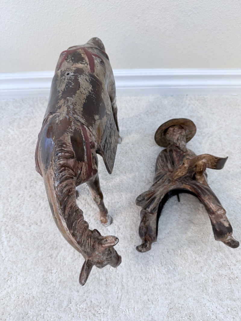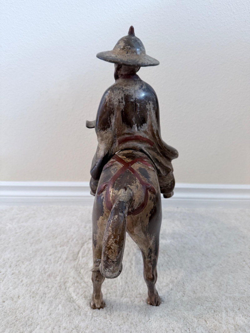 Vintage Chinese Metal Sculpture Figure on Horseback with Scroll Metal sculpture depicting a robed figure seated side-saddle on a horse, holding an open scroll. The figure wears a wide-brimmed hat and rests both feet on a platform beneath the robe. The horse is shown with head lowered and tail curled, with visible saddle and harness details. The figure and horse are separate components and are displayed on a wooden stand with curled feet. Dimensions: