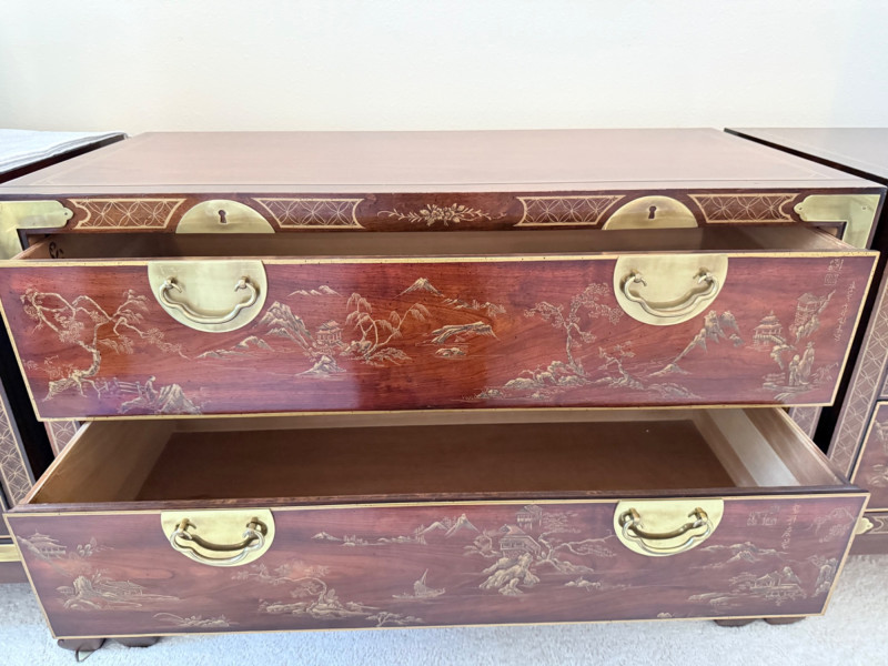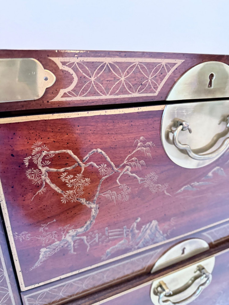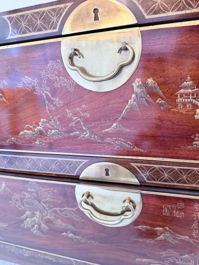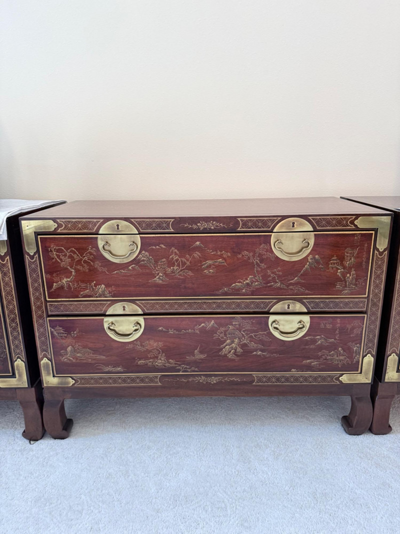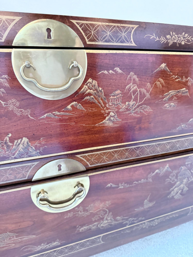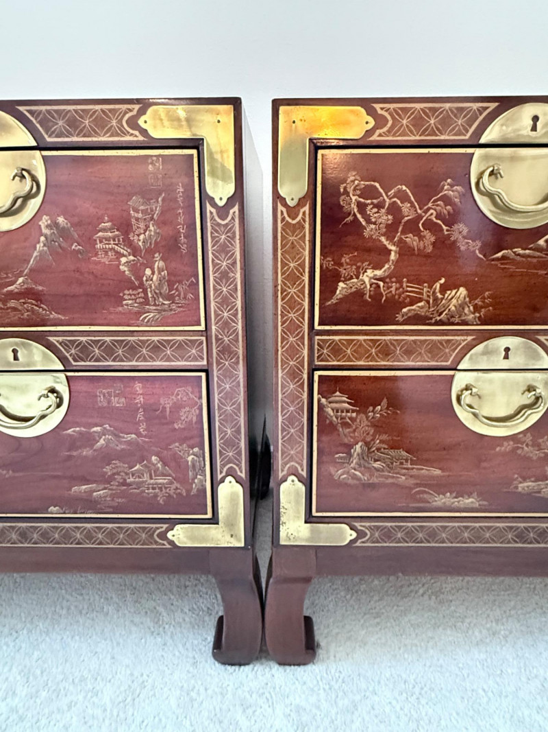 Pair of Vintage Korean Two-Drawer Chests A matching pair of two-drawer chests featuring etched landscape scenes across the drawer fronts. The designs depict architectural and mountain elements framed by geometric borders and brass corner plates. Each drawer includes circular backplates with drop handles and keyholes. The drawer boxes are joined with dovetail construction. The chests rest on shaped legs and show inlaid linework on the side panels. Dimensions (each):