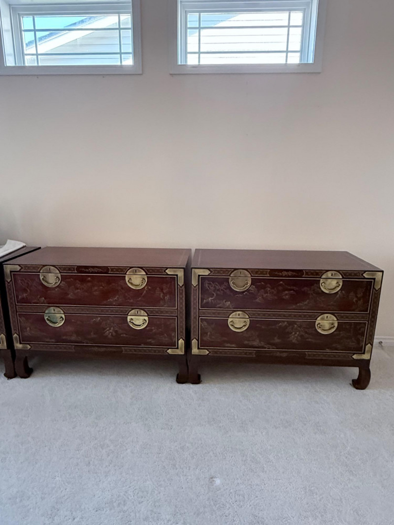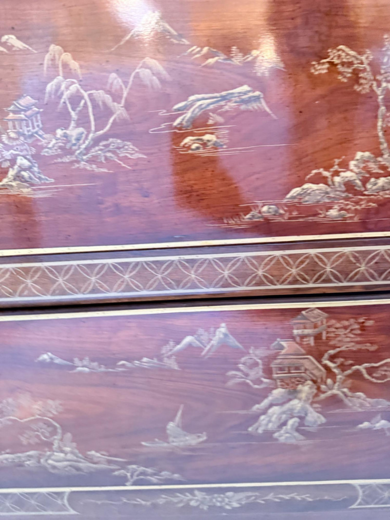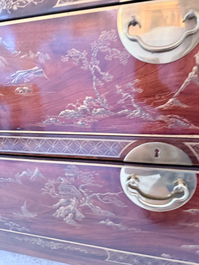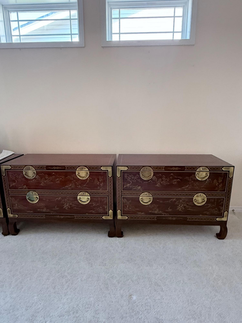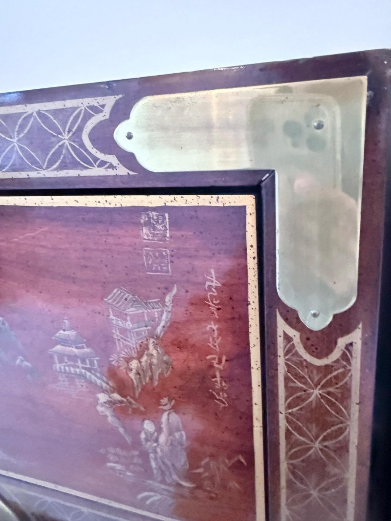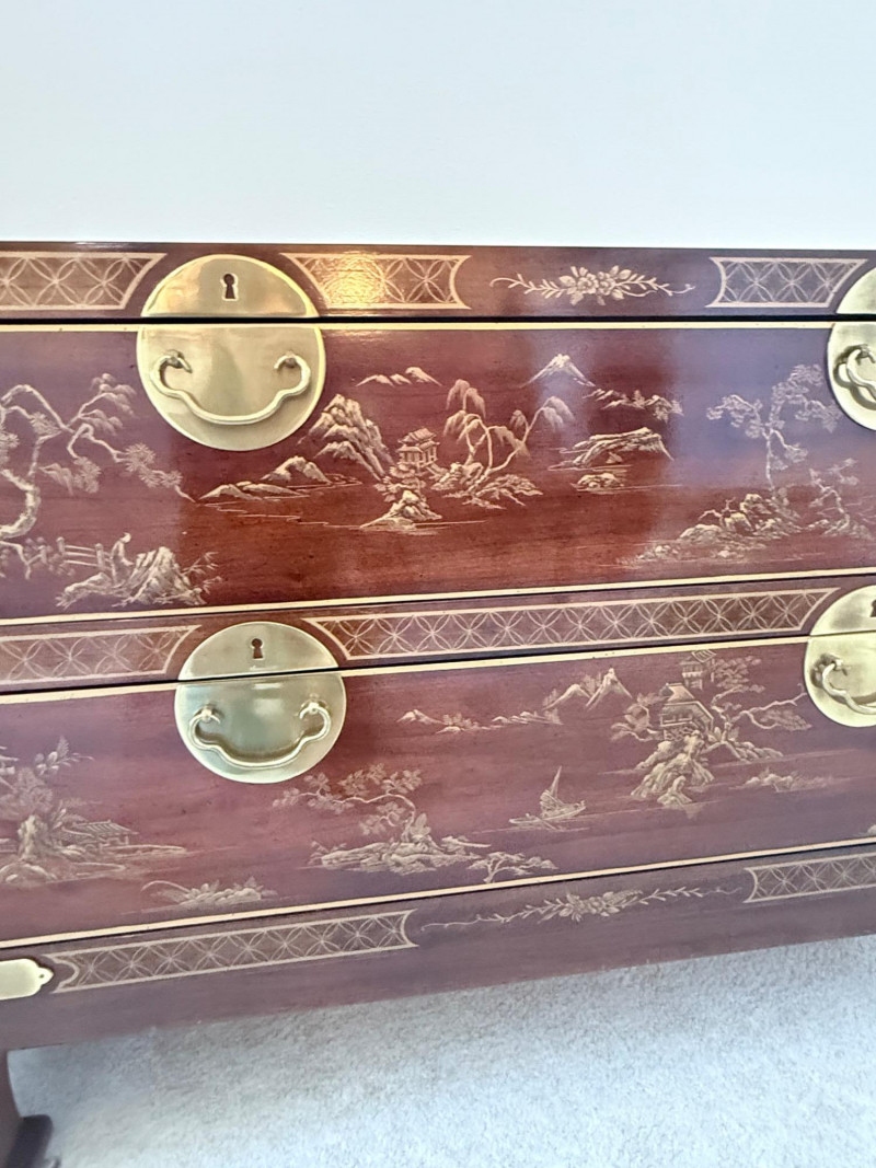 Pair of Vintage Korean Two-Drawer Chests A matching pair of two-drawer chests featuring etched landscape scenes across the drawer fronts. The designs depict architectural and mountain elements framed by geometric borders and brass corner plates. Each drawer includes circular backplates with drop handles and keyholes. The drawer boxes are joined with dovetail construction. The chests rest on shaped legs and show inlaid linework on the side panels. Dimensions (each):